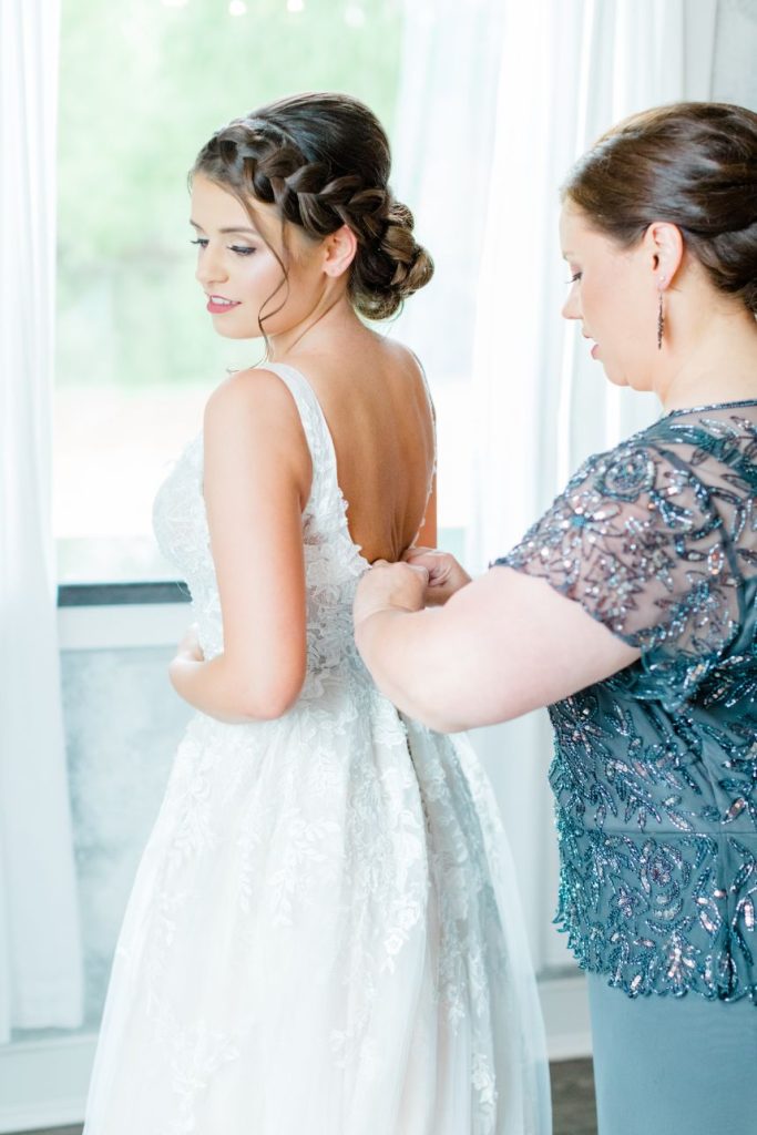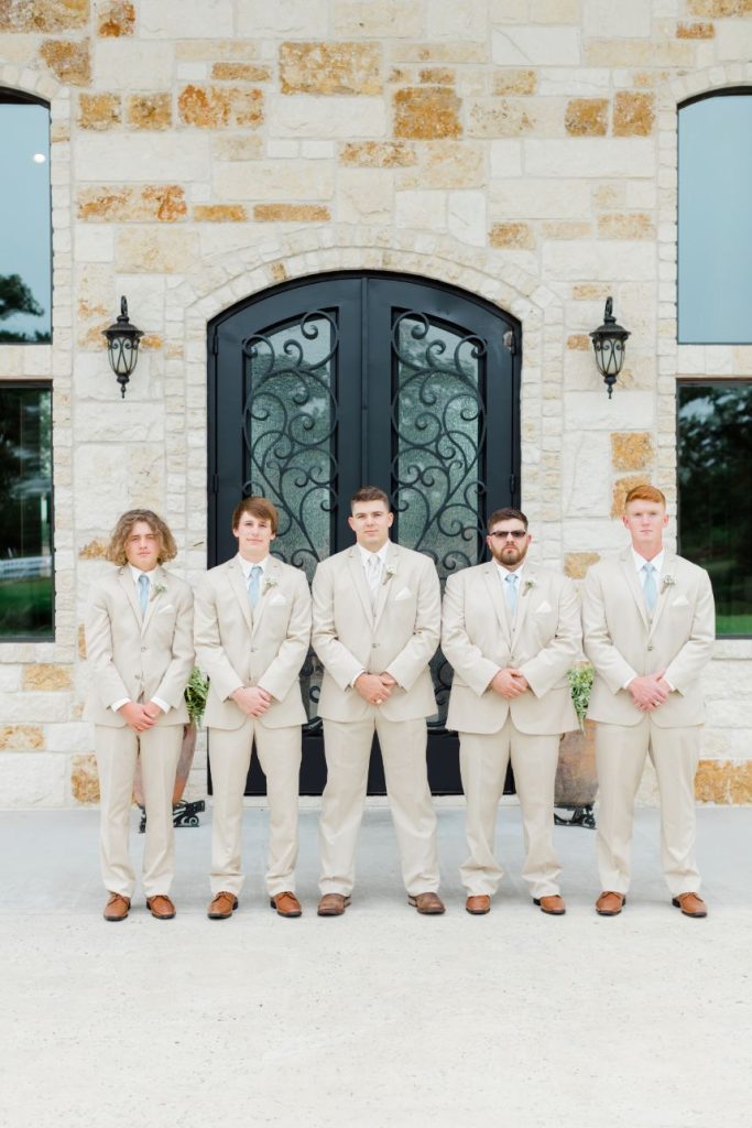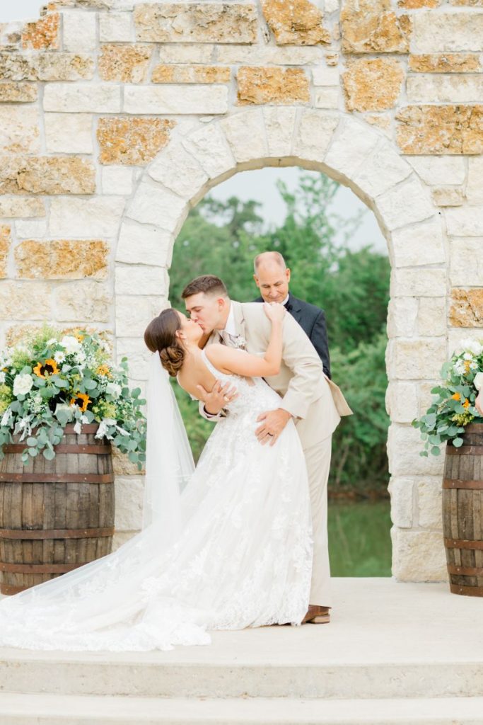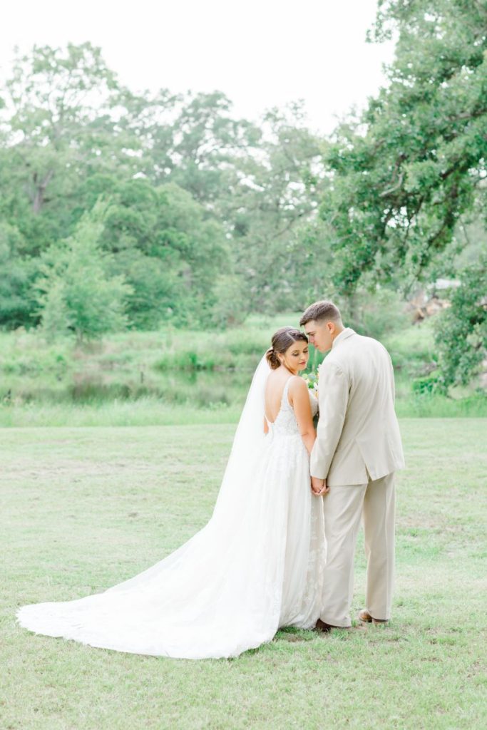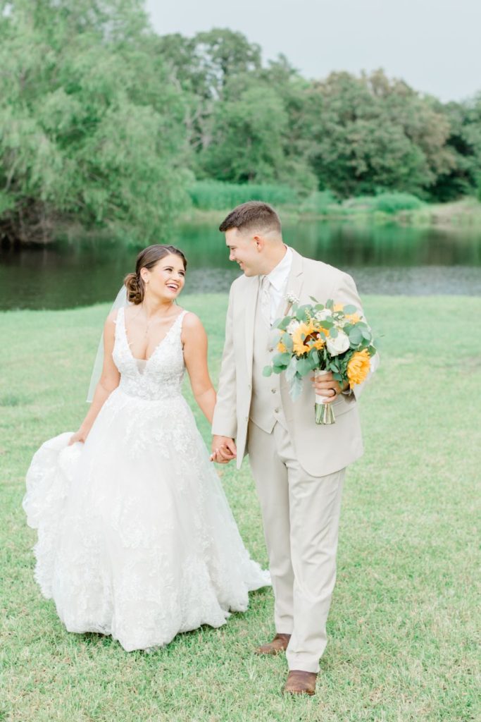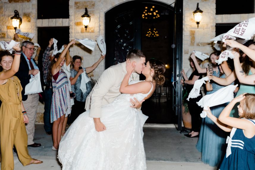 From the bride: “My husband and I got engaged on November 22, 2017, in front of Cinderella’s castle at Disney World. It was a real dream come true! We were both in college at the time and decided to hold off our wedding until 2020 to give ourselves more time to save up for our dream day. We found our venue and knew it was ‘the one’ right away. Our date was set for May 23, 2020! That was the day we counted down to for years. We held our hope as long as we could but ultimately we had to make the decision to postpone our big day due to COVID. That was the hardest choice we have ever had to make together. Our lovely vendors made the change as seamless as possible and I can’t thank them enough for that. We made the choice to get legally married on May 23rd. I literally found the dress I wore the night before our wedding. We held the ceremony at the gardens on Texas A&M’s campus and only had immediate family and Westy there. Although we got married that day, we decided to keep it a secret. We still haven’t mentioned it to people unless they ask. To us, that date was THE DATE and will always be our wedding date but it was not the wedding we wanted to have. We held our second big day on June 26th. With everything going on, it still felt so surreal to marry my husband (again). All of our vendors worked with us and made that day absolutely perfect. It was definitely worth the wait. And hey, we didn’t have to worry about getting the marriage license signed or forgetting it. I also get to say that my husband loves me so much he married me twice!”