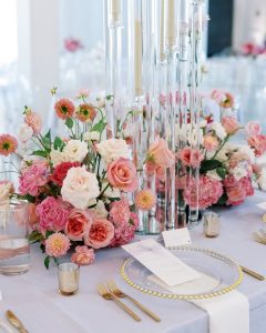 At the very minimum, you’ll want to invest in bouquets for you and your bridesmaids, boutonnieres, corsages and perhaps an accent piece for the altar. Beyond that, you’ll be looking at table centerpieces, a large floral install for your altar area, accent pieces for various parts of the venue, blooms for the cake and cake table, floral walls, hanging florals and more! The options are truly endless when it comes to the ways florals can make a visual impact.