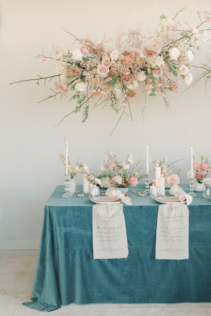 Floating florals – coming down from the ceiling, seem to float above your tables in mid-air, hanging floral installs are guaranteed to make jaws drop!