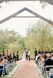 Host your ceremony under the trees and beneath the stars in the Meekermark’s incredible and unique outdoor wedding space, with floating windows and white vaulted beams creating an open-air chapel in the forest. Then, have your reception indoors within the modern vintage-decorated reclaimed wood barn!