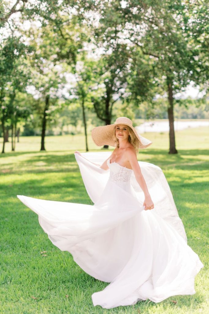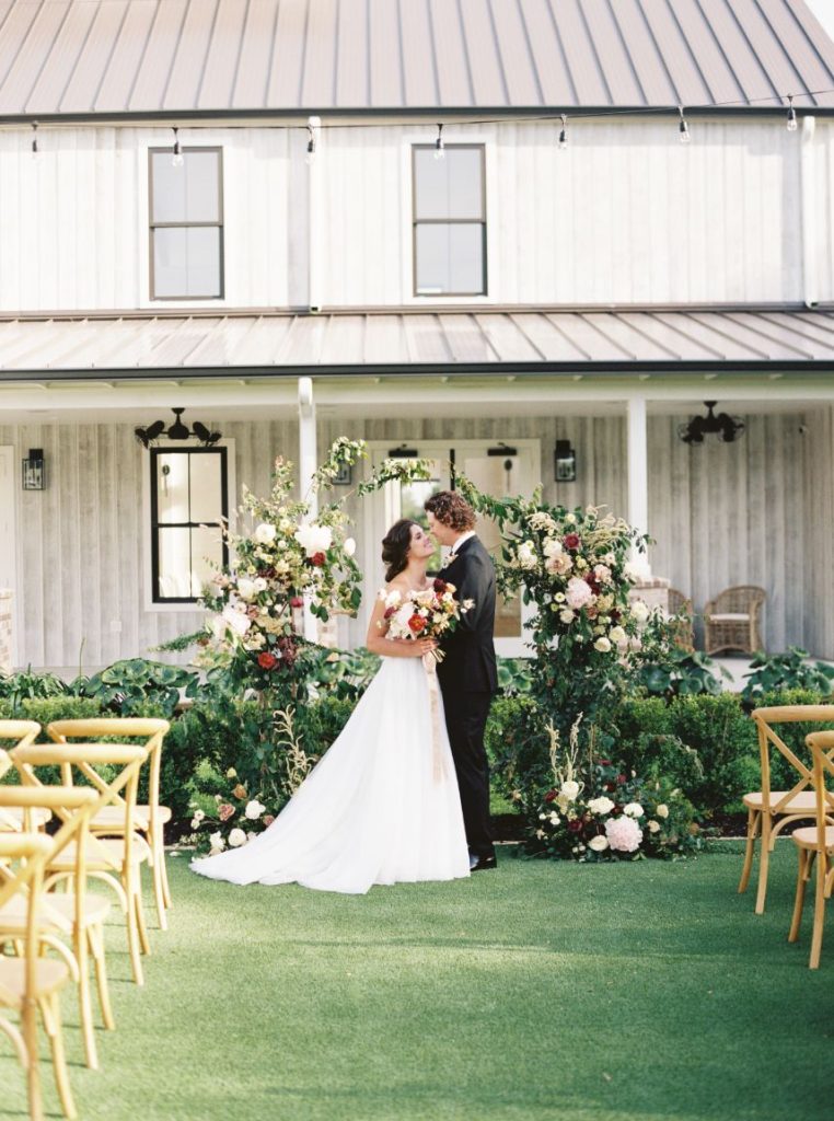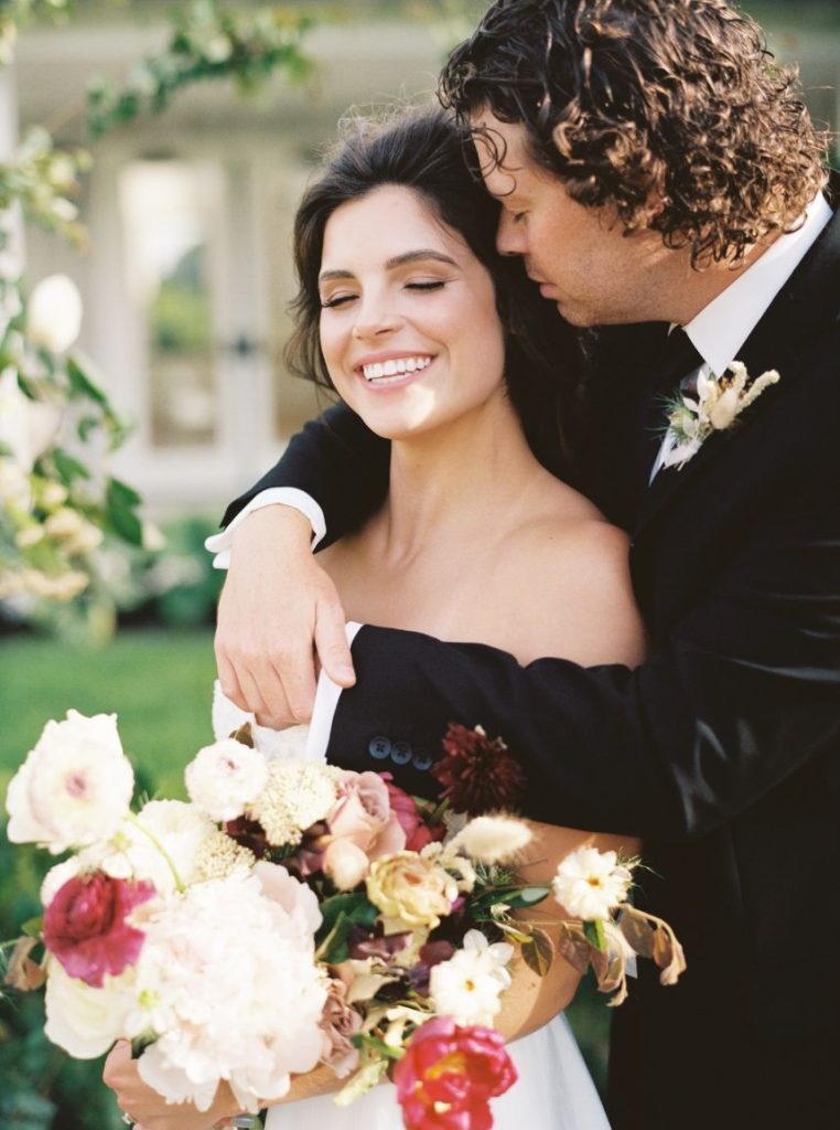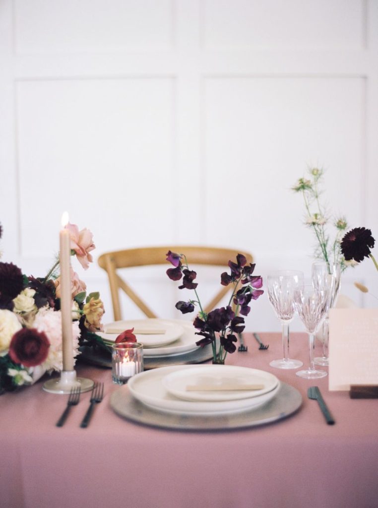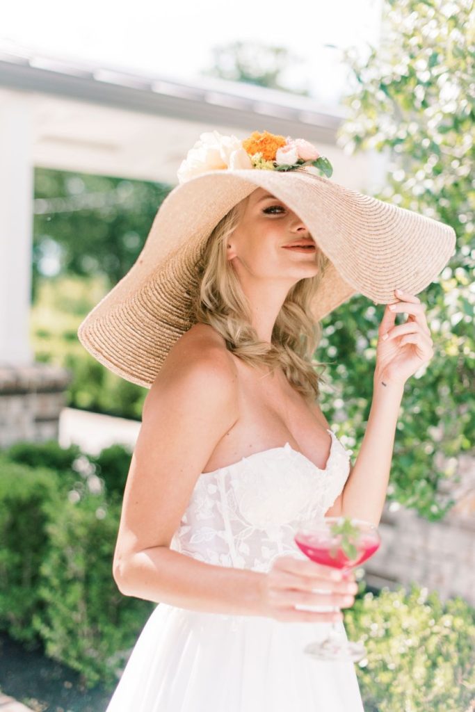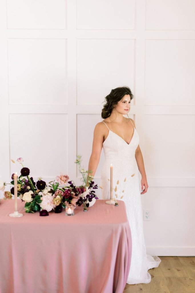 Dual inspiration can be found in this summer and fall styled shoot that showcases the beauty of each major wedding season, and a distinctive wedding design for each! The enchanting property that is Arrowhead Hill accommodates an indoor or outdoor ceremony, and the same goes for reception. The options are truly endless, and this wedding inspiration is proof of that! On the sunnier side of things, boho baskets make for whimsical hanging installations overtop luxe reception dining. Flowers are a must for affairs at this time of the year, and Flora + Fauna ensured that huge fuchsia poppies, toffee roses, fun and spriggy alliums and dried baby’s breath all mingled for a fresh and modern take on wedding floral design. This bride pairs her corset-bodiced gown from Unbridaled with a summery floppy hat for a more editorial wedding look – and we are obsessed! She later models a nude illusion gown with the hottest bridal cape you have ever seen. Her radiant makeup and various hairstyles by Etoilly Artistry each embody so much class. On the fall side, we can practically taste the crisp air and the sweet chemistry between bride and groom in these wedding scenes. The bride first models a V-neck sheath, and then later a strapless ballgown from Unbridaled as well. A loose and wispy updo was absolutely the perfect style for her looks, and Etoilly Artistry knocked it out of the park with her natural glam bridal makeup that exudes simplistic elegance. A mauve fall tablescape of simplistic flatware and organic elements like beige taper candles accented with black dahlias, baby pink petals and moody blooms takes the feeling of fall to a whole new level. There is truly inspiration for every bride throughout this summer and fall styled shoot. Cheers!