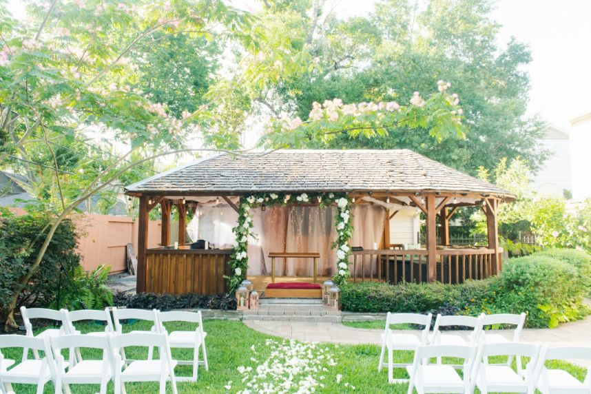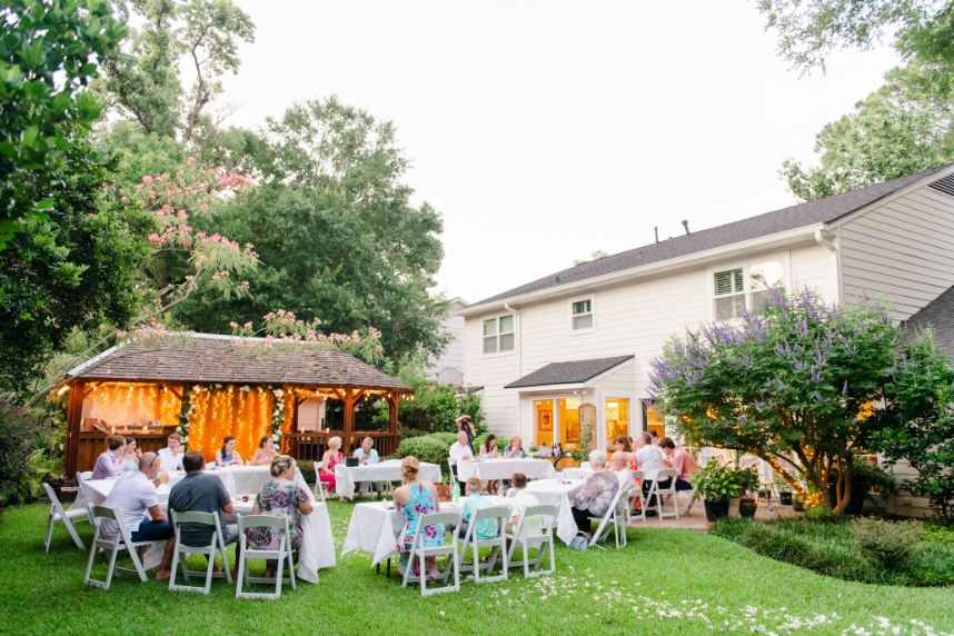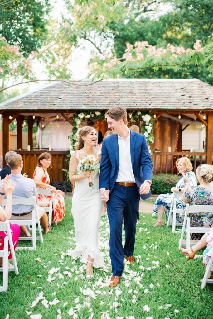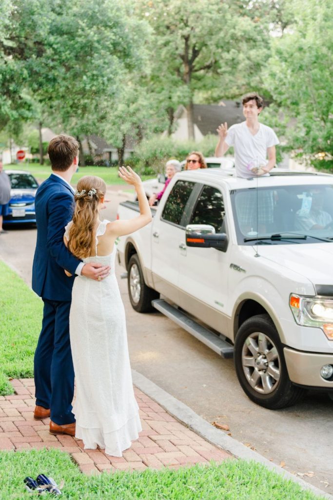 This intimate backyard corona wedding was held at the bride’s childhood home, and it’s one of the sweetest settings we’ve ever seen! Although their wedding day was very different from how they originally planned it to be, Gianna and Christopher could not be more thankful for how it turned out. To keep their intimate ceremony safe for their closest friends and family who were in attendance, they decided to have a socially distanced celebration in the backyard of Gianna’s childhood home. After the conclusion of the ceremony and a couple’s portrait session, both captured to perfection by Kati Hewitt Photography, the newlyweds were surprised with a car parade from friends and family who were not able to make it to their ceremony in person, which ended up being their favorite memory from the day. Nothing says a celebration more than Mexican food, margaritas and dancing the night away under the starlit Texas sky, which is exactly what they did! Through all of the non-traditional aspects of this day, the evening ended with a traditional cake cutting and first dance together as a married couple. We think Gianna and Christopher are oh-so cute and a perfect pair, and you aren’t going to want to miss all the details of their intimate backyard corona wedding featured below. Scroll to see all the sweetness, and to read how Kati Hewitt Photography was the bride’s favorite wedding vendor. Cheers to these high school sweethearts!