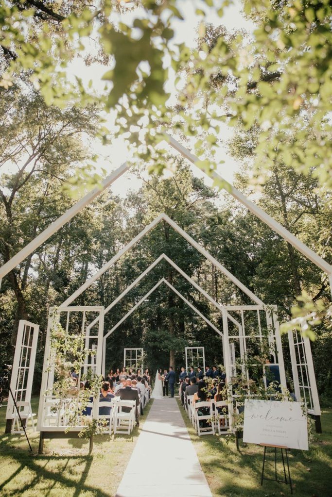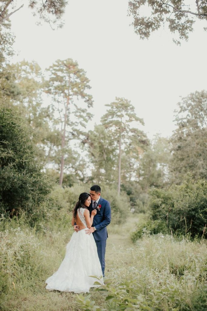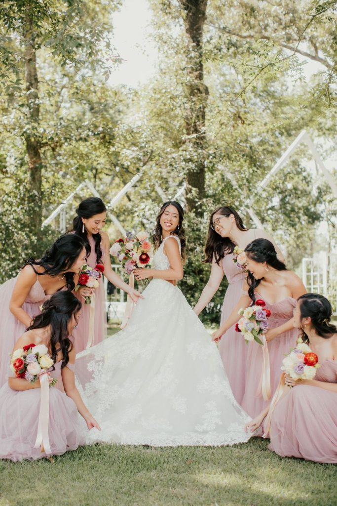 If you enjoy romantic gardens and colorful florals, look no further than Jessica and Shelby’s beautiful summer wedding at The Meekermark. Jessica and Shelby met at UT Austin through their campus ministry. However, it took a season of intramural flag football their senior year, where Shelby was the captain, for the two to start talking. Jessica sent him a message to thank him at the end of the season. Those messages never stopped, and the rest is history for the two! When Shelby decided to propose, he created a surprise weekend for Jessica with her friends. The friends took Jessica and visited locations around Austin that had significant meaning, like the intramural fields. Finally, a path of letters from Shelby lined the way at the last site, and a video of messages from friends and family started playing. After the video, Jessica saw Shelby down on one knee.