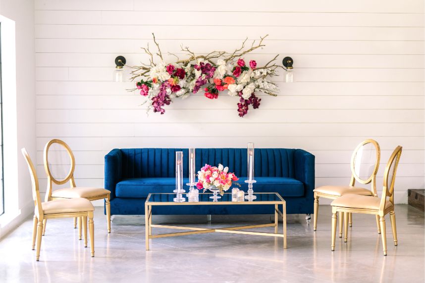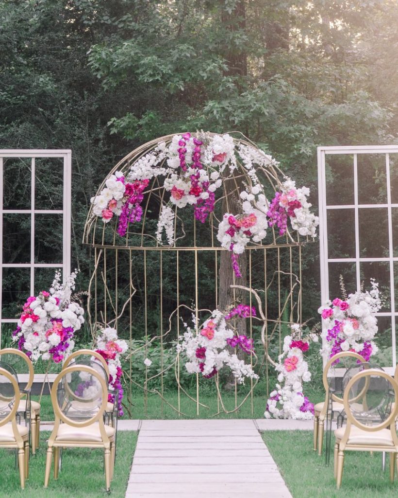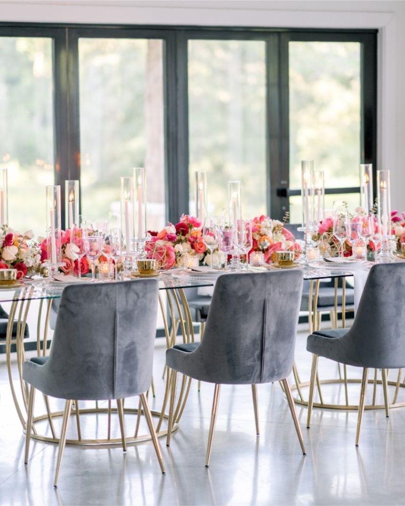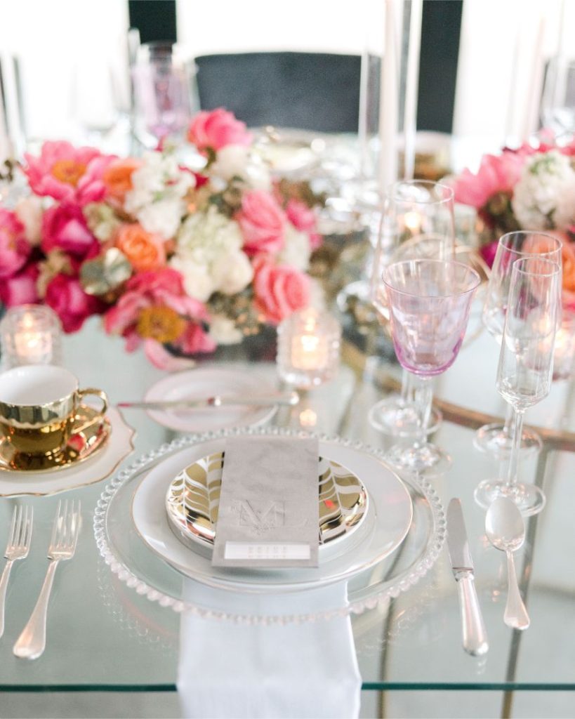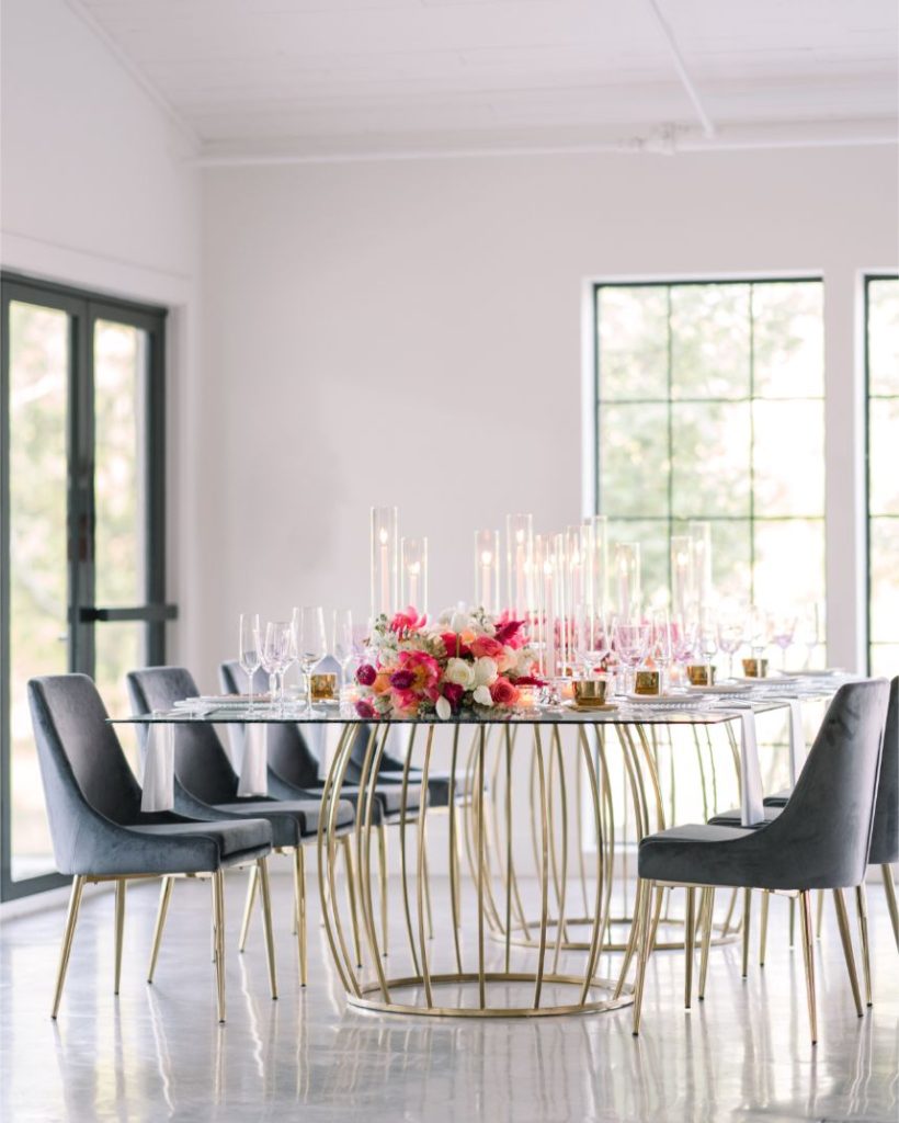 Luxe was the first word that came to mind when we saw this stunning editorial featuring a bold jewel tone palette with vogue details. Planner Lexi McWhinney of The Savvy Event Consultants found inspiration in every-day brides, hoping to incorporate styles, trends and personality that translate across all women – so cool! Unique floral design and modern furniture pieces by Flora & Eventi were perfectly placed in the scenery of The Meekermark’s bright spaces, including an avant garde birdcage floral altar and a hanging floral install above the lounge. Luxury meets minimalist in the suede invitations from Memory Lane Paperie. A tablescape curated by Swift + Company and EB Inc. Event Rentals follows in suit, perfectly balancing edge on femininity. Each model bride was adorned in gowns from Belle Âme Bridal, complementing their romantic beauty looks from Butter Artistry. And finally, you don’t want to miss the glamorous golden details of the cake from Cakes by Gina. Thankfully Stephania Campos Photography was there to capture each detail of this modern, bold palette! Enjoy!