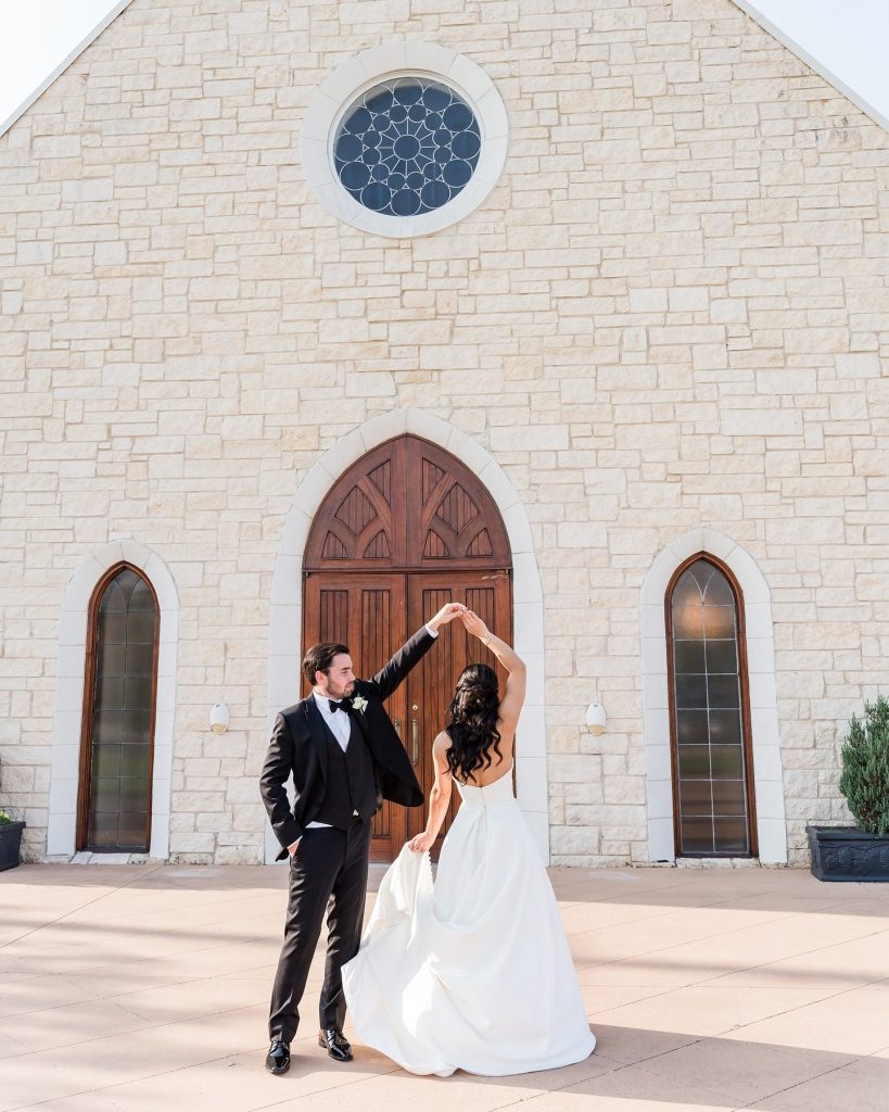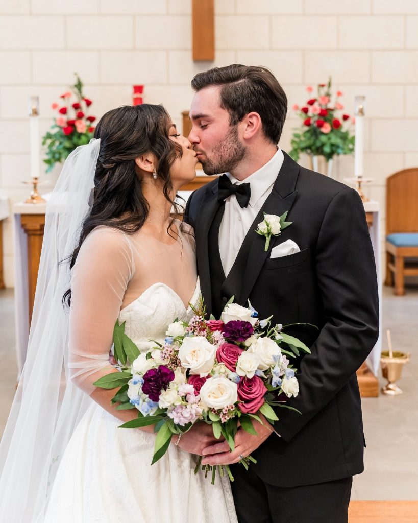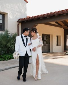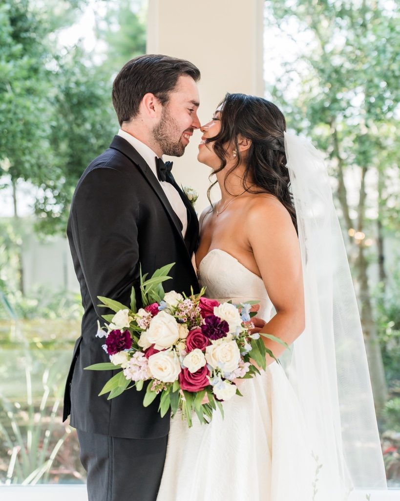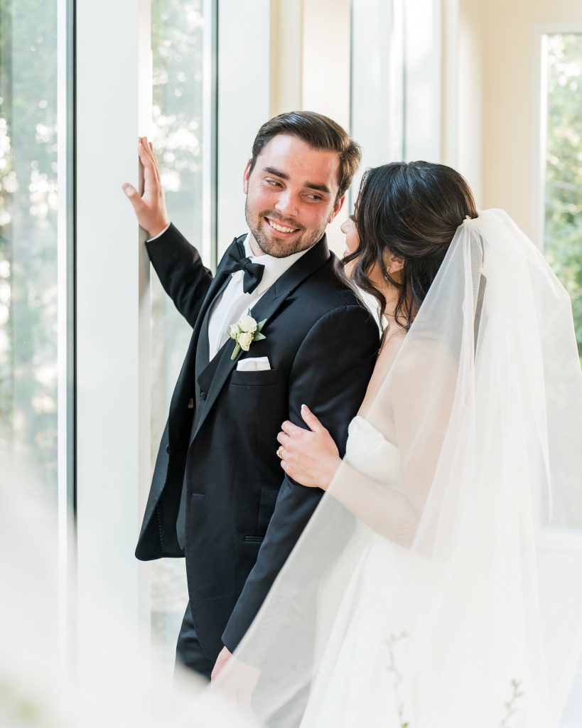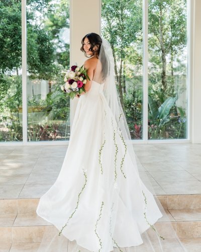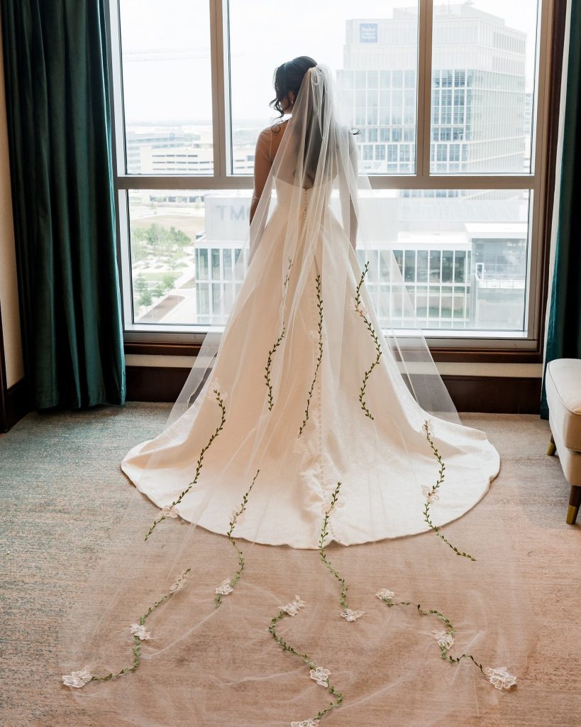 Against the timeless beauty of Ashton Gardens | West Houston, Jhena radiated elegance and romance in her breathtaking wedding dress and floral-appliqué veil from Bella Âme Bridal!