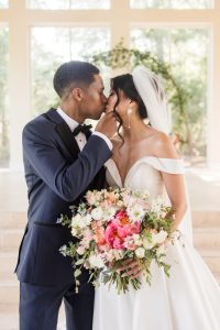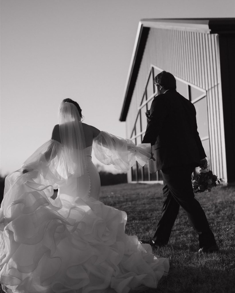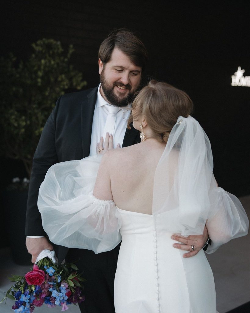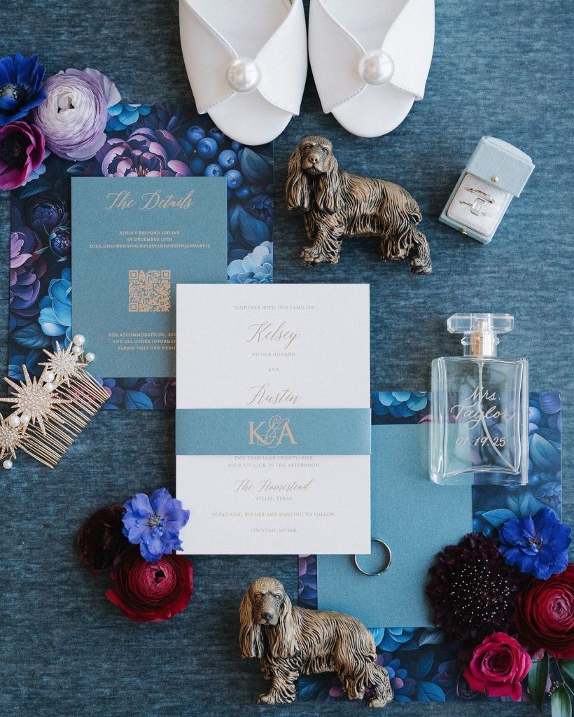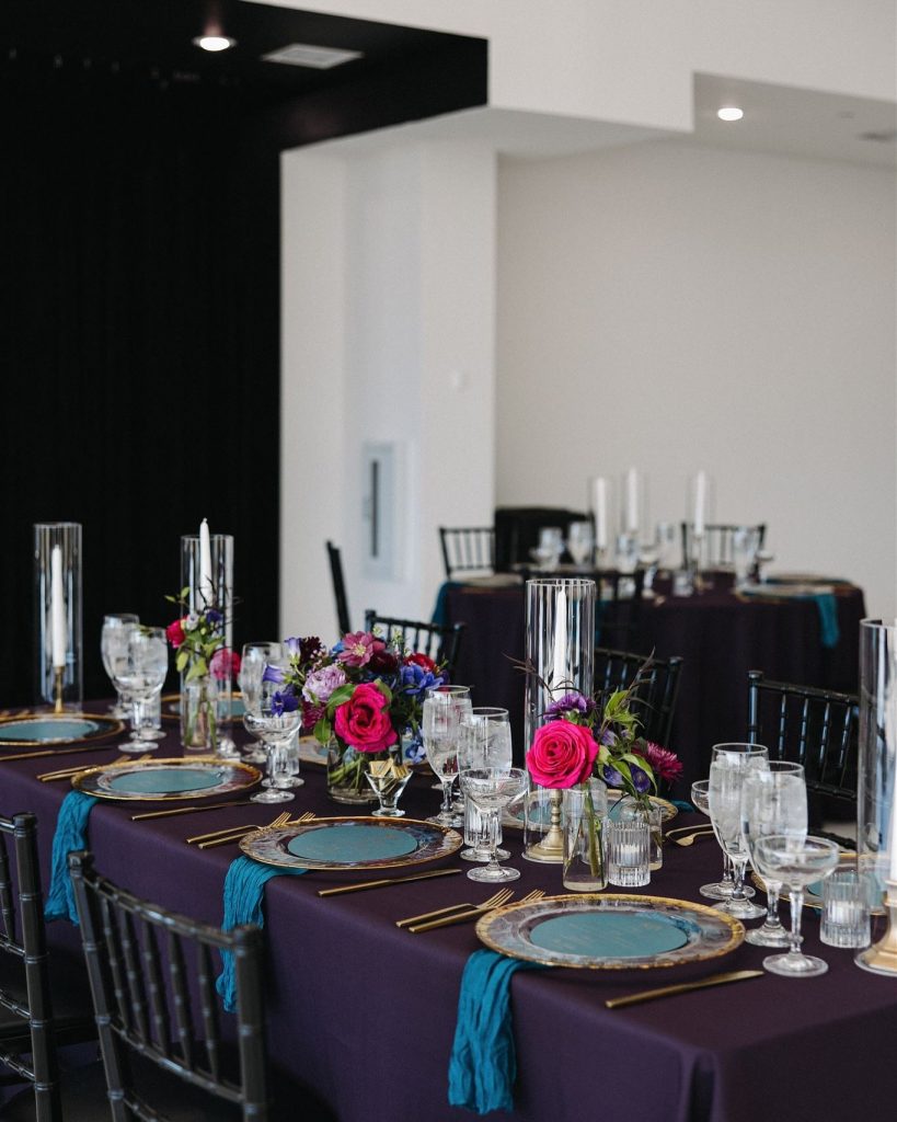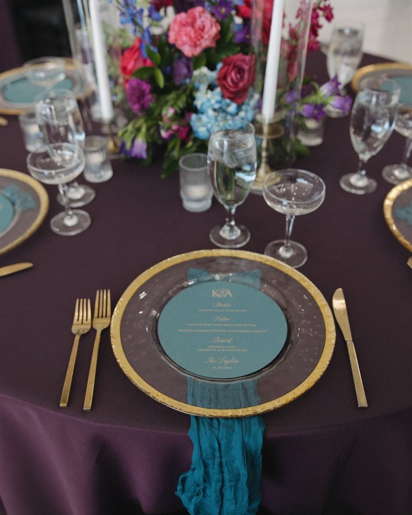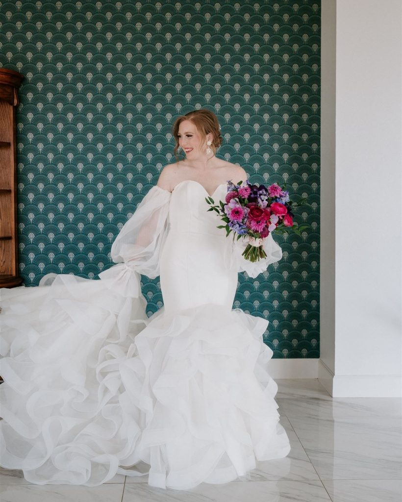 Kelsey & Austin’s wedding was a jewel-toned dream come to life! From the romantic florals by Wanderie Floral Studio to the elegant tablescapes by Aztec Events and Tents, every detail exuded bold, vibrant love. And can we talk about Kelsey’s stunning gown from Something Blue Bridal Boutique? With its off-the-shoulder sleeves and dreamy ruffled train, she was the definition of modern romance and pure elegance! The night ended perfectly with a delicious cake by Cakes by Gina and a never ending dance party thanks to J&A Entertainment. It was an unforgettable night!