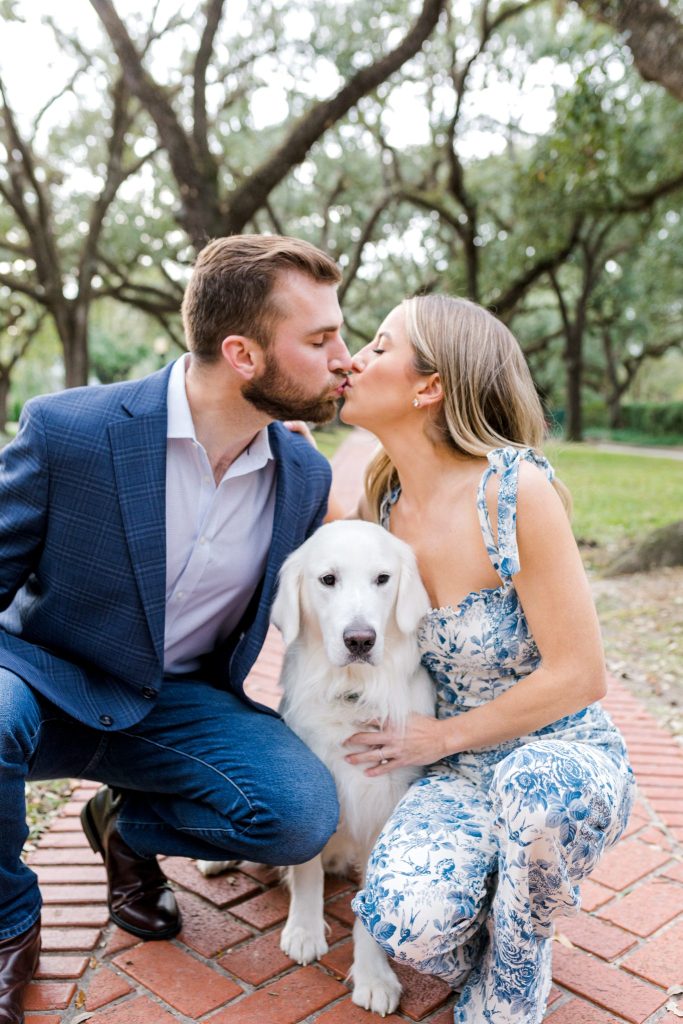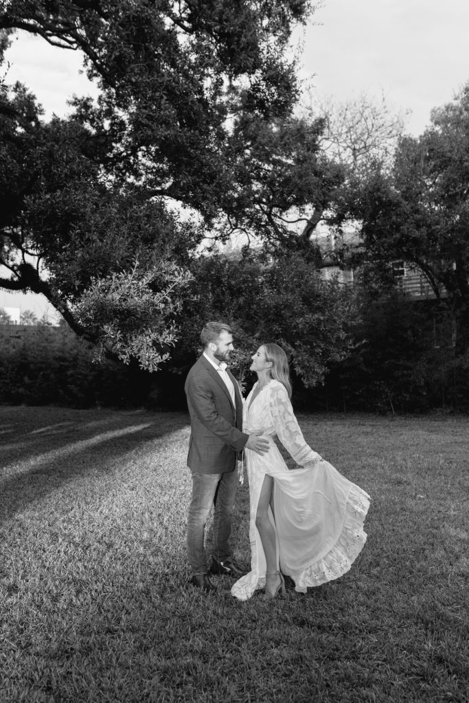 Kendall and Teagan’s engagement shoot completely stole our hearts with their contagious smiles and adorable pup! Courtney Tate Photo captured these breathtaking photos of the couple in the Boulevard Oaks district. The twisted tree limbs combined with the couple’s chic style and overwhelming love make for the perfect engagement shoot session. The adorable couple plans to say “I do” this November at Briscoe Manor. With a timeless style and a color scheme of clean whites with a hint of black and navy details, this wedding indeed sounds oh so chic! We can’t wait to get more of a glimpse of this adorable couple in November with a gallery from Courtney Tate Photo and a wedding film from Reverent Films. However, we’ll be content with this stunning gallery of engagement photos until then. Keep scrolling to see more!