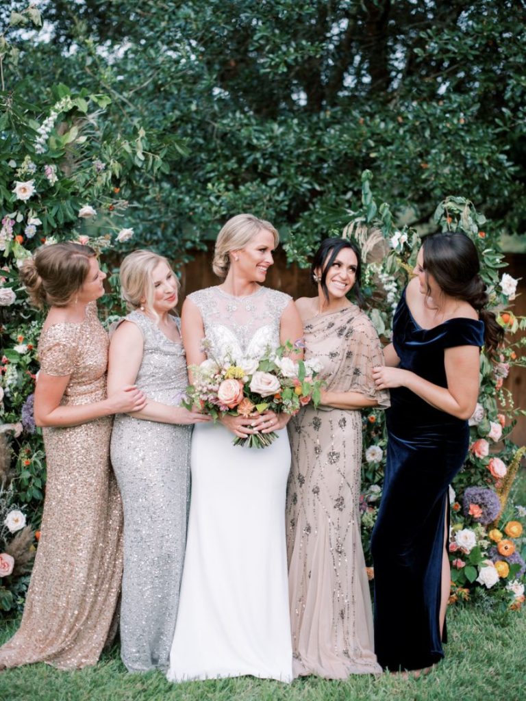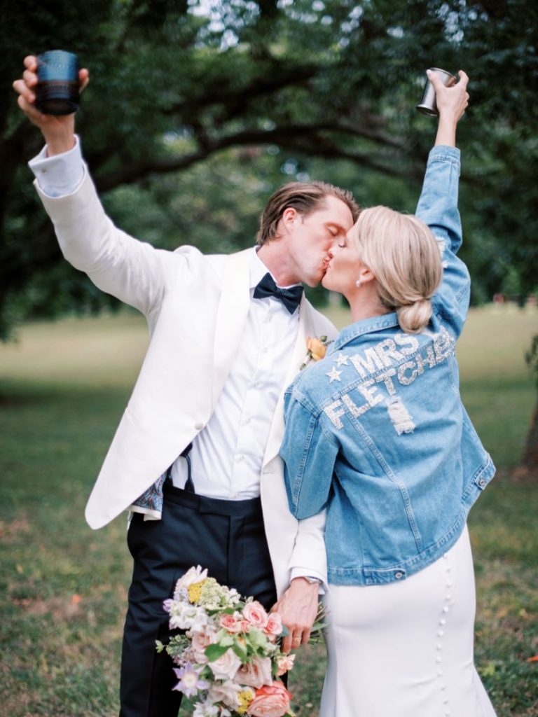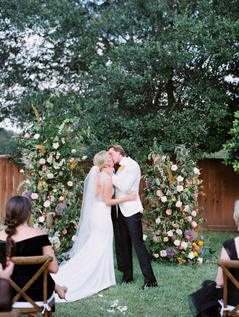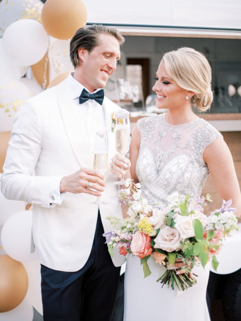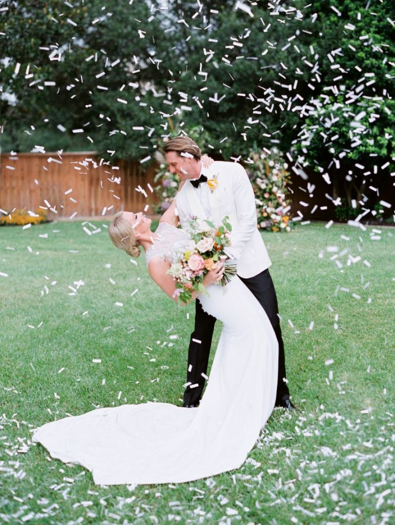 When traveling was no longer an option, this couple brought Kentucky to their backyard COVID wedding that was a black-tie affair despite its intimate crowd! Meredyth and Daniel’s original nuptial plans included a destination wedding on a horse farm in Kentucky, where the bride is from. Since they are both big fans of Kentucky bourbon, horse racing, open fields, and formal affairs, it made perfect sense. When that plan was no longer in the cards, they refocused to Texas and thought since they have pilots in the family, Daniel’s father’s hangar property was the best idea. After much deliberation, the couple made the hard decision to cancel their bigger wedding for the protection and safety of their guests. In just 6 weeks, they replanned once more to bring in 10 wedding guests from far and wide for the scaled-down ceremony As a nod to both sets of their original plans, Meredyth and Daniel really wanted to bring sweet reception tablescape elements of the south along with elements of piloting. Bride Meredyth is also a makeup artist for Butter Artistry, but one of her best friends also on the team was the one to get her glammed up for the big day – styled with a romantic, low updo and flawless bridal makeup. Her look pairs perfectly with a L’amour by Calla Blanche gown featuring a jeweled illusion high-neck and a sheath silhouette from Brickhouse Bridal along with a dreamy veil. Metallics combine with yellow, navy, and mauve tones in a beautiful blend of free-spirited florals that keep a touch of southern elegance, all the way down to the green tomatoes throughout. We love that despite their inability to travel, this couple brought the Kentucky destination wedding to them! They had their first dance as Mr. and Mrs. before cutting into their cake and dancing some more. It’s a tradition in Kentucky for you to bury a bottle of bourbon at your wedding venue one month before the big day and then dig it up to toast with your guests right before hopping into the getaway car. So, that’s exactly what they did – their Old Forester 1920 was dug up from the back flowerbed, the pair had one last toast with their guests, then they were sent off with sparklers and lots of hoorays! Read on for a note from the bride about what she learned from the planning process – and especially planning a COVID wedding. Cheers to the Fletchers!