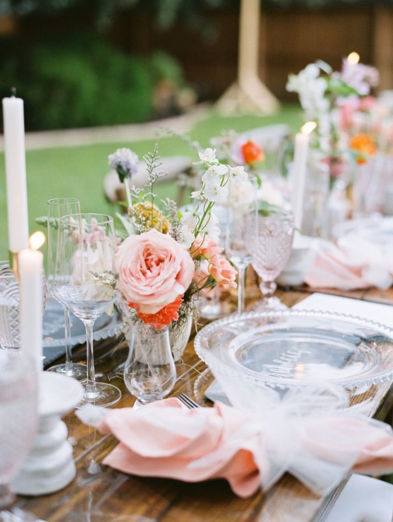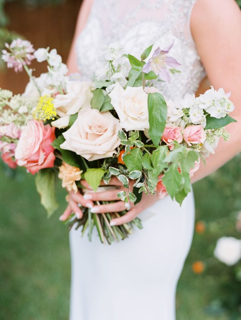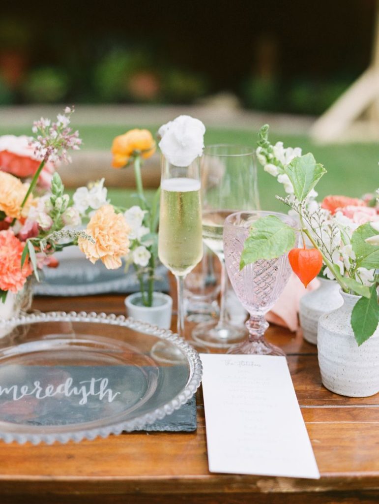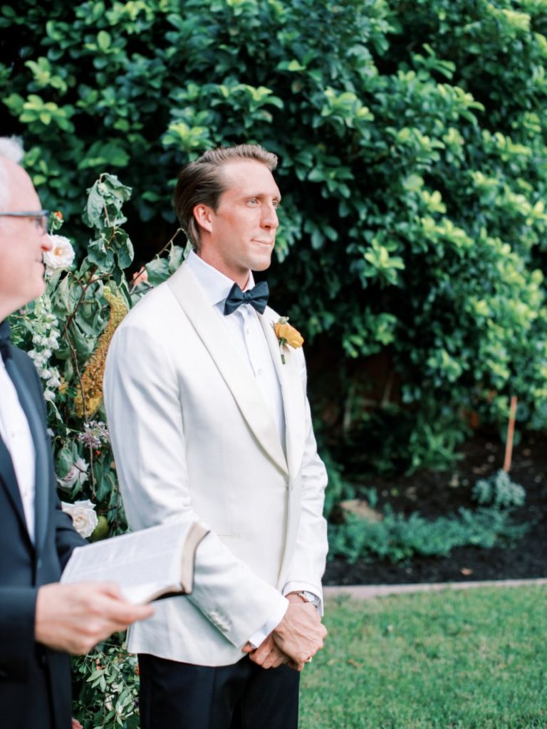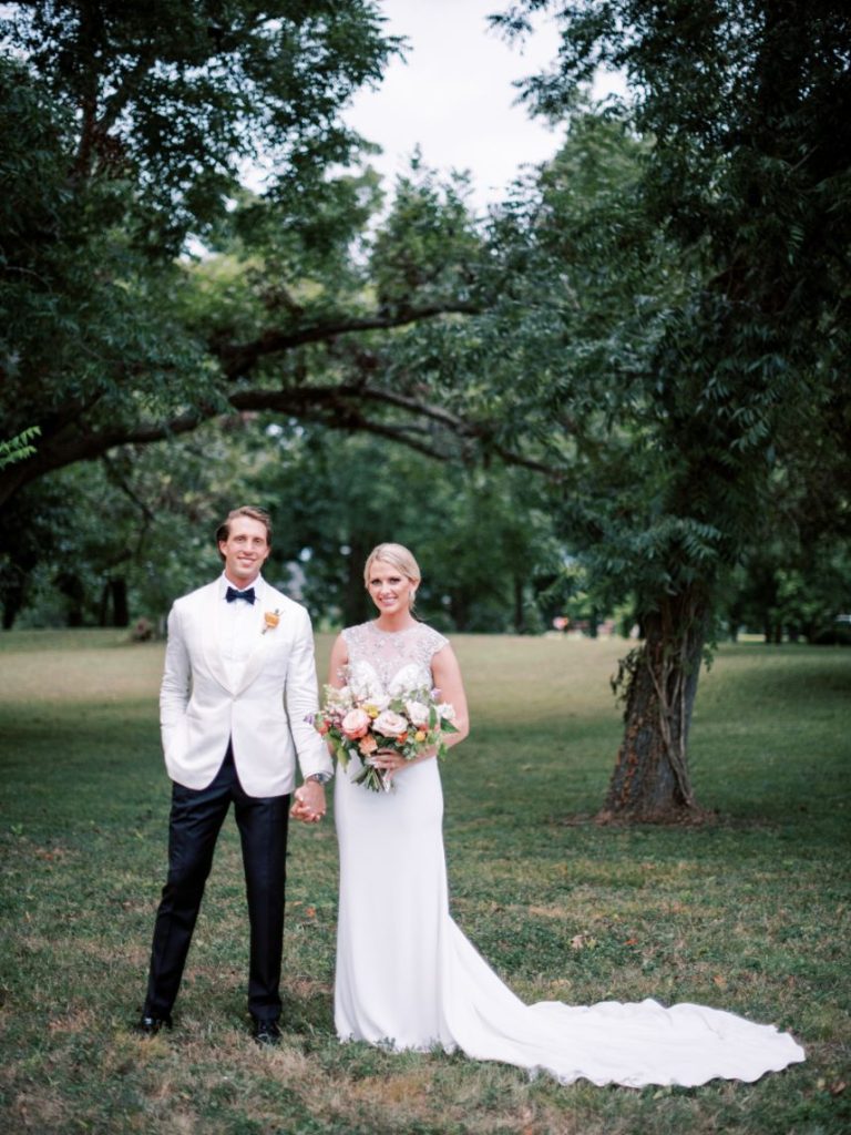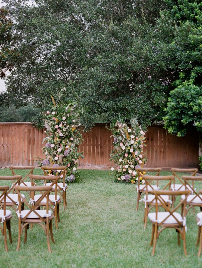 When traveling was no longer an option, this couple brought Kentucky to their backyard COVID wedding that was a black-tie affair despite its intimate crowd! Meredyth and Daniel’s original nuptial plans included a destination wedding on a horse farm in Kentucky, where the bride is from. Since they are both big fans of Kentucky bourbon, horse racing, open fields, and formal affairs, it made perfect sense. When that plan was no longer in the cards, they refocused to Texas and thought since they have pilots in the family, Daniel’s father’s hangar property was the best idea. After much deliberation, the couple made the hard decision to cancel their bigger wedding for the protection and safety of their guests. In just 6 weeks, they replanned once more to bring in 10 wedding guests from far and wide for the scaled-down ceremony As a nod to both sets of their original plans, Meredyth and Daniel really wanted to bring sweet reception tablescape elements of the south along with elements of piloting. Bride Meredyth is also a makeup artist for Butter Artistry, but one of her best friends also on the team was the one to get her glammed up for the big day – styled with a romantic, low updo and flawless bridal makeup. Her look pairs perfectly with a L’amour by Calla Blanche gown featuring a jeweled illusion high-neck and a sheath silhouette from Brickhouse Bridal along with a dreamy veil. Metallics combine with yellow, navy, and mauve tones in a beautiful blend of free-spirited florals that keep a touch of southern elegance, all the way down to the green tomatoes throughout. We love that despite their inability to travel, this couple brought the Kentucky destination wedding to them! They had their first dance as Mr. and Mrs. before cutting into their cake and dancing some more. It’s a tradition in Kentucky for you to bury a bottle of bourbon at your wedding venue one month before the big day and then dig it up to toast with your guests right before hopping into the getaway car. So, that’s exactly what they did – their Old Forester 1920 was dug up from the back flowerbed, the pair had one last toast with their guests, then they were sent off with sparklers and lots of hoorays! Read on for a note from the bride about what she learned from the planning process – and especially planning a COVID wedding. Cheers to the Fletchers!