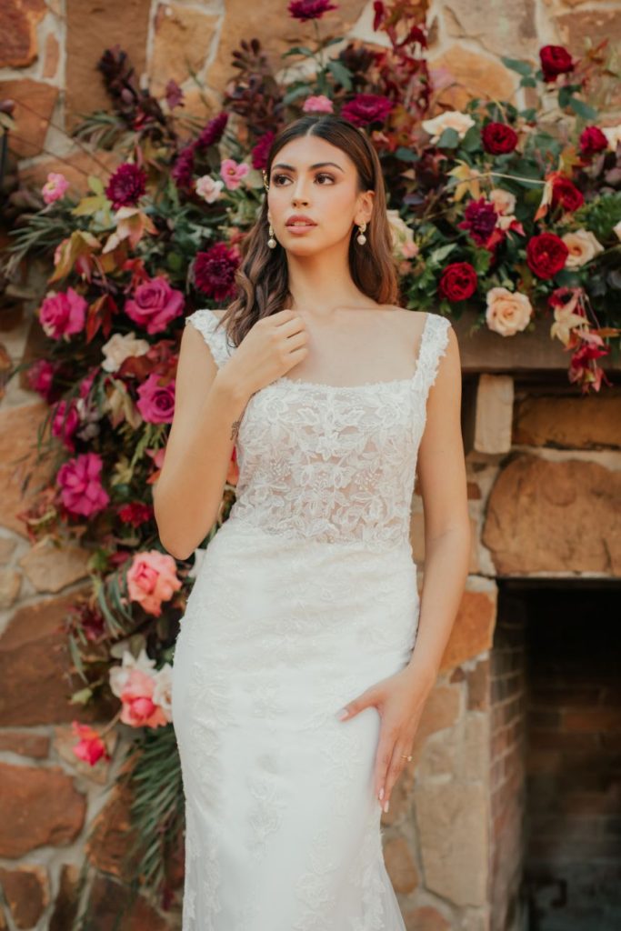 Find yourself in this flattering scoop neck column silhouette from EVOKE: the bridal experience with a feminine lace bodice and cap sleeves that rest just off the shoulder for the most effortlessly elegant look. A sweeping lacey brush train will leave every jaw on the floor just like your modern glam bridal look with gorgeous tucked waves! For extra impact, create an accessory story with celestial-inspired jewelry and hairpins in star and moon shapes.
