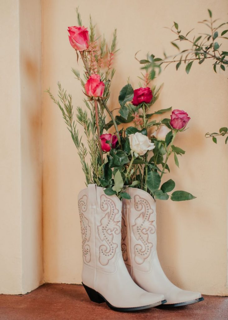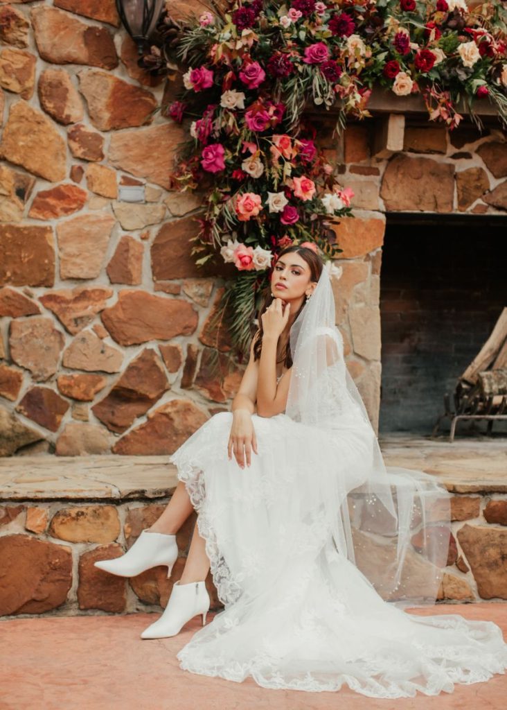 From Brickhouse Bridal, this chic and simple gown was complete with gorgeous dramatic cutouts and a sophisticated high-neck silhouette that we can’t get enough of! For the perfect contrast and blending of styles, a bridal cowboy boot is an ultimate accessory for the bride with Texas pride.