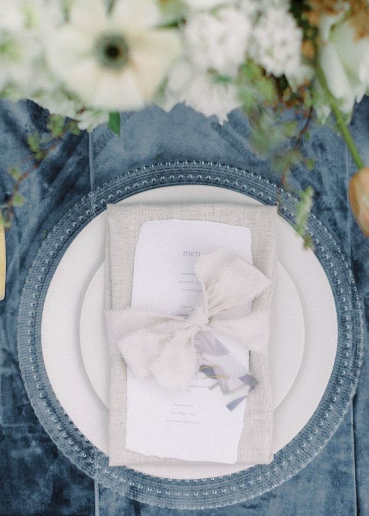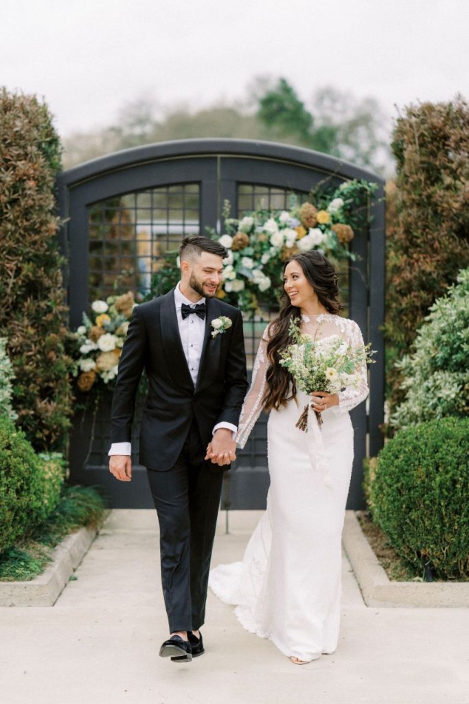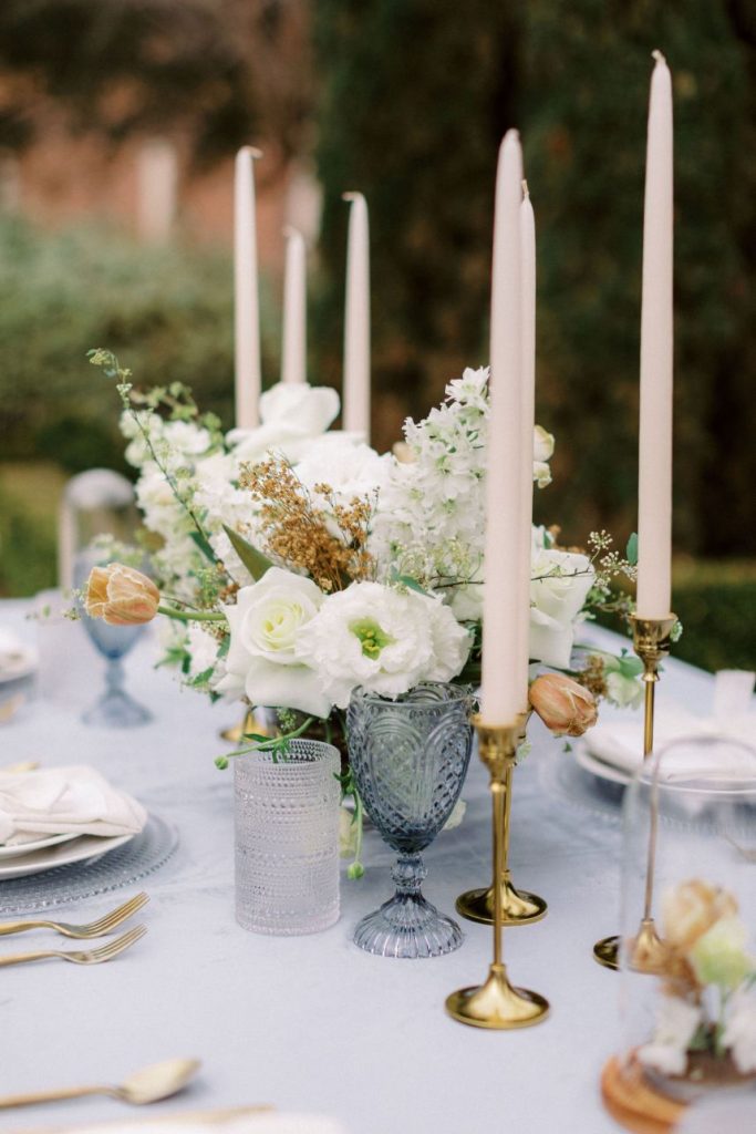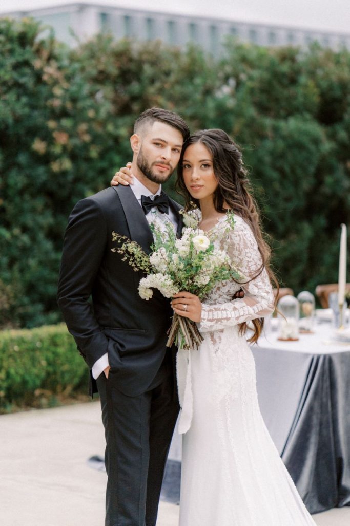 The talented photographers at FR Weddings truly know how to capture a mood and this garden elegance wedding inspiration was no exception! Lavish, high fashion, and vintage-inspired all at once, French blue and golden ochre tones show up in floral design by Cali and Bloom throughout this styled shoot draw attention to pops of stark white throughout – namely our beautiful bride styled by Adorne Artistry with a romantic half-up accented with delicate jeweled hairpiece and natural, glowing bridal makeup. She modeled a long-sleeved lace gown from Belle Âme Bridal with an illusion neckline and darling open back detailing that brought our eyes right to the sweeping train that looks luxe yet down-to-earth in its lush garden setting. Vintage romance plays out on a breathtaking tablescape of brass candlestick holders, antique stemware in smoky blue glass and more décor from Party Time Rentals that add character and flair that will wow your guests. And speaking of wow, Cakes by Gina hit it out of the park as per usual with a whimsical three-tiered wedding cake embossed with monochrome fondant flowers and trimmed with a few more edible blooms made to look totally real. Paired with her dapper groom, this couple looks oh-so-chic, we just can’t get enough! Wedding fashion has never looked better than in this lavish garden elegance wedding inspiration, captured in the gallery down below. Cheers!