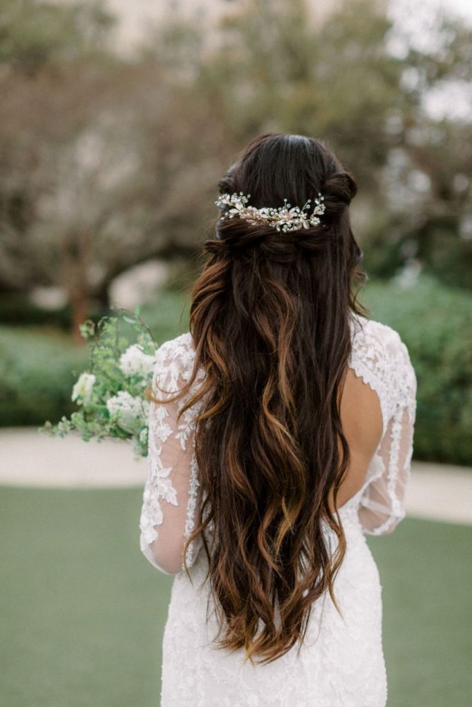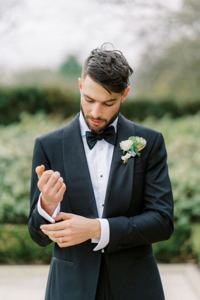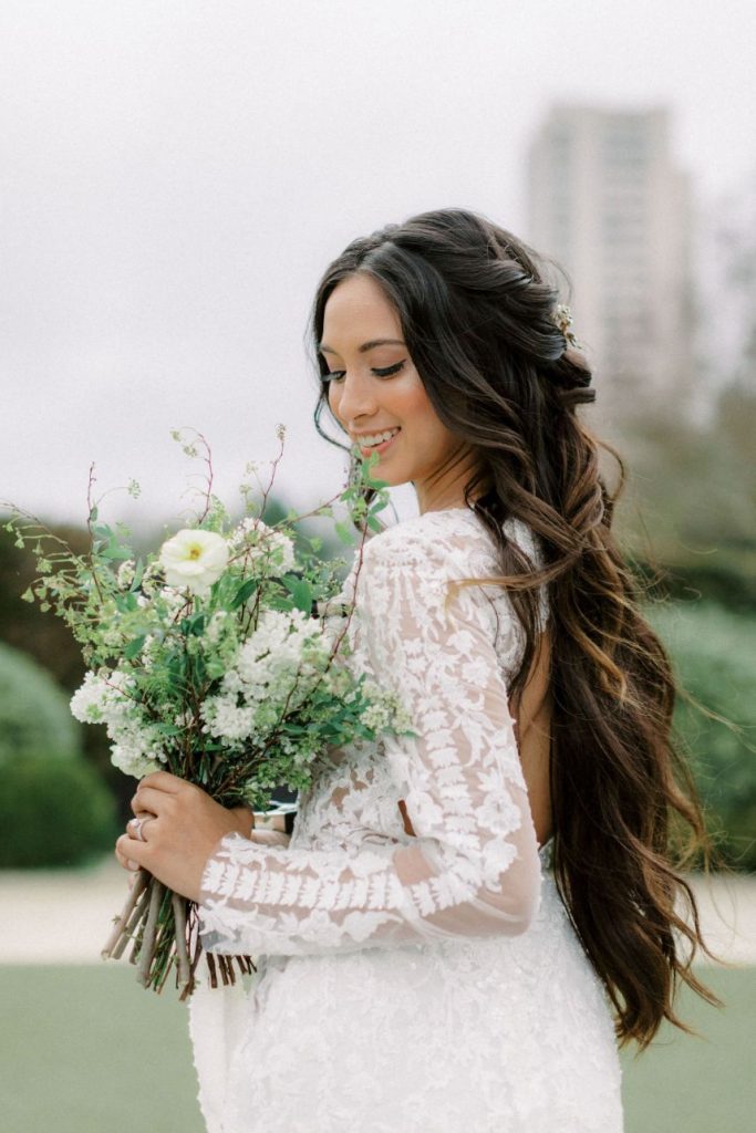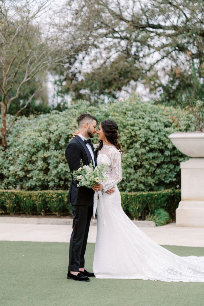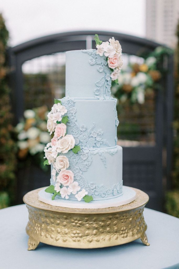 The talented photographers at FR Weddings truly know how to capture a mood and this garden elegance wedding inspiration was no exception! Lavish, high fashion, and vintage-inspired all at once, French blue and golden ochre tones show up in floral design by Cali and Bloom throughout this styled shoot draw attention to pops of stark white throughout – namely our beautiful bride styled by Adorne Artistry with a romantic half-up accented with delicate jeweled hairpiece and natural, glowing bridal makeup. She modeled a long-sleeved lace gown from Belle Âme Bridal with an illusion neckline and darling open back detailing that brought our eyes right to the sweeping train that looks luxe yet down-to-earth in its lush garden setting. Vintage romance plays out on a breathtaking tablescape of brass candlestick holders, antique stemware in smoky blue glass and more décor from Party Time Rentals that add character and flair that will wow your guests. And speaking of wow, Cakes by Gina hit it out of the park as per usual with a whimsical three-tiered wedding cake embossed with monochrome fondant flowers and trimmed with a few more edible blooms made to look totally real. Paired with her dapper groom, this couple looks oh-so-chic, we just can’t get enough! Wedding fashion has never looked better than in this lavish garden elegance wedding inspiration, captured in the gallery down below. Cheers!