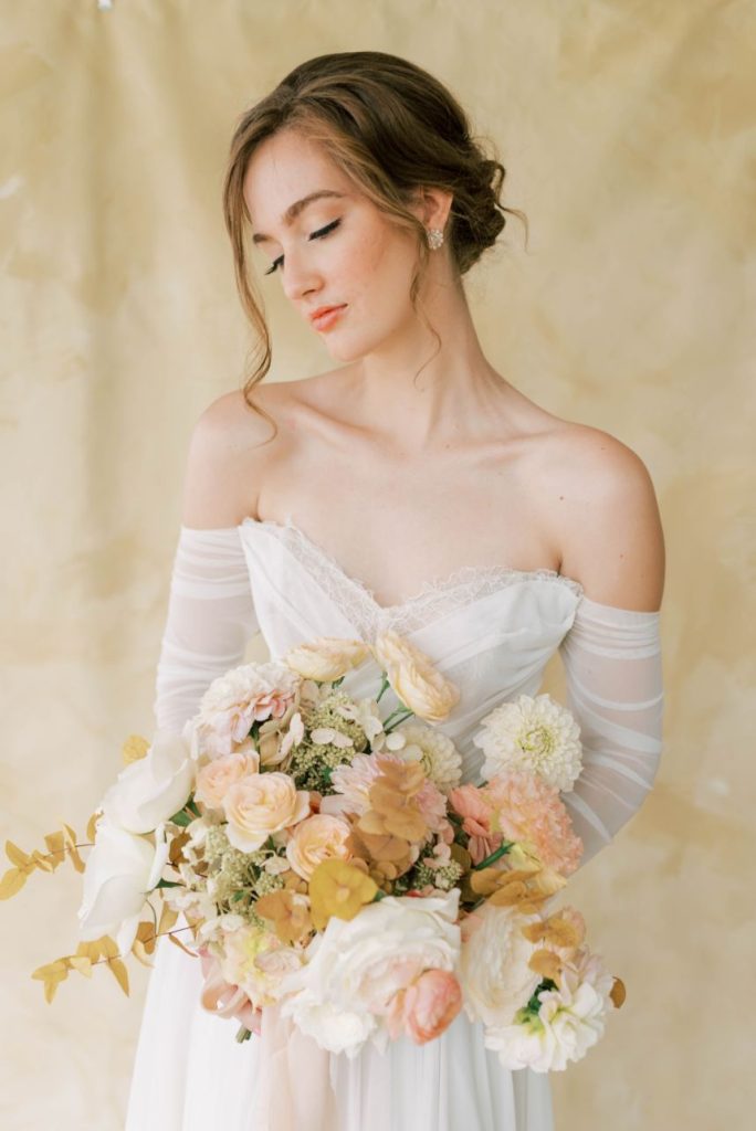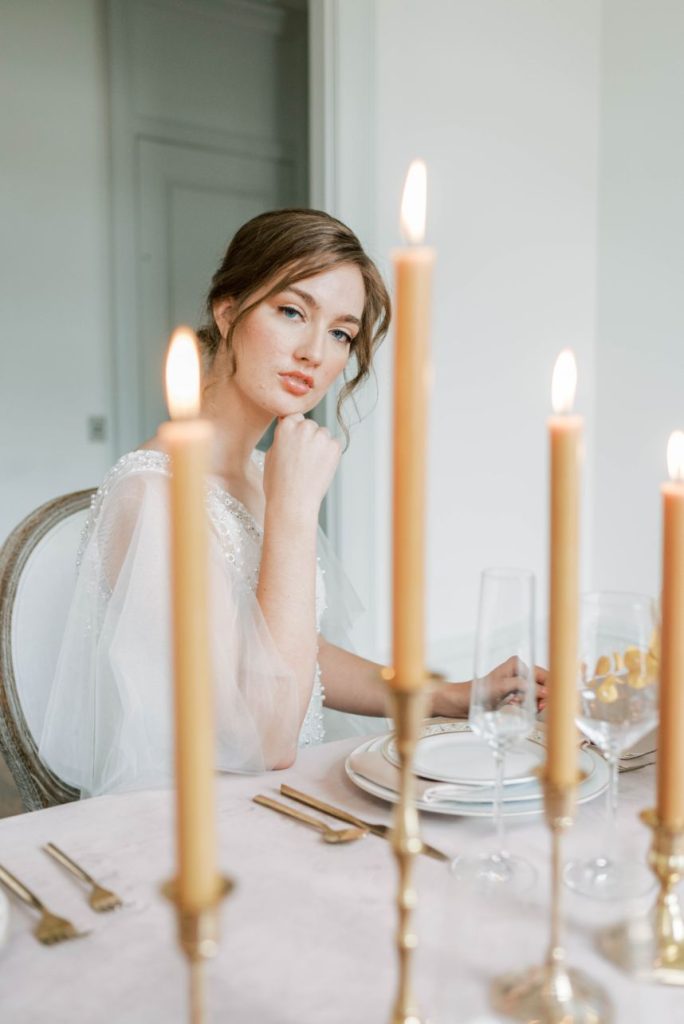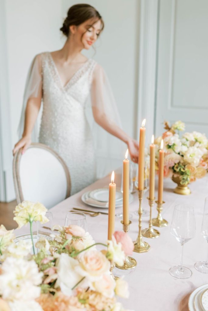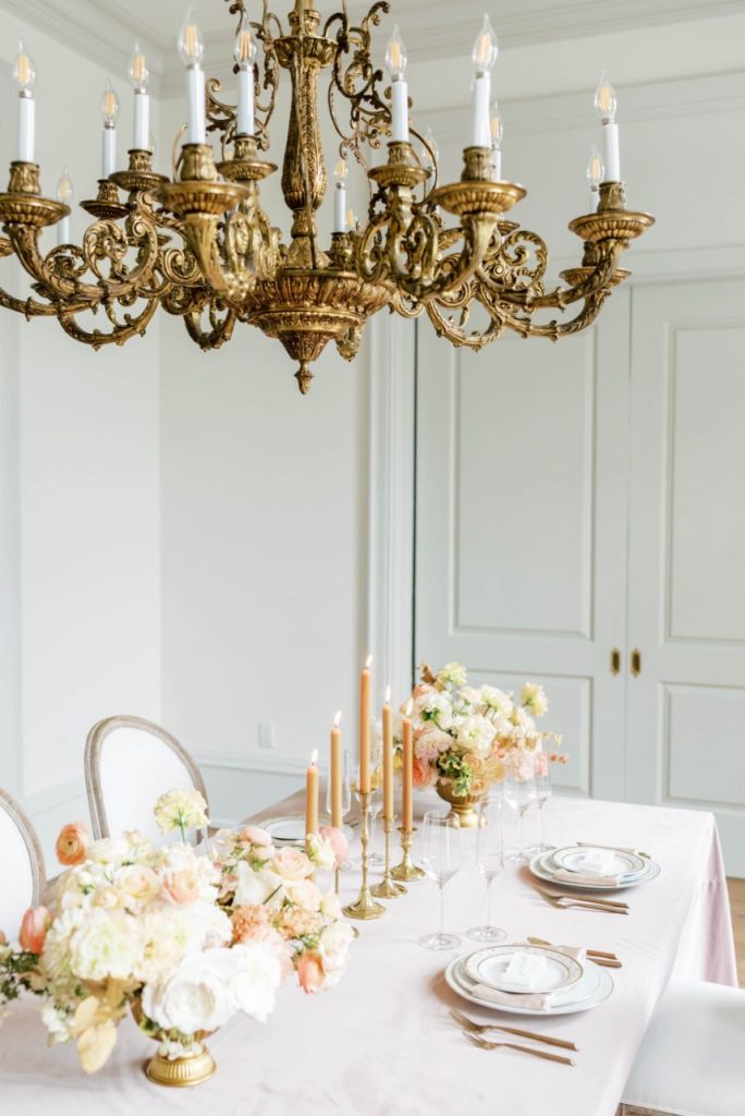Oui, s’il vous plaît! In French, Le Bon Ton translates to “in good form,” and we think this Parisian bridal inspo dripping with decadence in shades of apricot and dusty rose is just that! Perfect form, in fact. Dreamt up, designed and styled by Patti Darby Photography, the sophisticated peachy palette accented with ivory and gold looked exquisite inside the luxurious Baroque interiors of The Creative Chateau, while linens and place settings from Party Time Rentals elevated the tablescape to that of a romantic restaurant along the streets of Paris. Meant to inspire those who lean toward whimsical, romantic aesthetics, this bridal scene features gorgeous haute couture-esque gowns from Brickhouse Bridal and effortlessly easy and dewy hair and makeup by Hey Lovely.