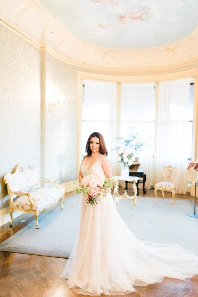 As seen in this gorgeous luxe pastel elopement inspiration from Tammy’s Table, you don’t have to choose an exotic location to make your elopement memorable and beautiful. There are plenty of elegant and romantic venues not far from Houston where you can feel transported to a whole new world, like the Moody Mansion in Galveston! Tamarah picked this historic homestead as the locale for a charming elopement shoot and we’re absolutely loving the romantic feel! Soft pastels against the mansion’s bolder backdrop create contrast and structure, while the dainty details like the simple watercolor cake and blush blooms make a statement all their own. Tamarah incorporated touches of gold throughout for a regal, elevated feel, including the rose gold ring, gold tableware and gorgeous gold calligraphy on the love letter. From the ethereal, flowing gown to the romantic tablescape, we’re loving every aspect of this luxe pastel elopement with old world charm!