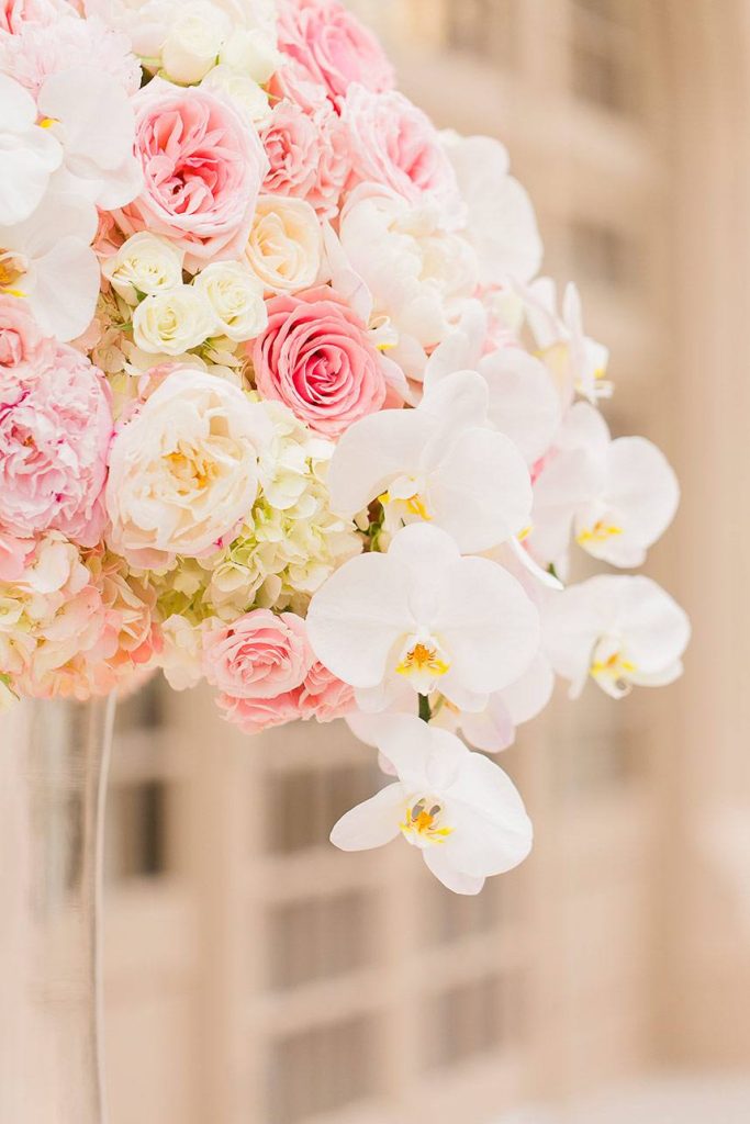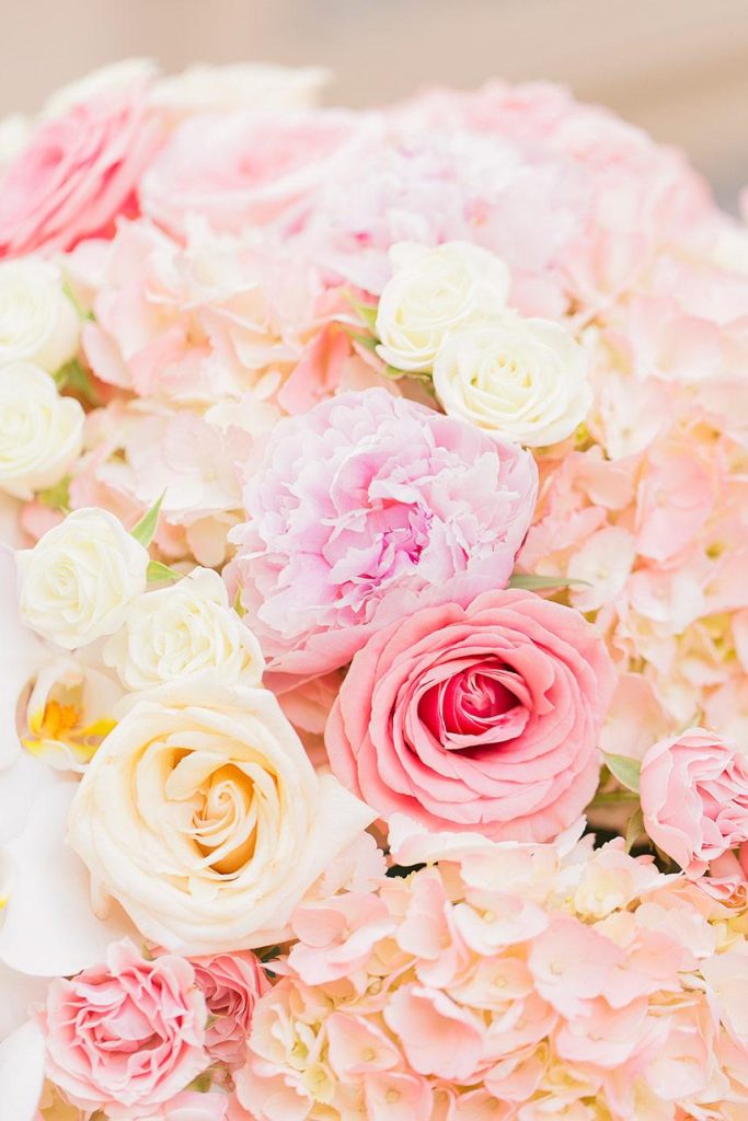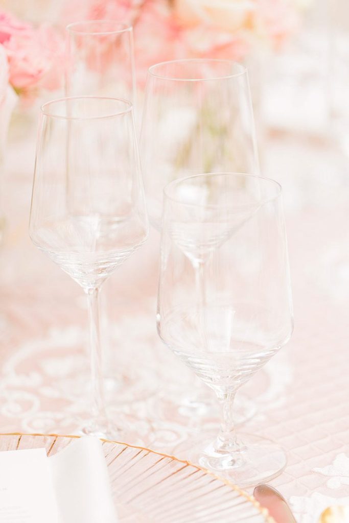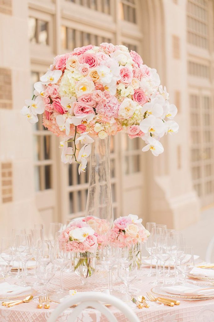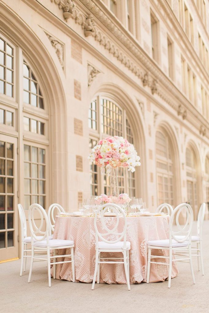 Nothing says elegant, delicate and all things girly sweet like a pastel-hued color scheme, so you can see why we’re totally over the moon for all of this luxe pink ballroom inspiration from Love Detailed Events! Set at Houston’s Crystal Ballroom, the building’s engraved walls, grand archways and windowed french doors made for a backdrop fit for a French chateau. The Cotton Collective captured the magic of the pretty setting and every detail from place setting to floral arrangements. Keeping color to predominantly pinks, Striking Stems created towering arrangements of ultra-feminine blooms with peonies, roses, hydrangeas and even stems of soft white orchids for a touch of exotic elegance. Smaller arrangements were used to frame their larger counterparts and were placed in glasses from Swift + Company. For the table setting, EB Inc. provided white oval back chairs and round tables to serve as the centerpieces of the setting. La Tavola’s scrolling linens added a glamorous touch to the simple and more modern pieces used at each place setting, such as the glass and gold-rimmed chargers and sleek glass vases. For the final decor touch, Invitation Solutions created a simple paper suite in glimmering foiled gold, complete with hand calligraphy bands to substitute in place of traditional place cards. These pretty in pink details can undoubtedly bring out the girly bride in us all! Enjoy!