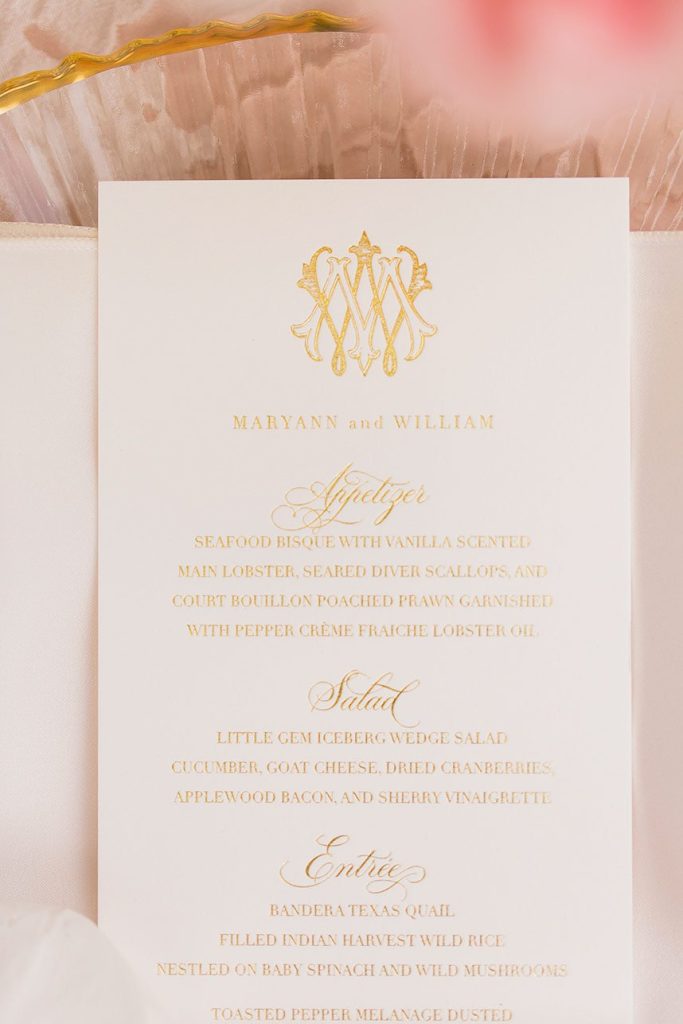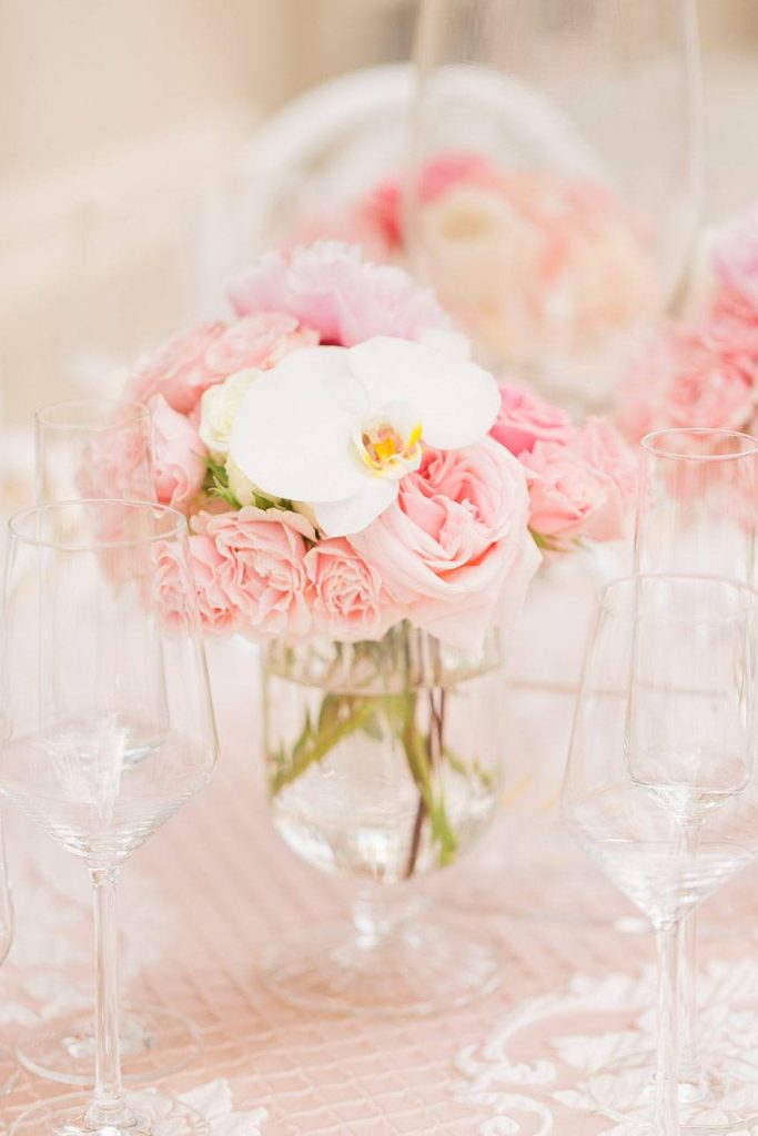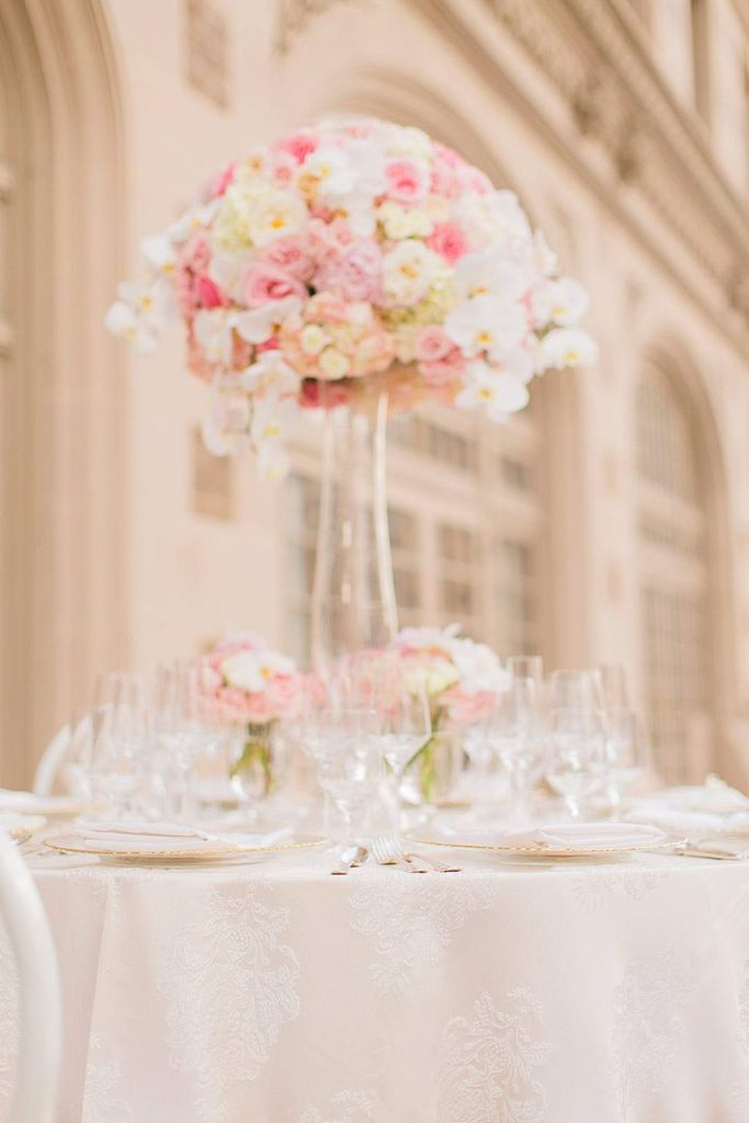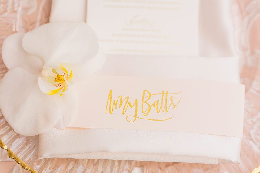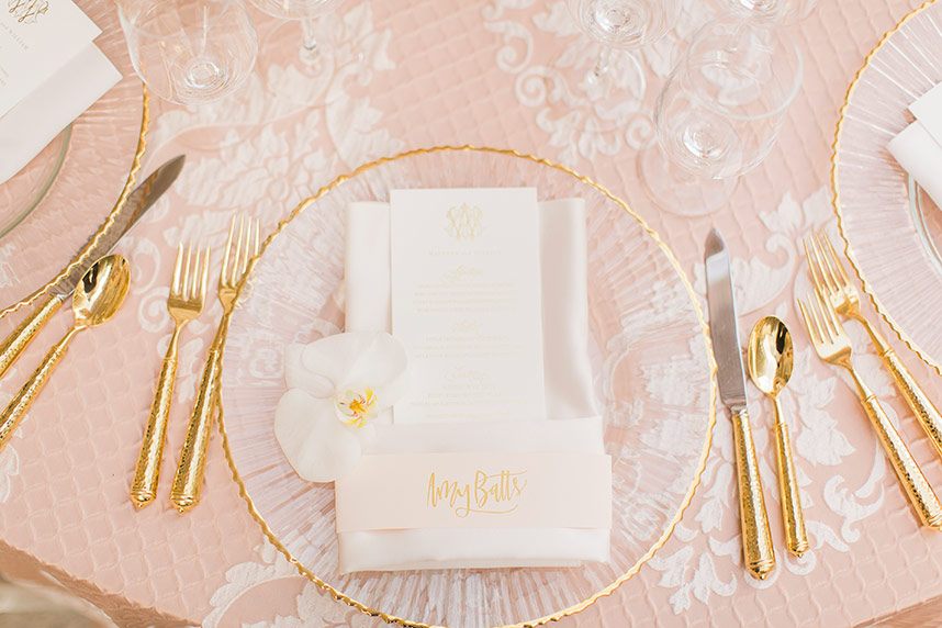 Nothing says elegant, delicate and all things girly sweet like a pastel-hued color scheme, so you can see why we’re totally over the moon for all of this luxe pink ballroom inspiration from Love Detailed Events! Set at Houston’s Crystal Ballroom, the building’s engraved walls, grand archways and windowed french doors made for a backdrop fit for a French chateau. The Cotton Collective captured the magic of the pretty setting and every detail from place setting to floral arrangements. Keeping color to predominantly pinks, Striking Stems created towering arrangements of ultra-feminine blooms with peonies, roses, hydrangeas and even stems of soft white orchids for a touch of exotic elegance. Smaller arrangements were used to frame their larger counterparts and were placed in glasses from Swift + Company. For the table setting, EB Inc. provided white oval back chairs and round tables to serve as the centerpieces of the setting. La Tavola’s scrolling linens added a glamorous touch to the simple and more modern pieces used at each place setting, such as the glass and gold-rimmed chargers and sleek glass vases. For the final decor touch, Invitation Solutions created a simple paper suite in glimmering foiled gold, complete with hand calligraphy bands to substitute in place of traditional place cards. These pretty in pink details can undoubtedly bring out the girly bride in us all! Enjoy!