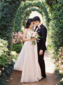 Nothing says elegant, delicate and all things girly sweet like a pastel-hued color scheme, so you can see why we’re totally over the moon for all of this luxe pink ballroom inspiration from Love Detailed Events! Set at Houston’s Crystal Ballroom, the building’s engraved walls, grand archways and windowed french doors made for a backdrop fit for a French chateau. The Cotton Collective captured the magic of the pretty setting and every detail from place setting to floral arrangements. Keeping color to predominantly pinks, Striking Stems created towering arrangements of ultra-feminine blooms with peonies, roses, hydrangeas and even stems of soft white orchids for a touch of exotic elegance. Smaller arrangements were used to frame their larger counterparts and were placed in glasses from Swift + Company. For the table setting, EB Inc. provided white oval back chairs and round tables to serve as the centerpieces of the setting. La Tavola’s scrolling linens added a glamorous touch to the simple and more modern pieces used at each place setting, such as the glass and gold-rimmed chargers and sleek glass vases. For the final decor touch, Invitation Solutions created a simple paper suite in glimmering foiled gold, complete with hand calligraphy bands to substitute in place of traditional place cards. These pretty in pink details can undoubtedly bring out the girly bride in us all! Enjoy!