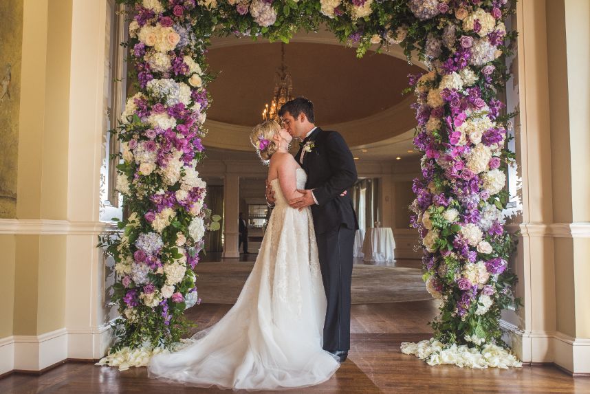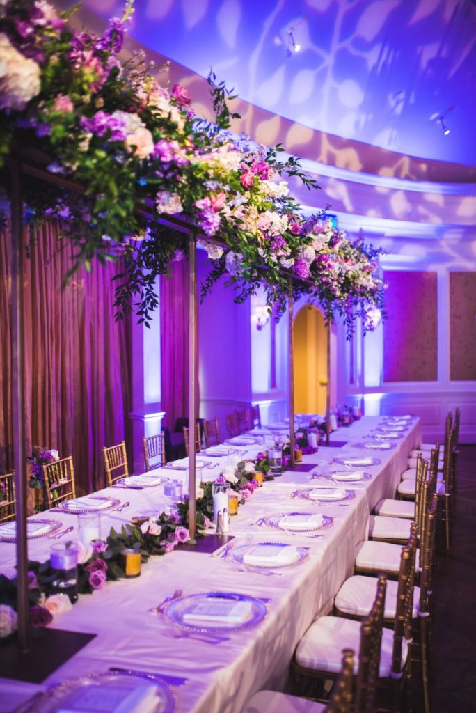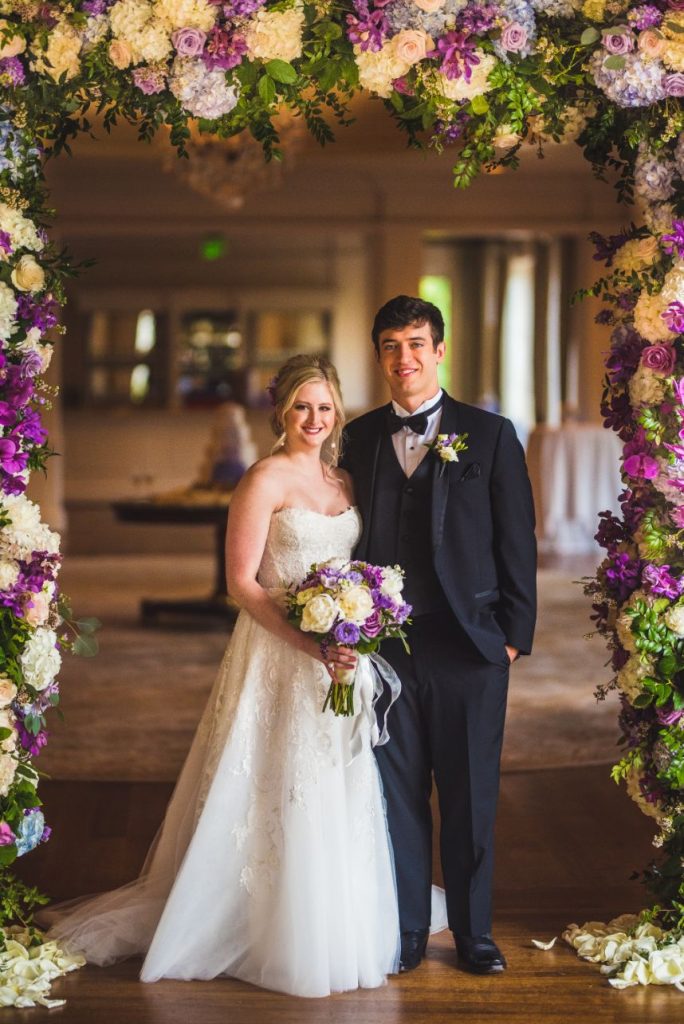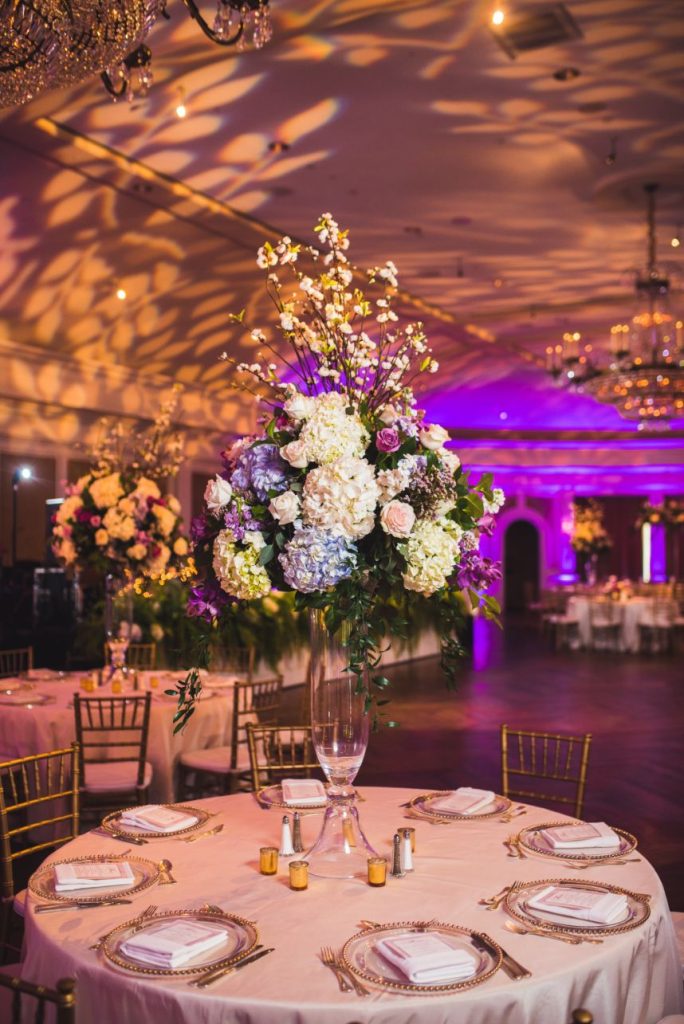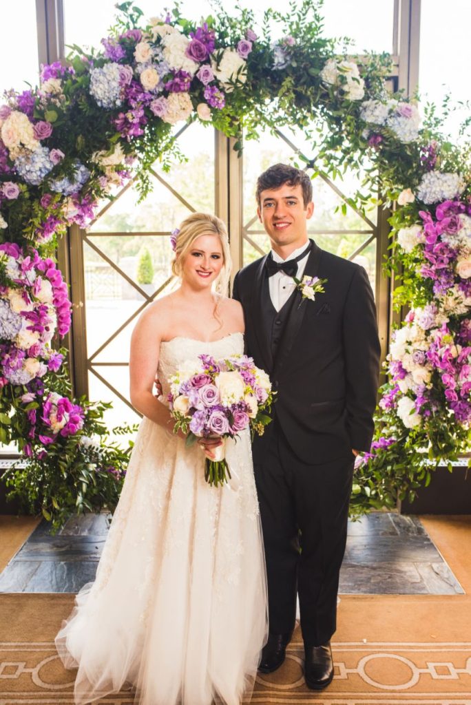 Luxury is in no short supply in this floral wedding that showcases the dreamiest palette and the absolute most elegance! Leanne and Jon’s story began when they met through mutual friends one night out on the town. Leanne says she laughs thinking back now because her first impression of Jon was that he was rude, but when he kept coming around she quickly changed her mind. Jon decided to pop the question one night when the pair went out for an amazing dinner and then on to follow with drinks. When they couldn’t find a waiter to be served, they decided to go for a walk instead, where they stumbled upon a beautiful fountain and Jon got on one knee! The romance of their love translates obviously into their wedding day and Leanne and Jon sent their guests formal wedding invitations with the help of Bering’s personalized stationery, though no guest could have guessed the luxury and grandeur in store for the evening. A regal palette of purples ranging from lilac to aubergine breathes life into every wedding scene of this lush country club wedding and, on that topic, The Senterpiece outdid themselves around every corner of this floral wedding! Leanne and Jon were married in front of an exquisite circular altar installation, and jaw-dropping elevated reception florals were the crowned jewel of these sprawling tablescapes that look absolutely dreamy under saturated mood lighting. From start to finish, we are sure this luxurious floral wedding was a night no one will forget! Keep scrolling to see for yourself and read on for a note from the bride about her favorite wedding day memory, plus what funny suggestion her father gave just before walking down the aisle. Cheers to Leanne and Jon!