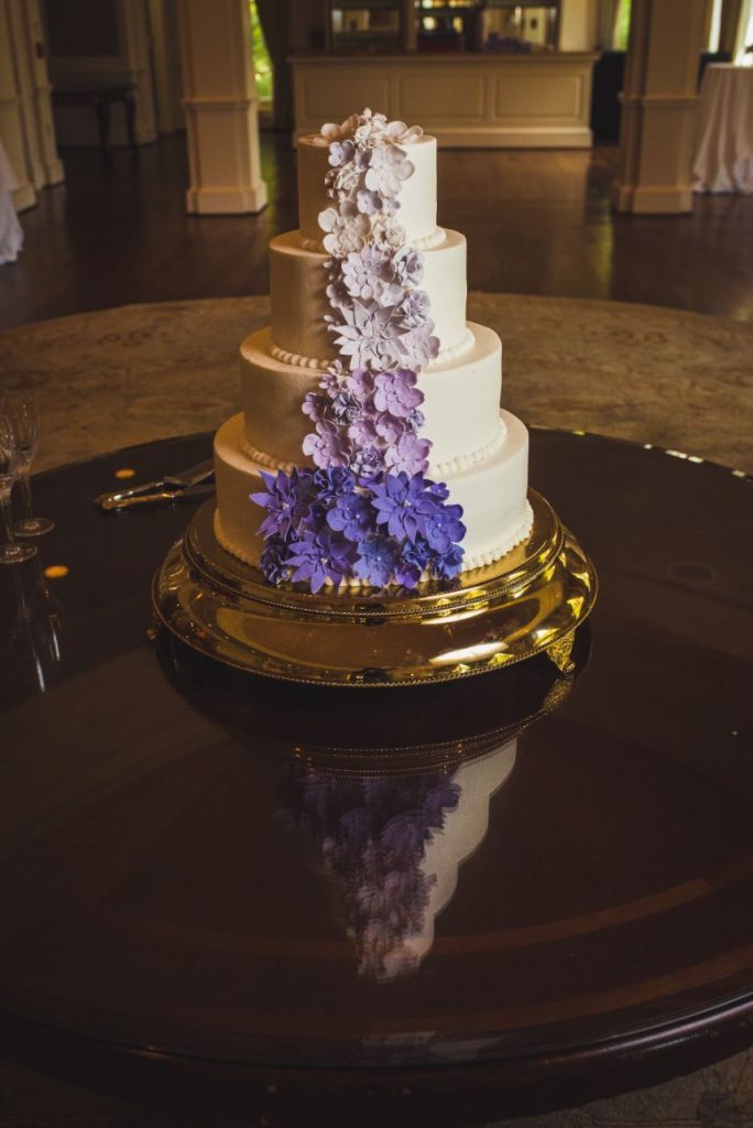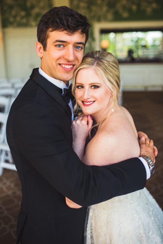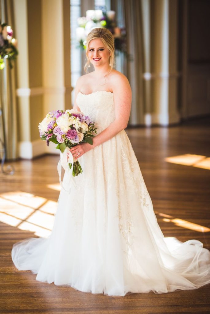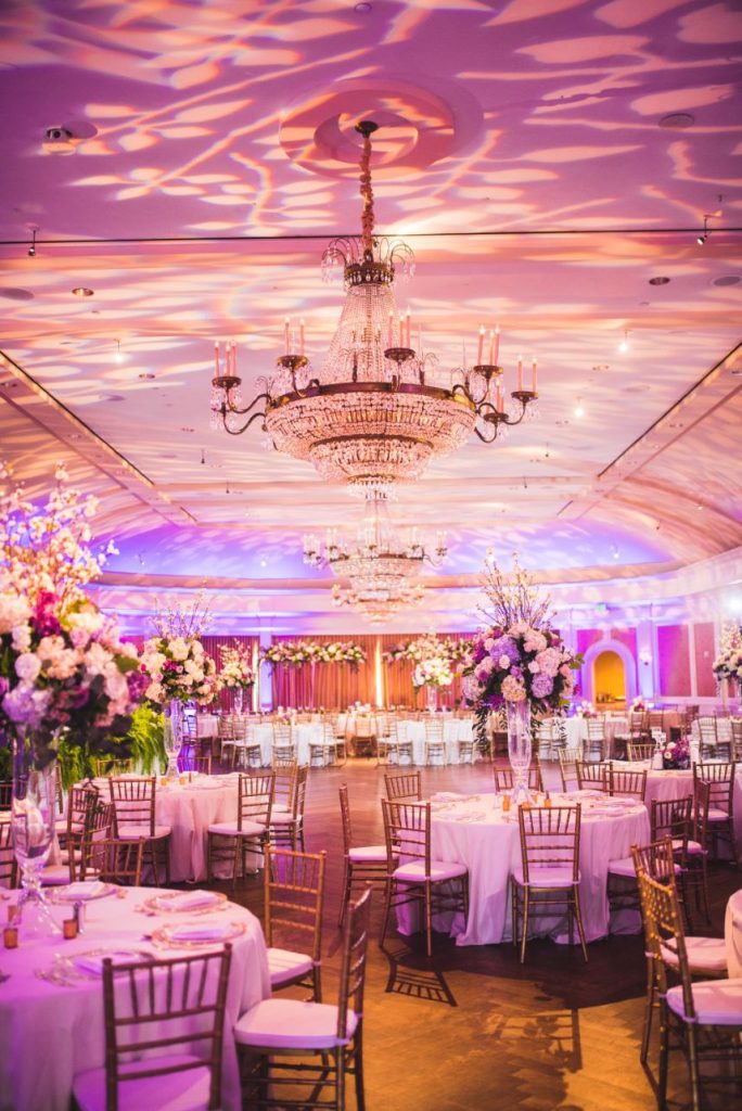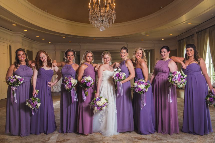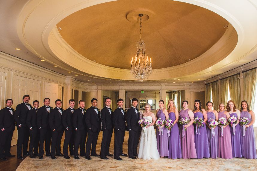 Luxury is in no short supply in this floral wedding that showcases the dreamiest palette and the absolute most elegance! Leanne and Jon’s story began when they met through mutual friends one night out on the town. Leanne says she laughs thinking back now because her first impression of Jon was that he was rude, but when he kept coming around she quickly changed her mind. Jon decided to pop the question one night when the pair went out for an amazing dinner and then on to follow with drinks. When they couldn’t find a waiter to be served, they decided to go for a walk instead, where they stumbled upon a beautiful fountain and Jon got on one knee! The romance of their love translates obviously into their wedding day and Leanne and Jon sent their guests formal wedding invitations with the help of Bering’s personalized stationery, though no guest could have guessed the luxury and grandeur in store for the evening. A regal palette of purples ranging from lilac to aubergine breathes life into every wedding scene of this lush country club wedding and, on that topic, The Senterpiece outdid themselves around every corner of this floral wedding! Leanne and Jon were married in front of an exquisite circular altar installation, and jaw-dropping elevated reception florals were the crowned jewel of these sprawling tablescapes that look absolutely dreamy under saturated mood lighting. From start to finish, we are sure this luxurious floral wedding was a night no one will forget! Keep scrolling to see for yourself and read on for a note from the bride about her favorite wedding day memory, plus what funny suggestion her father gave just before walking down the aisle. Cheers to Leanne and Jon!