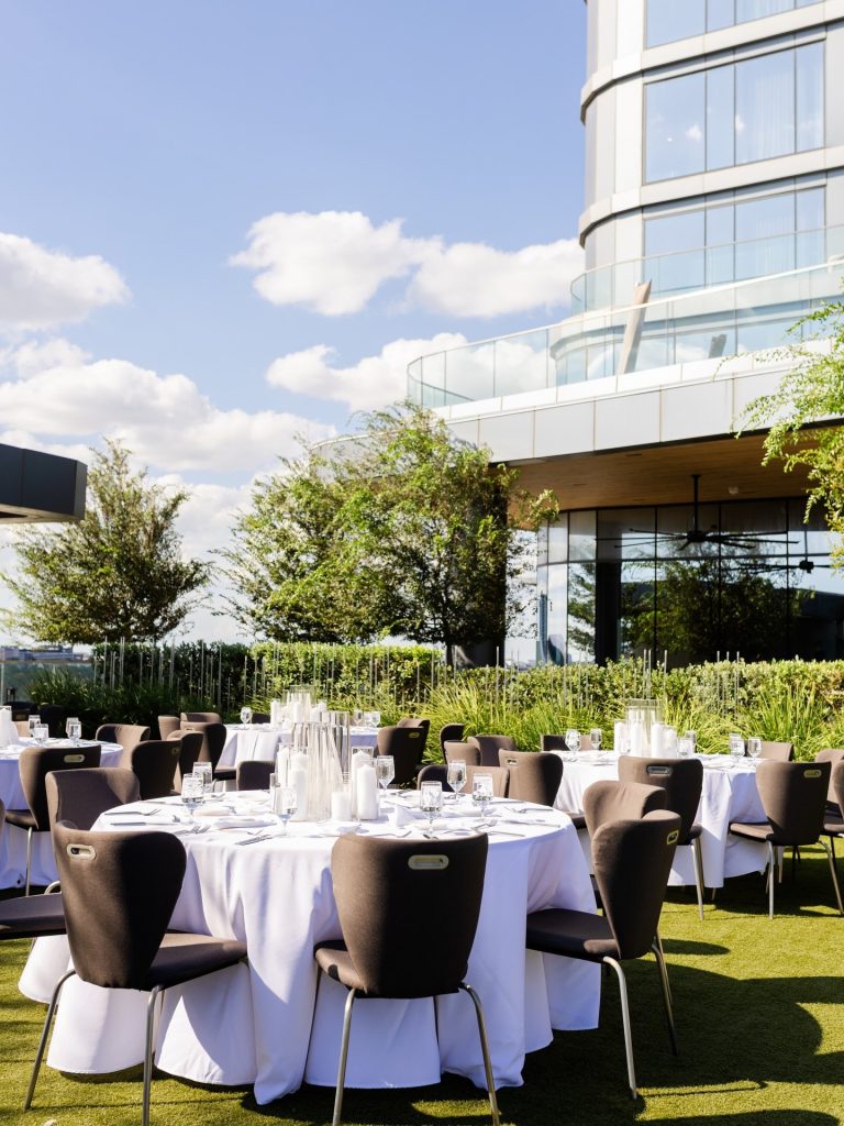 After a sacred ceremony, the celebration moved to an outdoor reception shared with their immediate family and closest friends. The day was planned by Lovely Events to be just as intentional as Maria envisioned, keeping the focus on their inner circle and the city stretching out behind them.