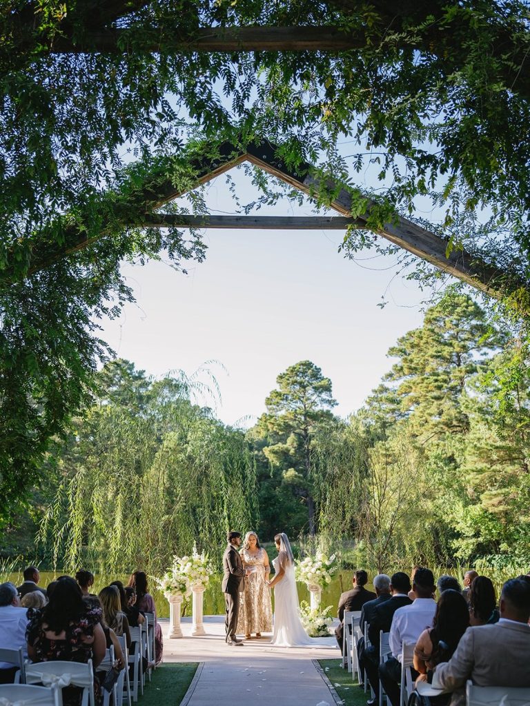 Marissa & Joel’s day at Forever 5 Events featured an outdoor ceremony set beneath soaring arches overlooking the lake, framed by weeping willows, followed by a bright, lively reception filled with dinner, drinks, and dancing.