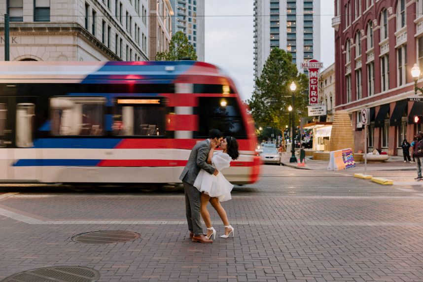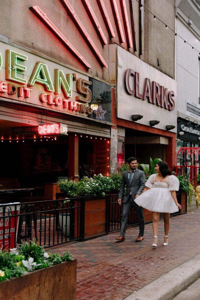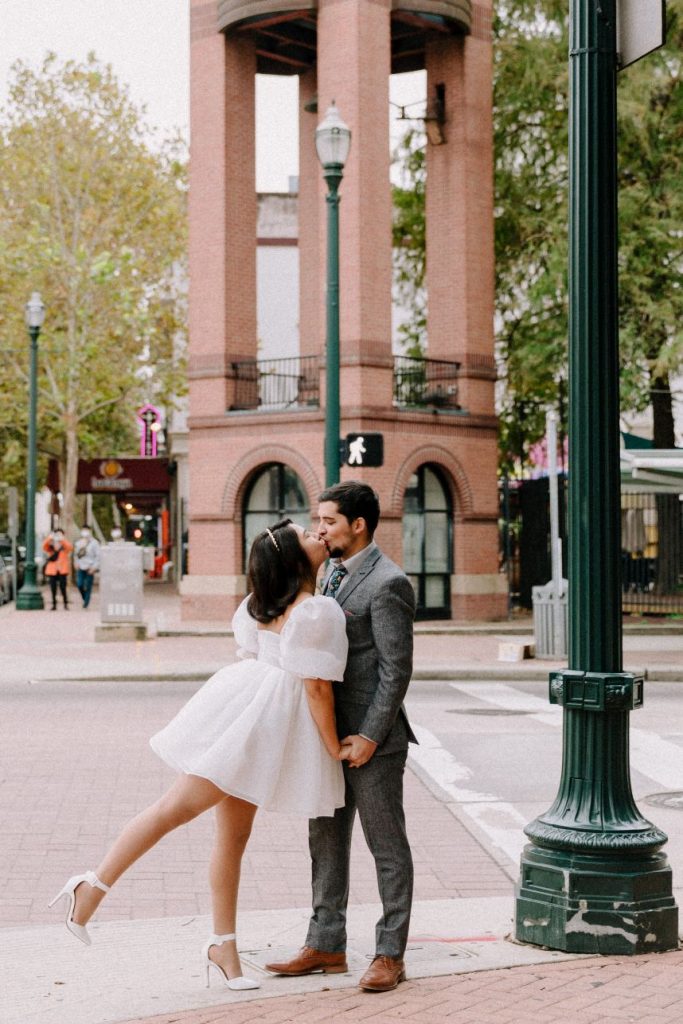 This sweet couple is starting their journey to “I do” with a modern downtown Houston engagement session captured by the talented Natalie Nicole Photo that totally tugs at our heartstrings and it’s one that’s been a long time coming, too! Mayra Salazar and Jesus Mendoza first met in high school, and the two were friends from their senior year until they finally started dating four years after high school graduation. Mayra says Jesus was always so nice to her, so eventually falling in love just came naturally to the pair. When the time felt right to pop the question, Jesus took Mayra out for brunch at her favorite spot to get macarons and was acting very nervous. Because of this, and picking out her ring prior to that day, she says she knew what was coming! She, of course, said yes! Since the soon-to-be bride didn’t want a big surprise proposal, she says it was “very casual and us.” Mayra and Jesus will be tying the knot before the end of 2023 with just close friends and family present and we can’t wait to see what the future has in store for this precious couple or their wedding to come after this modern downtown Houston engagement session. Cheers!