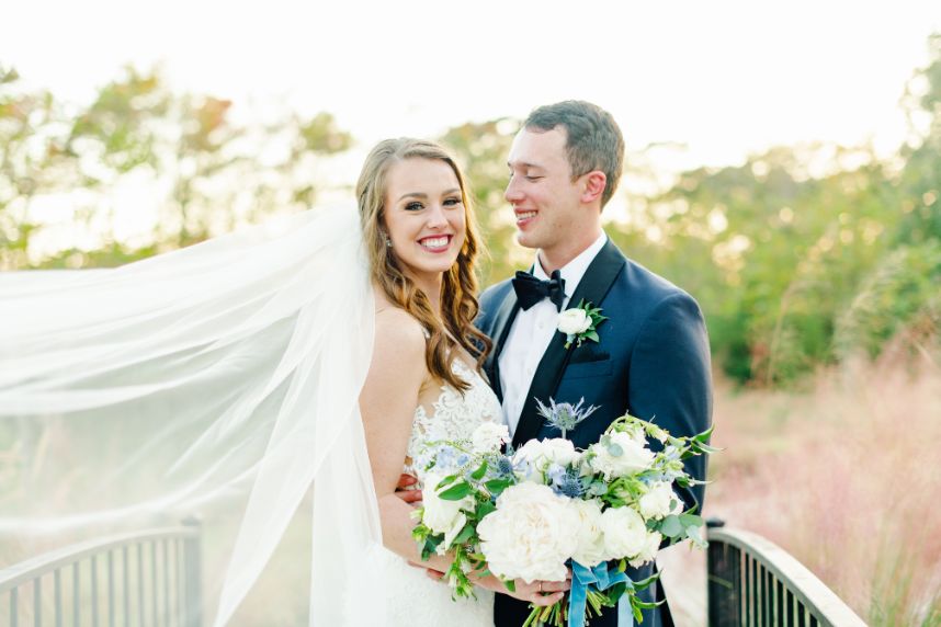 Courtney and Nicholas’ modern farmhouse wedding was truly a dream come true. The couple’s natural, airy wedding with classy touches of dusty blue hues was filled with laughter, a few tears, and lots of smiles. One of the bride’s favorite memories from her special day was when she got to enjoy an intimate blind first look with Nicholas moments before the ceremony where she could feel her nerves “melt away” as they read their personal vows. Courtney’s lace bridal gown from Brickhouse Bridal was beautifully complemented with a bouquet tied in blue ribbon donning sentimental family photo charms. The couple danced the night away with the people they love most, but made sure to enjoy one last private dance before going out for their grand sparkler exit. To top it all off, Reverent Wedding Films captured their special day with a video that they will cherish forever. Cheers to the new Mr. and Mrs. Boyd and the years to come!