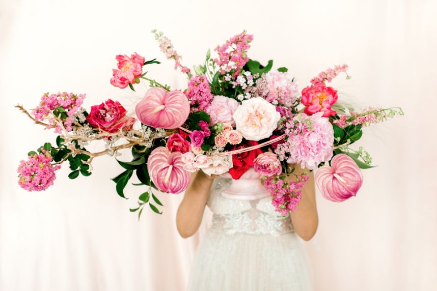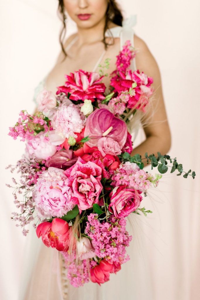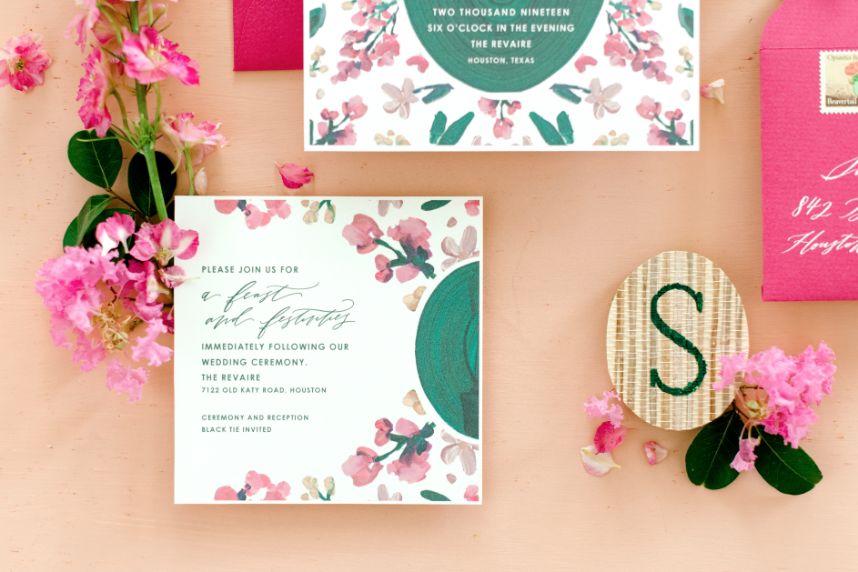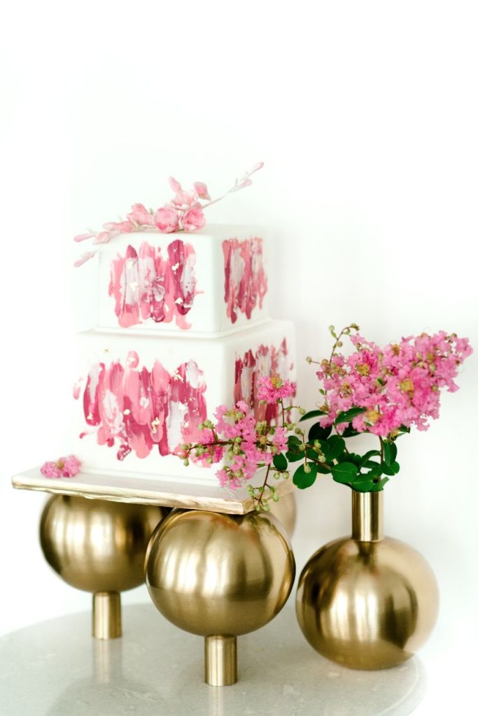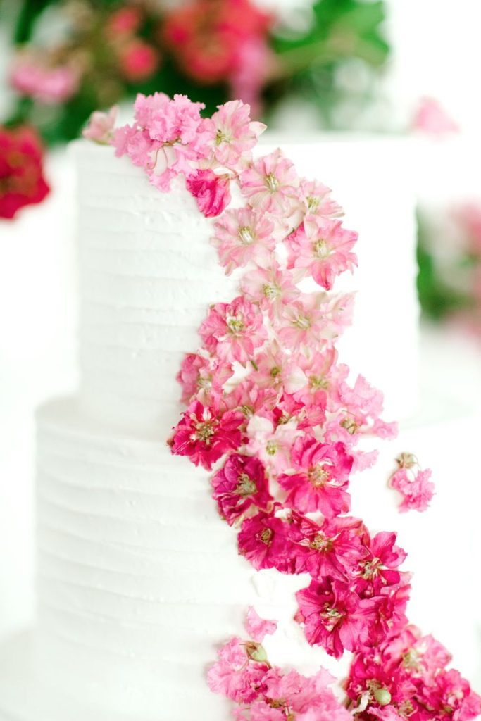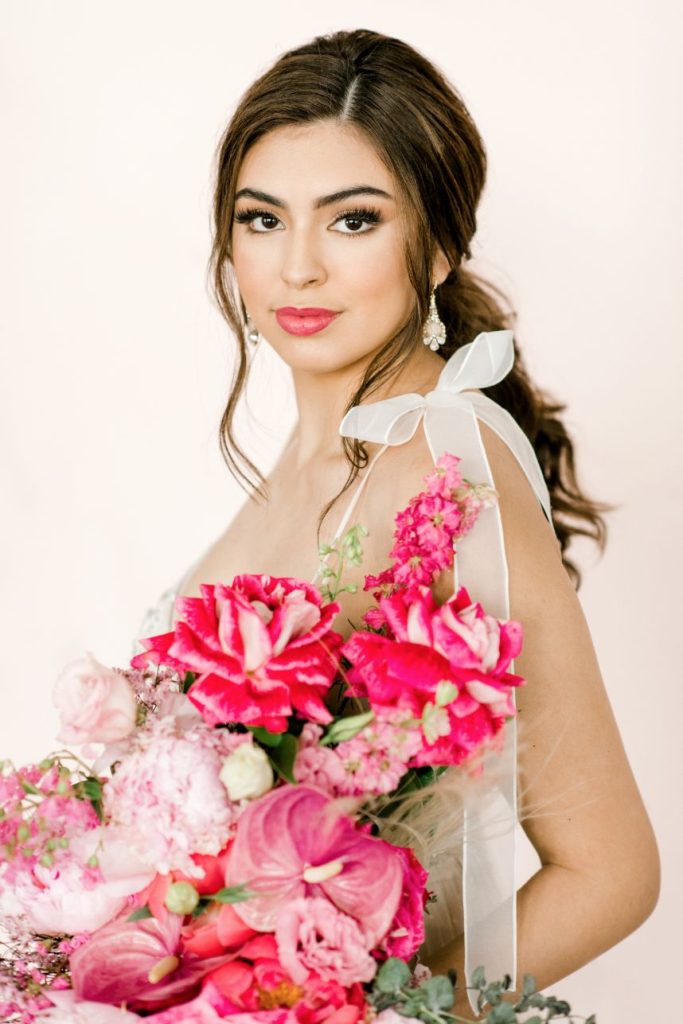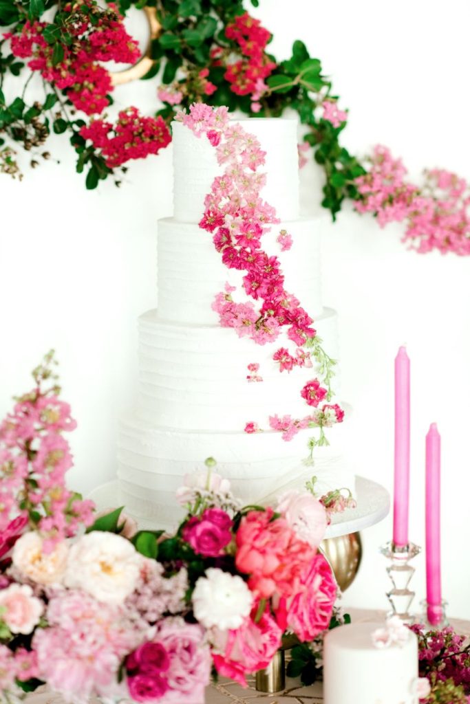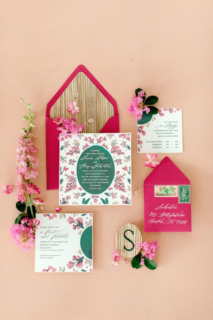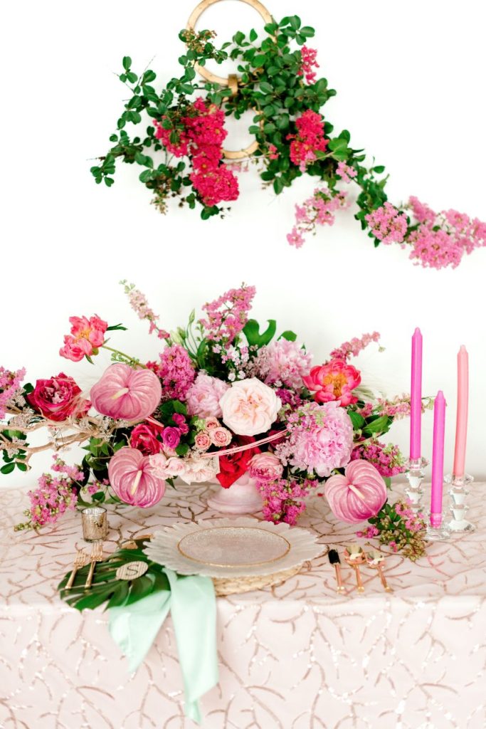 Get ready to obsess over this oh-so-lovely design… This modern hacienda styled shoot at The Revaire is unmatched in hue and lush detail. Have you ever seen a more stunning bouquet? Mibellarosa incorporated varying shades of pink and fuchsia to create a tropical, blossoming scene of florals. A tiered cake from Cakes by Gina was laden with flowers to match, delicately climbing to the very top. Stephen Grace Atelier provided a gown that emulated youth and effortless beauty. With hair and makeup finessed by Etoilly Artistry, the completed bridal look was stunning. A glittering tablescape from Lavish Linens featured beachy textiles and elegant china. A florescent invitation suite by Half Moon Lettering added to the modern, beach vibes with cane detailing. The Revaire was most photogenic space for this modern hacienda with their clean walls and bright spaces, captured by Kati Hewitt Photography. Cheers to this FAB inspiration!