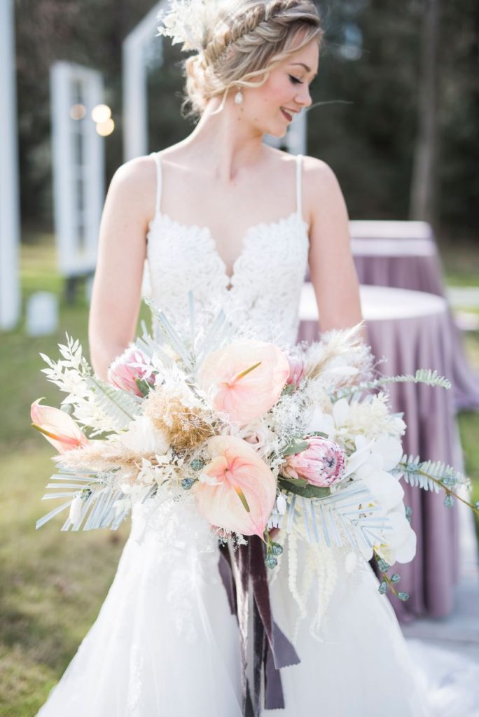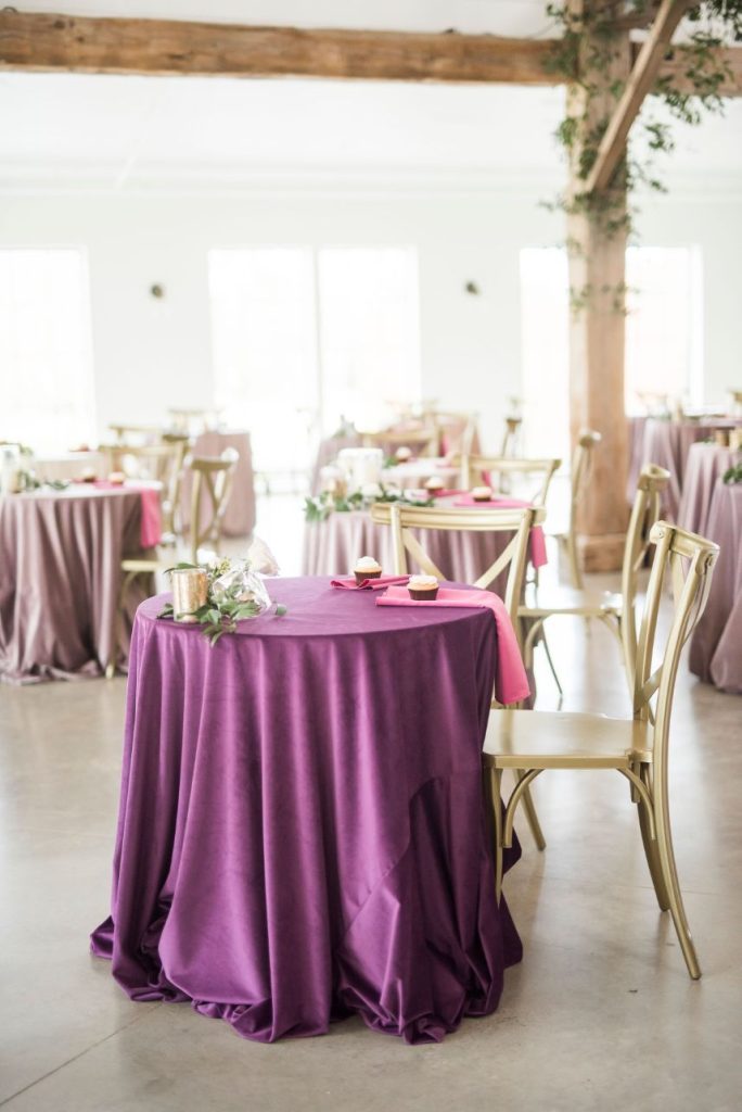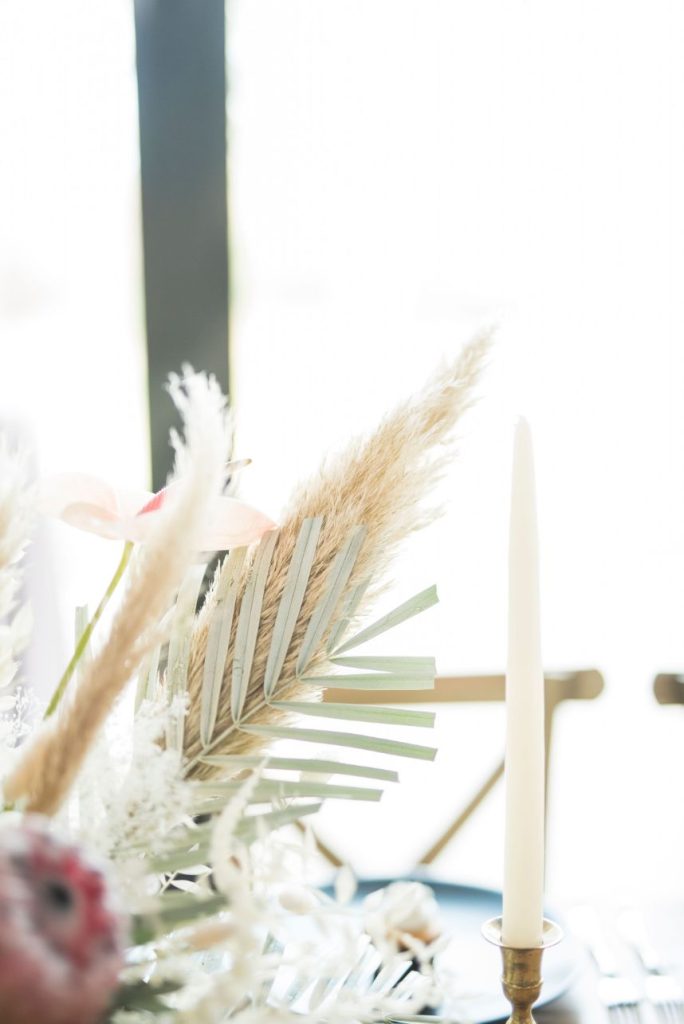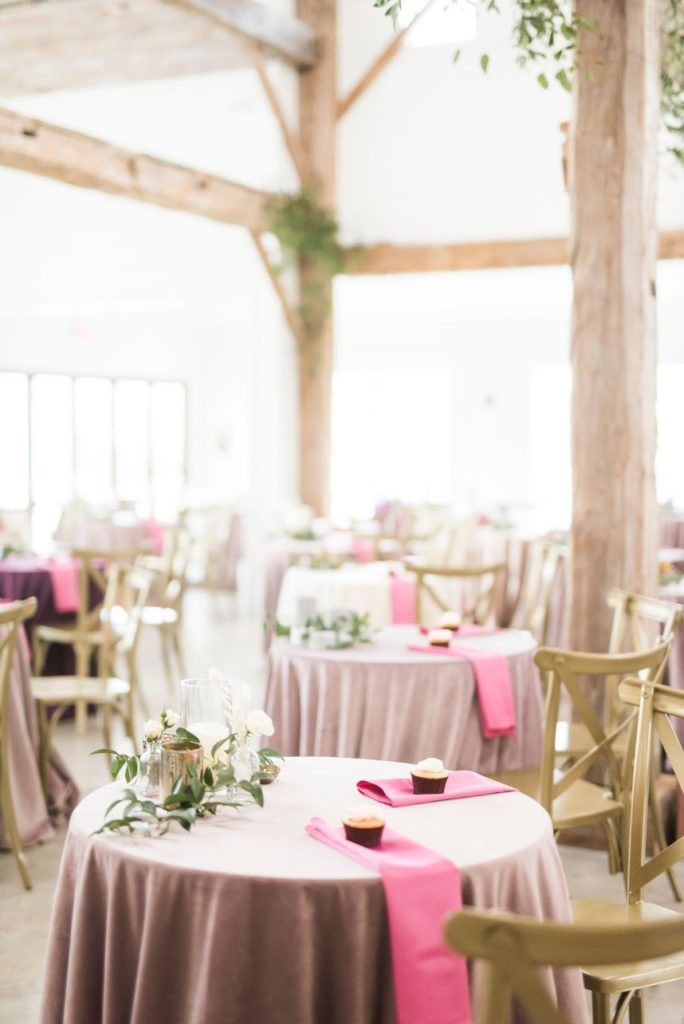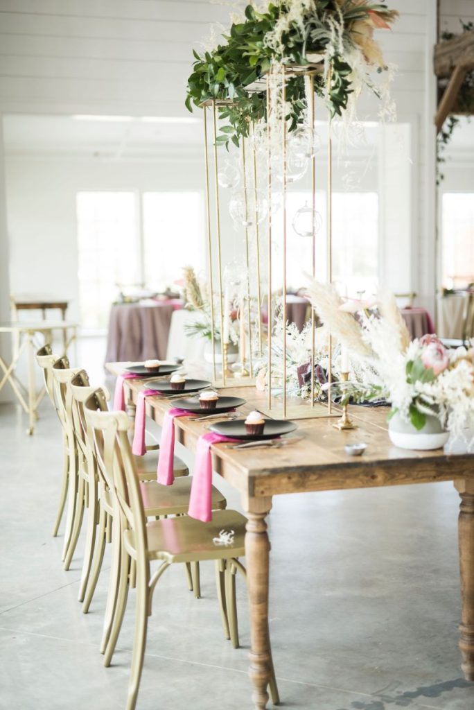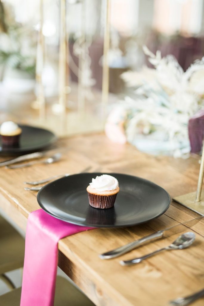 Dried palm is quickly becoming one of the hottest wedding trends, and in this modern Palm Springs inspired scene, we can totally see why! An early springtime aesthetic combines muted jewel tones of mauve and pink along with earthy shades like taupe and faded green, all work beautifully in tandem with each other to make The Meekermark pop with color and texture galore! For this special event, Epoch Co+ designed a regal head table as the centerpiece of the room, flanked by colorful tables, a combo of ghost chairs and wooden seating and modern geometric accent pieces. The model bride for the day wore an ultra flattering strappy gown from Brickhouse Bridal, with an open back and deep lace V-neck above a flowy A-line tulle skirt. Who says wedding desserts have to be fancy? Sometimes simple favorites do the trick. Guests enjoyed cupcakes and cotton candy for dessert as the DJ from LG Event Pro kept the entertainment lively all evening long. Overall, the unfussy, simple design of this space allows the colors and textures of the modern Palm Springs-inspired decor and florals to shine.