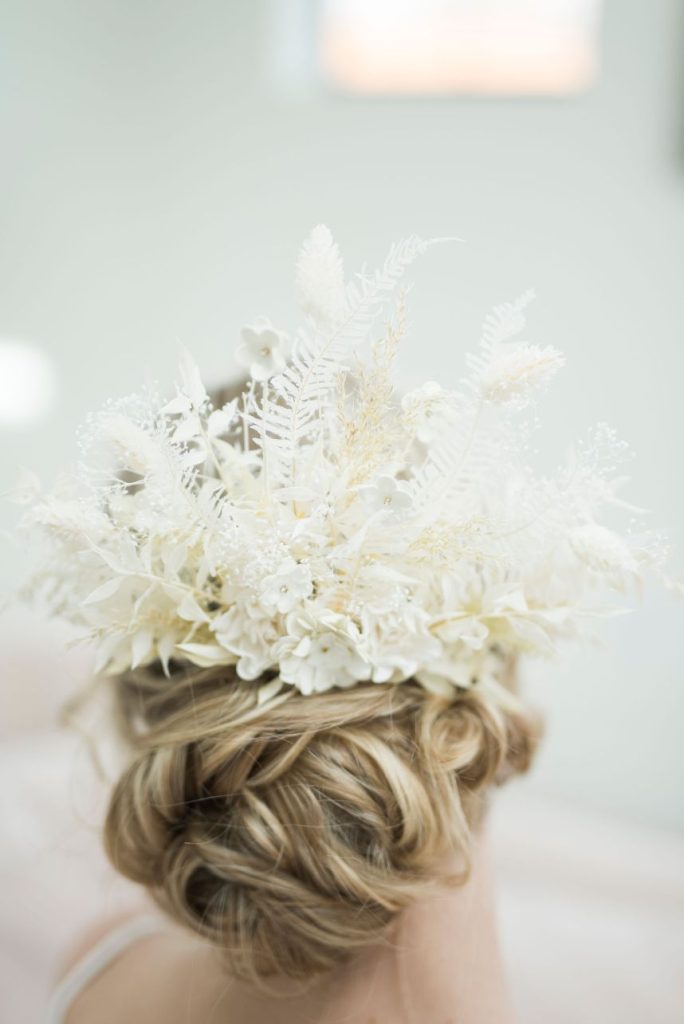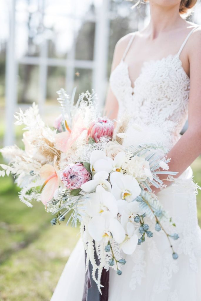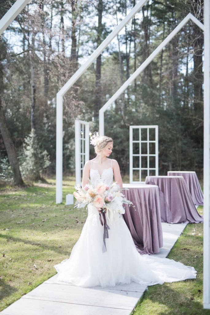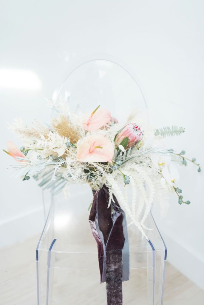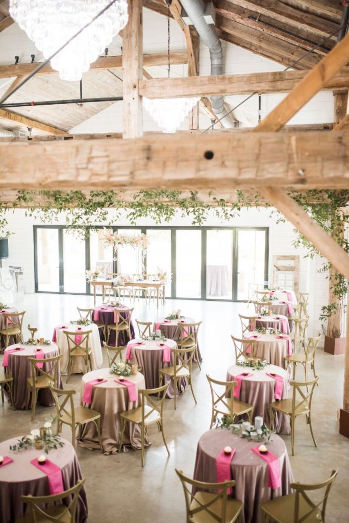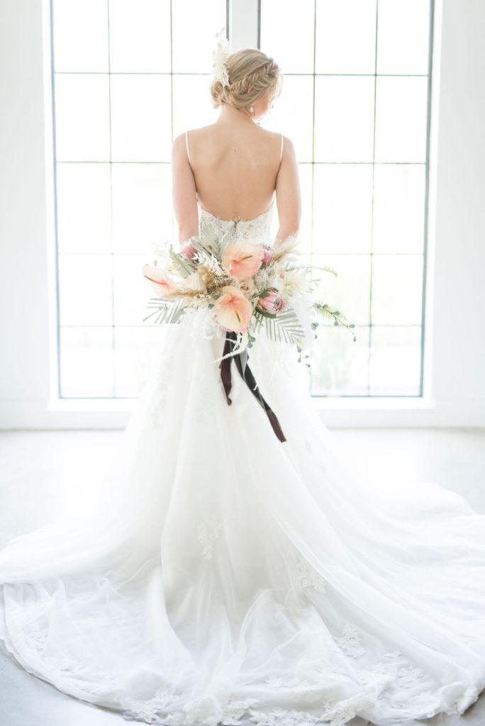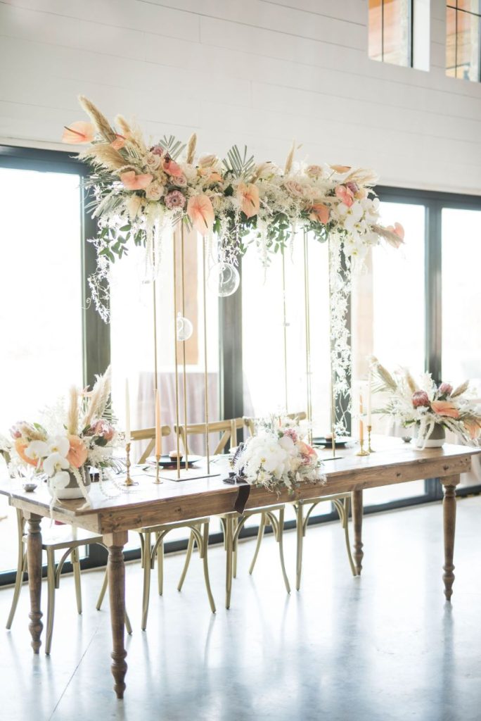 Dried palm is quickly becoming one of the hottest wedding trends, and in this modern Palm Springs inspired scene, we can totally see why! An early springtime aesthetic combines muted jewel tones of mauve and pink along with earthy shades like taupe and faded green, all work beautifully in tandem with each other to make The Meekermark pop with color and texture galore! For this special event, Epoch Co+ designed a regal head table as the centerpiece of the room, flanked by colorful tables, a combo of ghost chairs and wooden seating and modern geometric accent pieces. The model bride for the day wore an ultra flattering strappy gown from Brickhouse Bridal, with an open back and deep lace V-neck above a flowy A-line tulle skirt. Who says wedding desserts have to be fancy? Sometimes simple favorites do the trick. Guests enjoyed cupcakes and cotton candy for dessert as the DJ from LG Event Pro kept the entertainment lively all evening long. Overall, the unfussy, simple design of this space allows the colors and textures of the modern Palm Springs-inspired decor and florals to shine.
