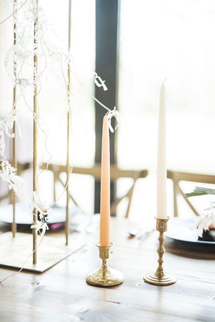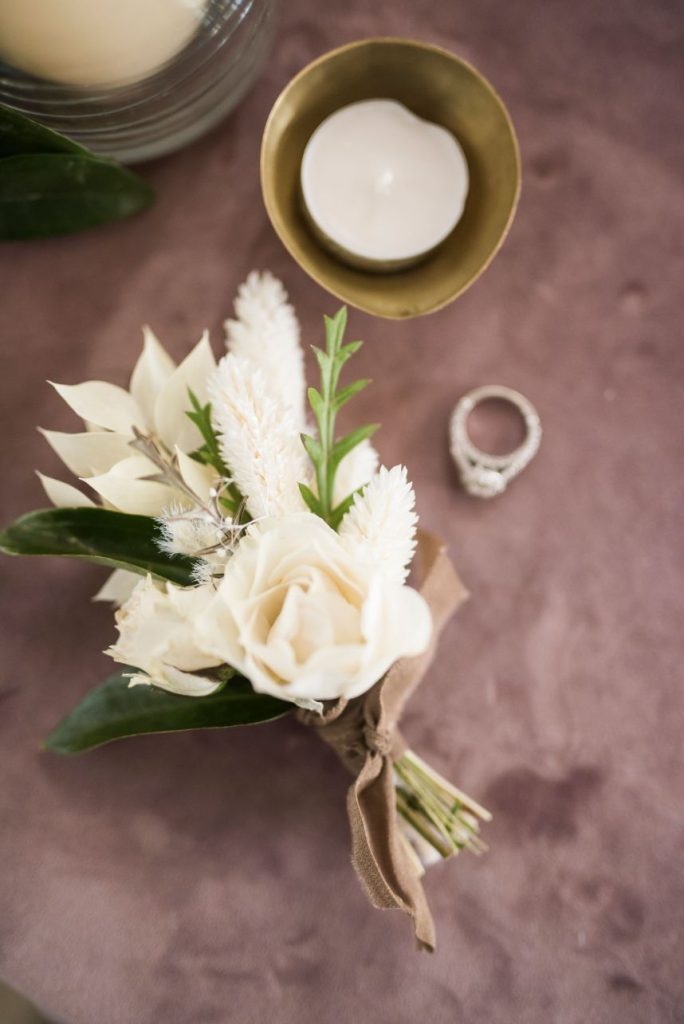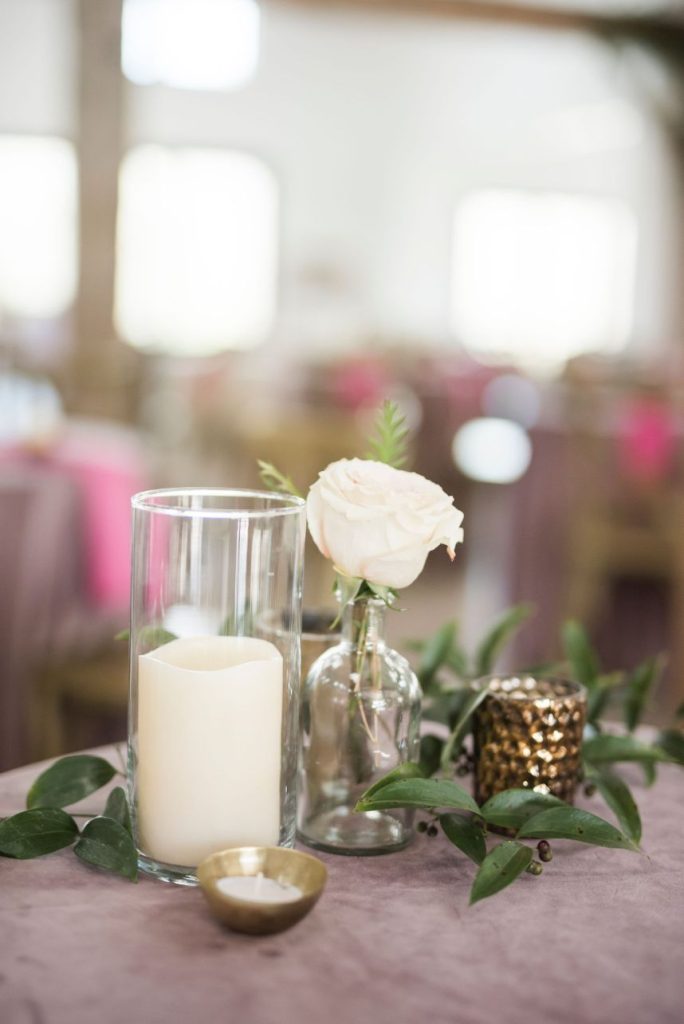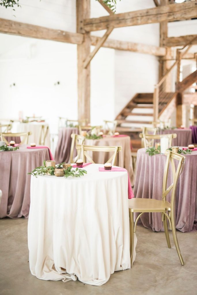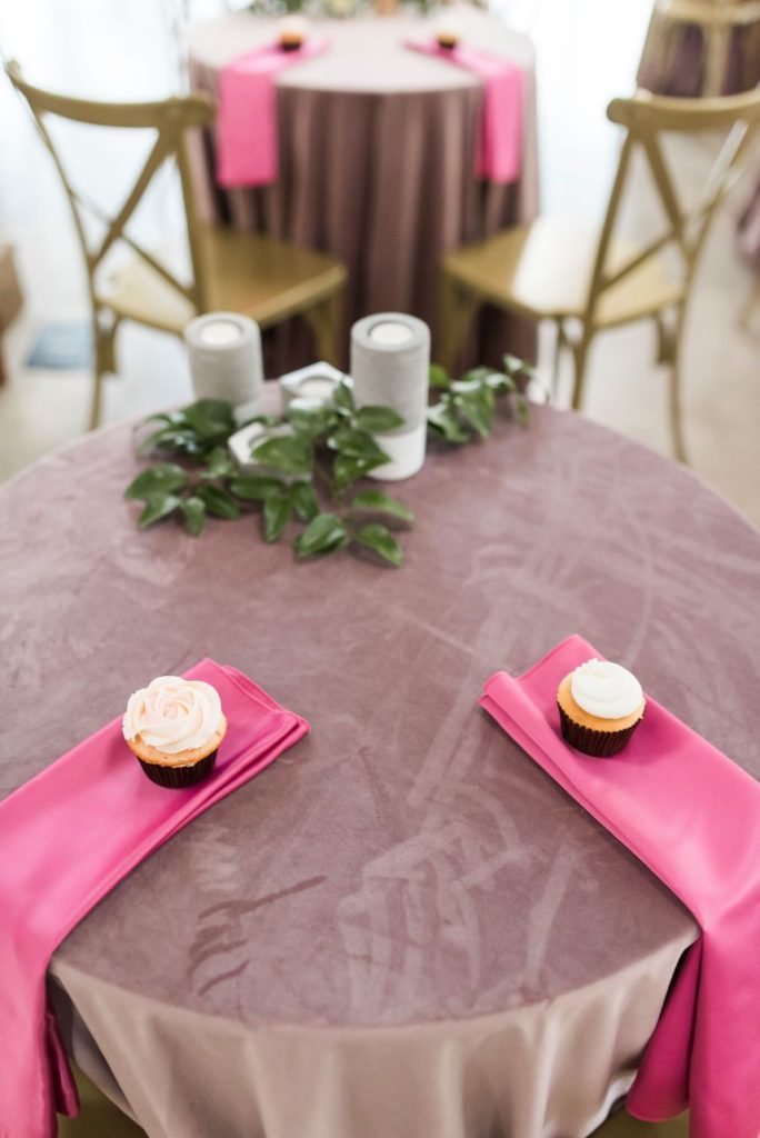 From the planner: “We had the honor of designing The Meekermark‘s Date Night this last Valentines Day. We opted to go for a Modern Palm Springs Romance Design. We had a head table staged for couples to view and a model bride. This design had an emphasis on white and bleached florals with a pop of blush and mauve. For guest tables we focused on rich velvet linens in mauve and cream with pops of amethyst purple. We added in a few satin linens in a muddy taupe color to complement the earthy tones of the venue. Guest table decor was simplistic. Bright pink napkins were added as a vibrant addition to the Valentine’s Day occasion, and cupcakes by Truly Scrumptious awaited each guest. Decor on the tables had a focus on ambiance with various candle elements and pops of greenery or bud vases. To keep with the modern vibe, we had a mix of concrete and geo glass bud vases intermingled with mercury glass votives. A stellar team of vendors spoiled the couples for a fabulous night of fun, celebrating LOVE.”