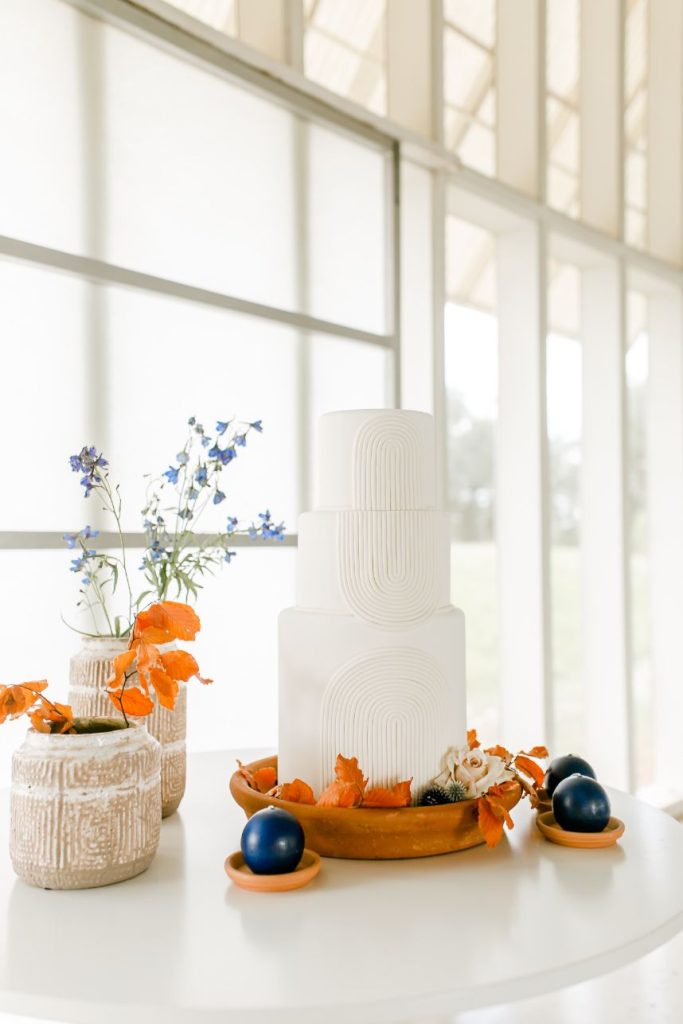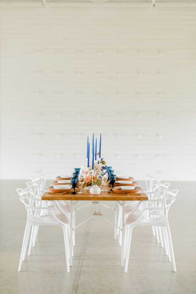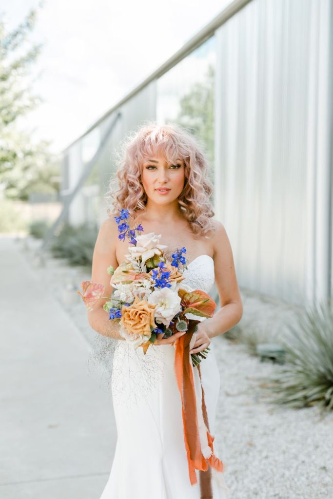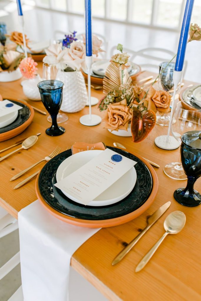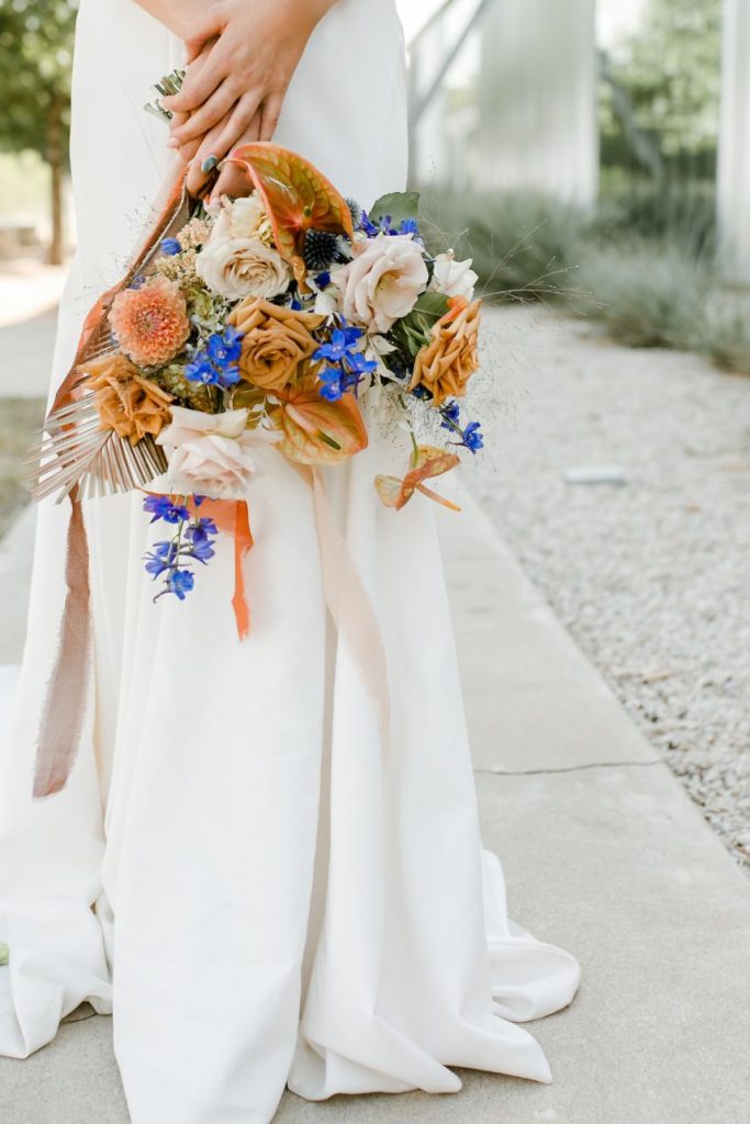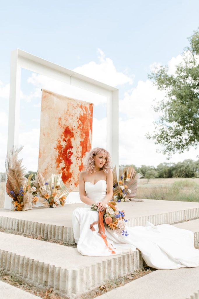 Terracotta, cobalt and coral work in unison to create this breathtaking modern Southwest wedding inspiration planned and designed by R&J Events! Thoughtfully styled with elegant and bohemian elements alike, this Southwestern-inspired tablescape includes terracotta clay chargers housing black marbled dinnerware, simplistic white candlestick holders holding bright blue accenting taper candles, blue glass goblets and gold flatware contrasting with a raw wood table and mod white linens. This bride models a stunning strapless trumpet gown from Modern Affinity featuring simplistic, clean lines and a chic belt detail that add a modern touch to the rustic setting that is this ceremony setup – dried florals around a cowhide altar atop a cement platform all juxtapose beautifully alongside one another. We can’t wait to cut into the jaw-dropping white, piped arch cake seen below! Keep scrolling to see this modern Southwest wedding inspiration play out for yourself. Cheers!