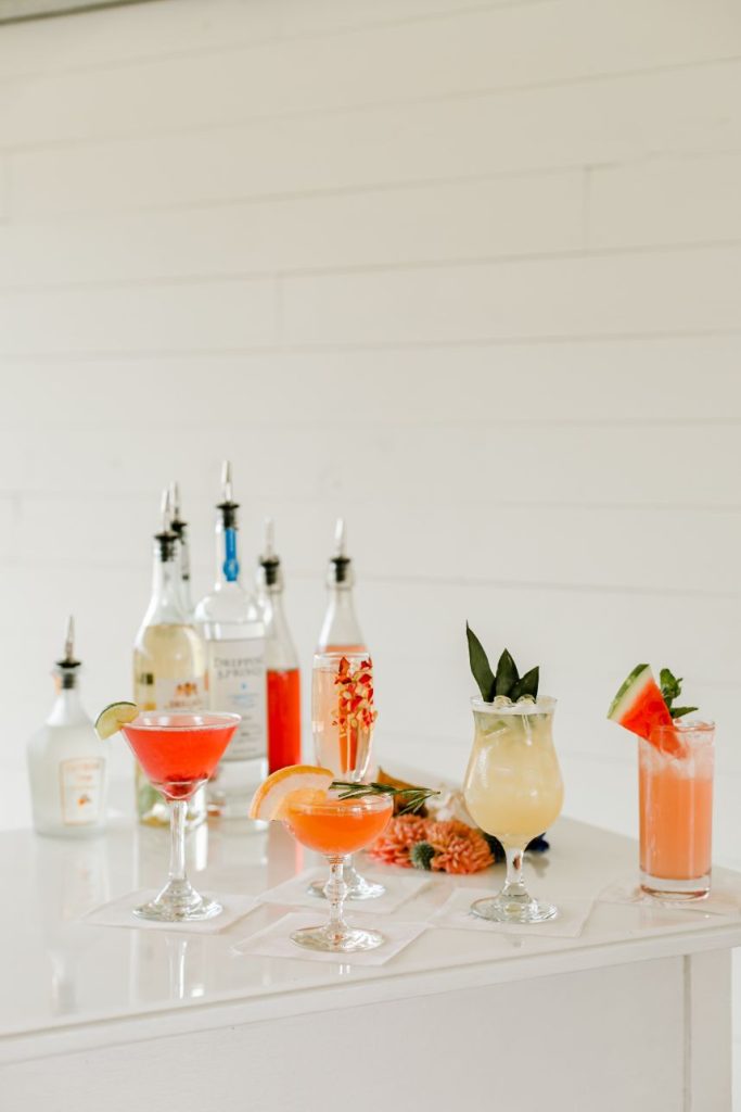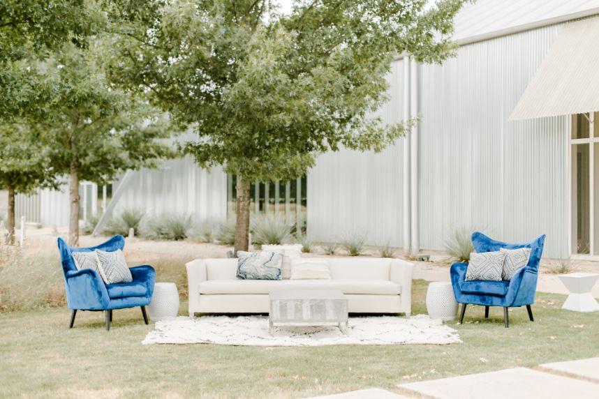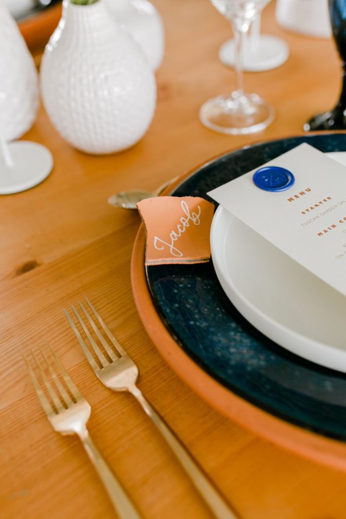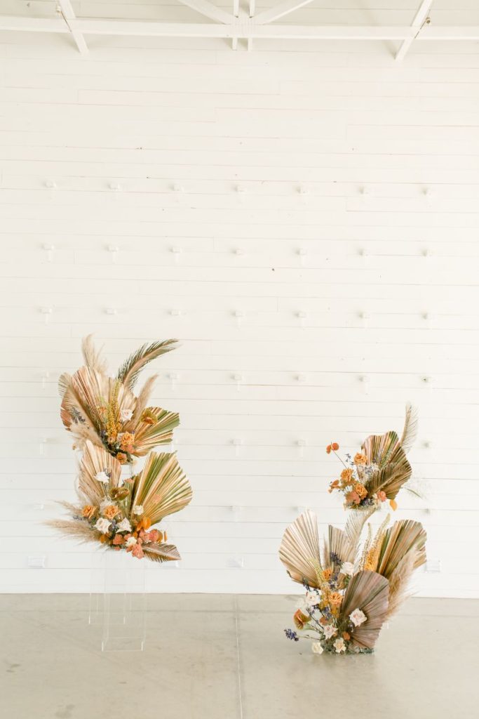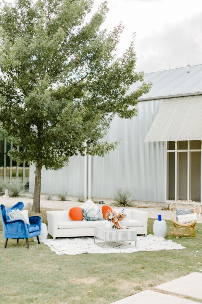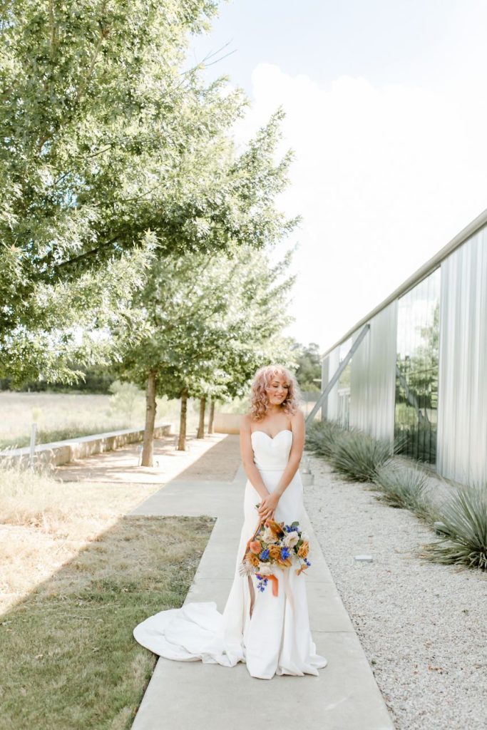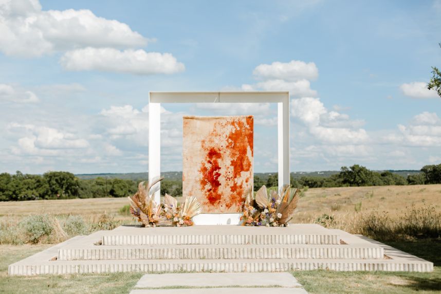 Terracotta, cobalt and coral work in unison to create this breathtaking modern Southwest wedding inspiration planned and designed by R&J Events! Thoughtfully styled with elegant and bohemian elements alike, this Southwestern-inspired tablescape includes terracotta clay chargers housing black marbled dinnerware, simplistic white candlestick holders holding bright blue accenting taper candles, blue glass goblets and gold flatware contrasting with a raw wood table and mod white linens. This bride models a stunning strapless trumpet gown from Modern Affinity featuring simplistic, clean lines and a chic belt detail that add a modern touch to the rustic setting that is this ceremony setup – dried florals around a cowhide altar atop a cement platform all juxtapose beautifully alongside one another. We can’t wait to cut into the jaw-dropping white, piped arch cake seen below! Keep scrolling to see this modern Southwest wedding inspiration play out for yourself. Cheers!