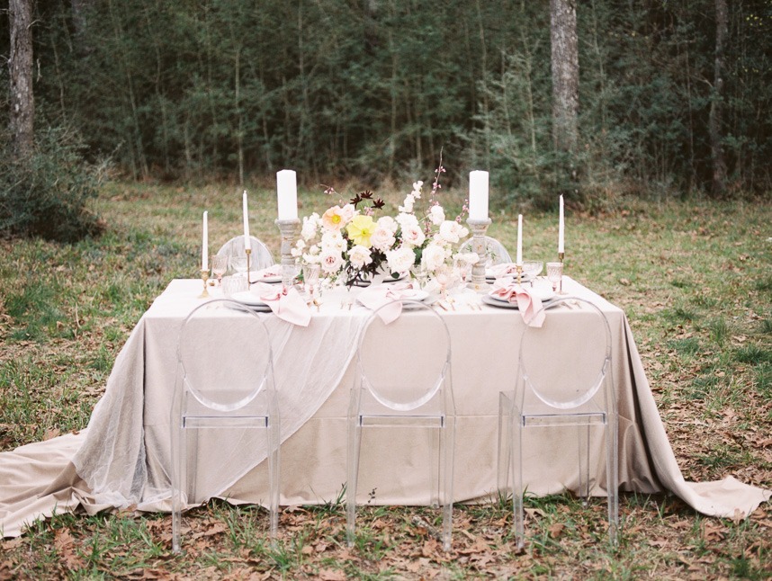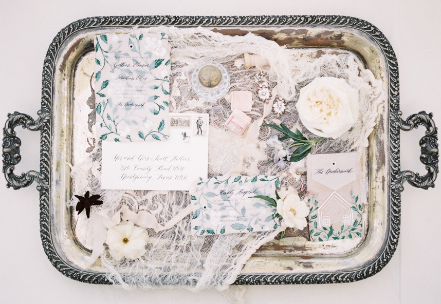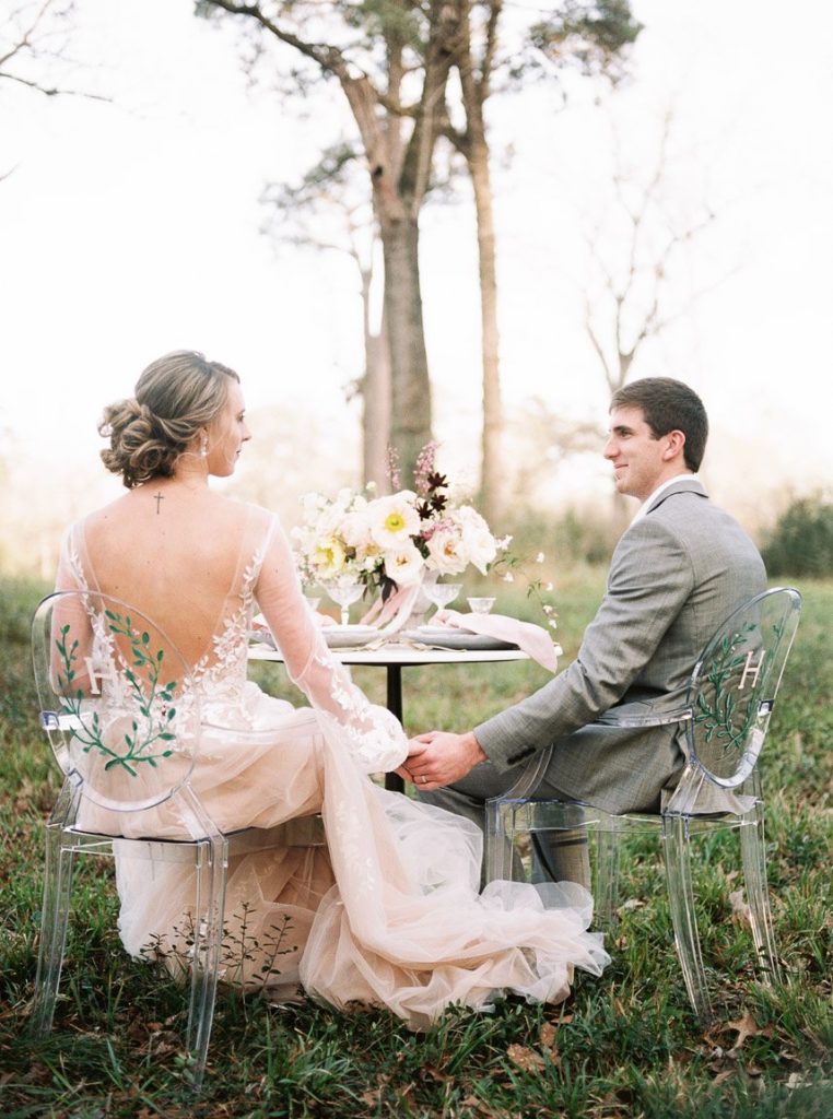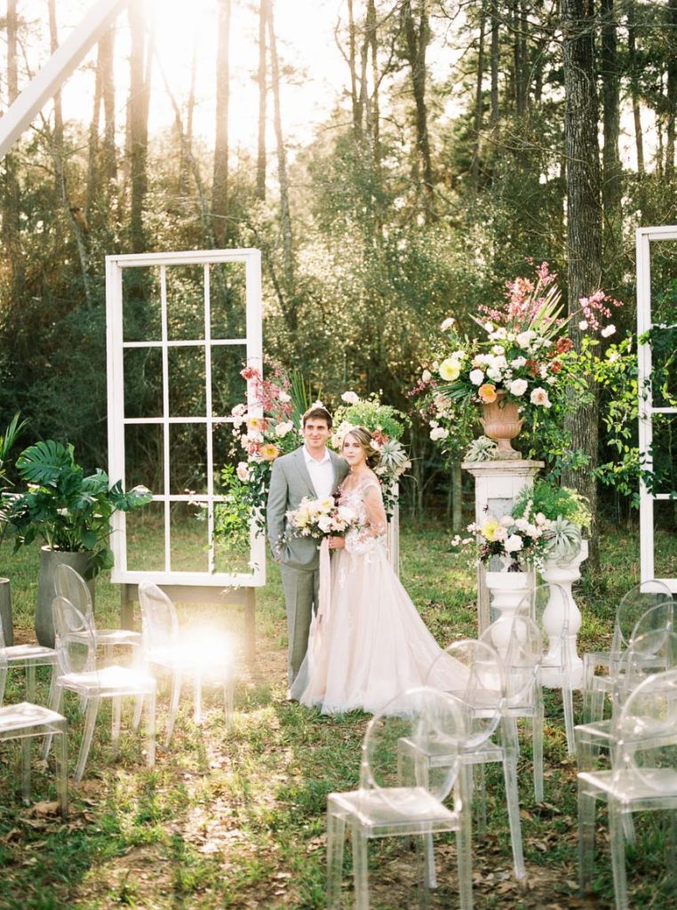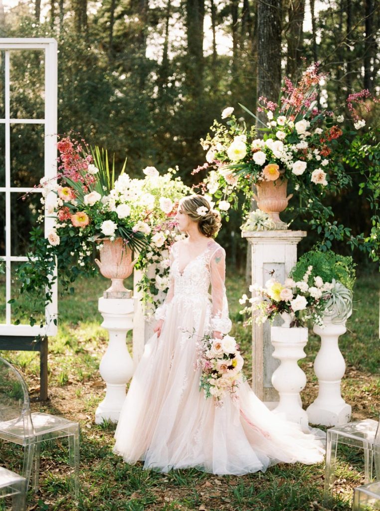 From one of the most unique Houston wedding venues comes this darling modern vintage outdoor wedding inspiration we couldn’t help but share! Captured in a gorgeous ethereal style by Katy Cox Photography, this styled shoot at The Meekermark is a dream come true for any bride who loves a natural, organic wedding with subtle vintage touches and modern elements. This shoot had it all! From hand-painted ghost chairs paired with a more traditional tablescape, to the model’s incredible tulle-skirt gown from Brickhouse Bridal, modern meets vintage in the most beautiful ways. Muted blush and shades of cream give a soft and sweet vibe, while bolder, brighter bouquets overflowing from urns atop regal pedestals make quite the statement in The Meekermark‘s outdoor ceremony area. We’re in love with the gorgeous calligraphy and invitation suite from Half Moon Lettering and the vintage hutch to display the cake. Rentals by EB Inc. Events and Love Birds Vintage Rentals helped set the stage for this woodland-fairy meets modern romantic vision, and we think it comes to life just perfectly here! Happy scrolling!