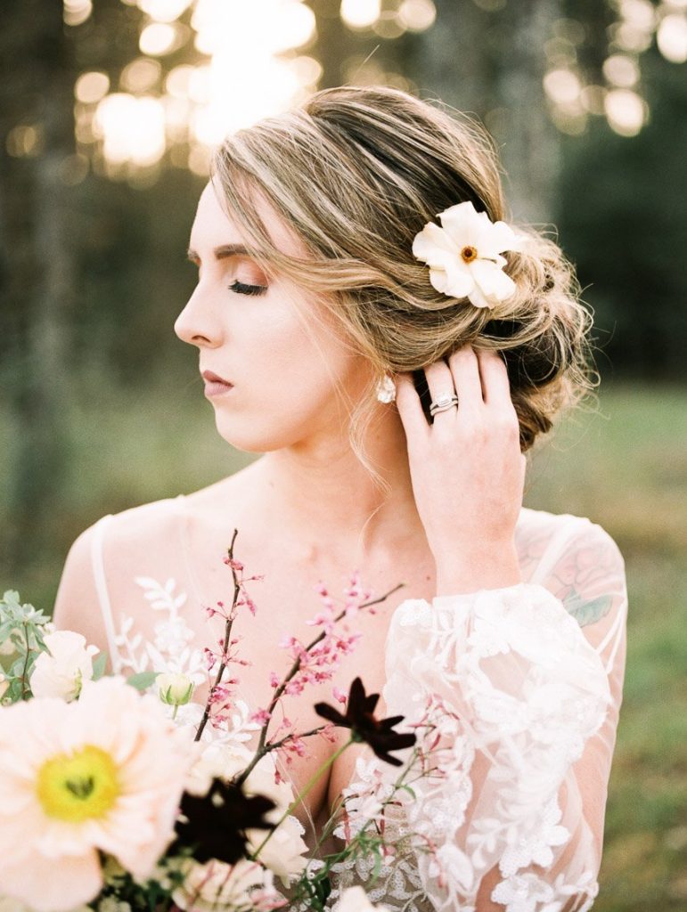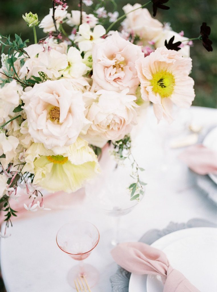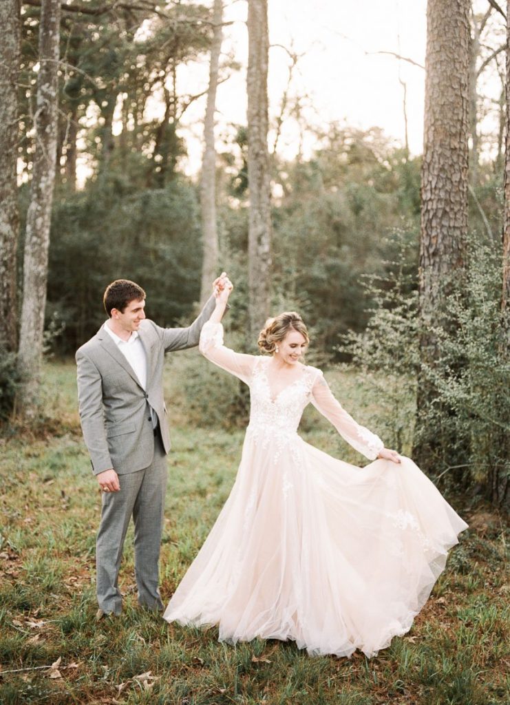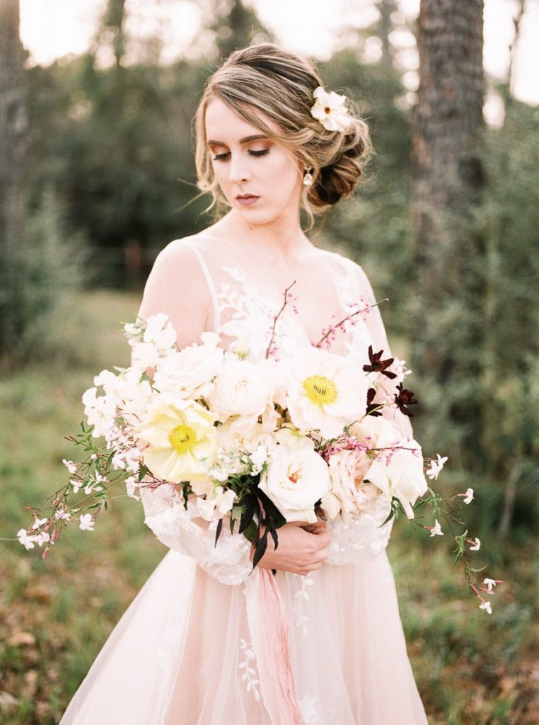 From one of the most unique Houston wedding venues comes this darling modern vintage outdoor wedding inspiration we couldn’t help but share! Captured in a gorgeous ethereal style by Katy Cox Photography, this styled shoot at The Meekermark is a dream come true for any bride who loves a natural, organic wedding with subtle vintage touches and modern elements. This shoot had it all! From hand-painted ghost chairs paired with a more traditional tablescape, to the model’s incredible tulle-skirt gown from Brickhouse Bridal, modern meets vintage in the most beautiful ways. Muted blush and shades of cream give a soft and sweet vibe, while bolder, brighter bouquets overflowing from urns atop regal pedestals make quite the statement in The Meekermark‘s outdoor ceremony area. We’re in love with the gorgeous calligraphy and invitation suite from Half Moon Lettering and the vintage hutch to display the cake. Rentals by EB Inc. Events and Love Birds Vintage Rentals helped set the stage for this woodland-fairy meets modern romantic vision, and we think it comes to life just perfectly here! Happy scrolling!