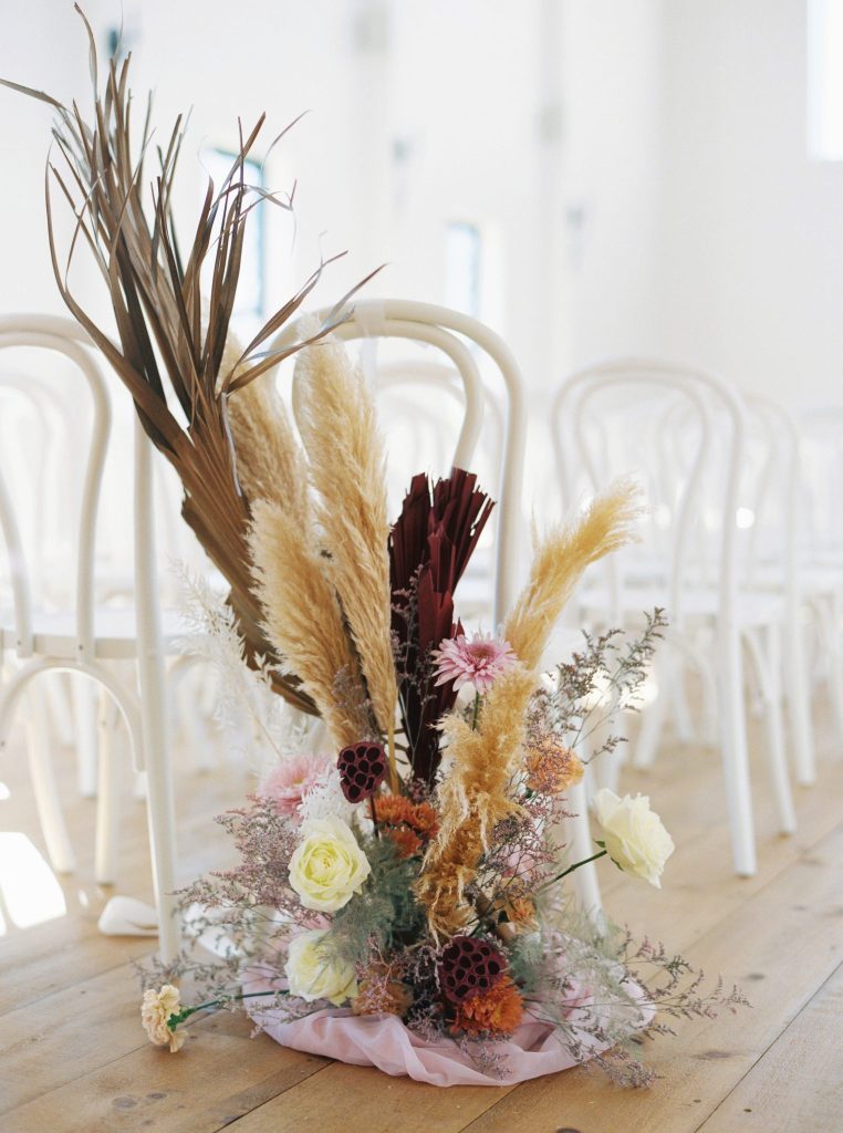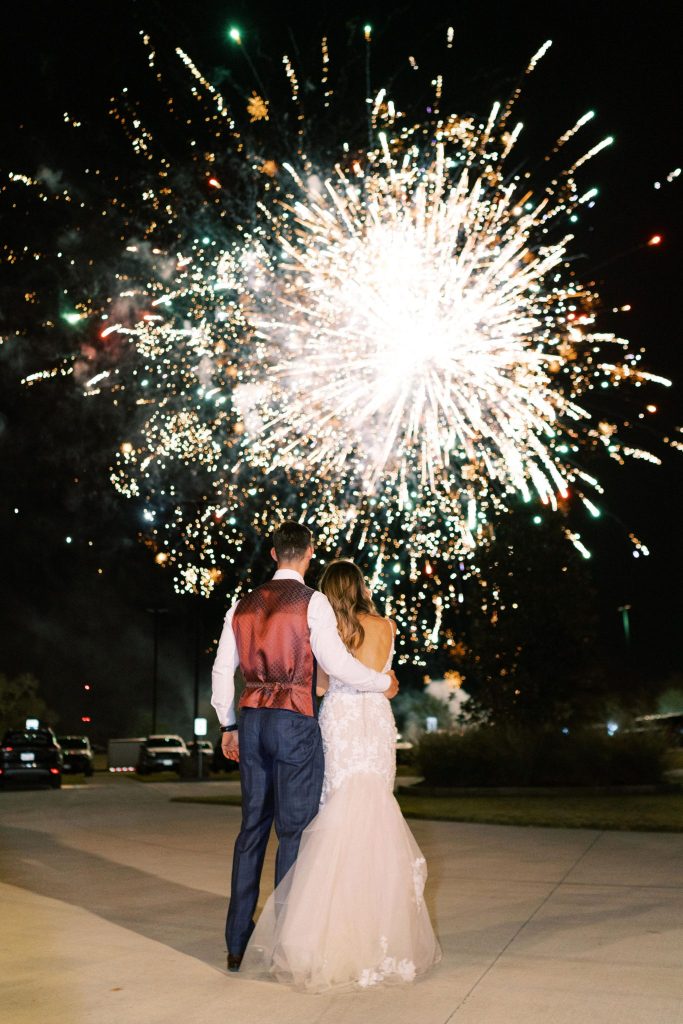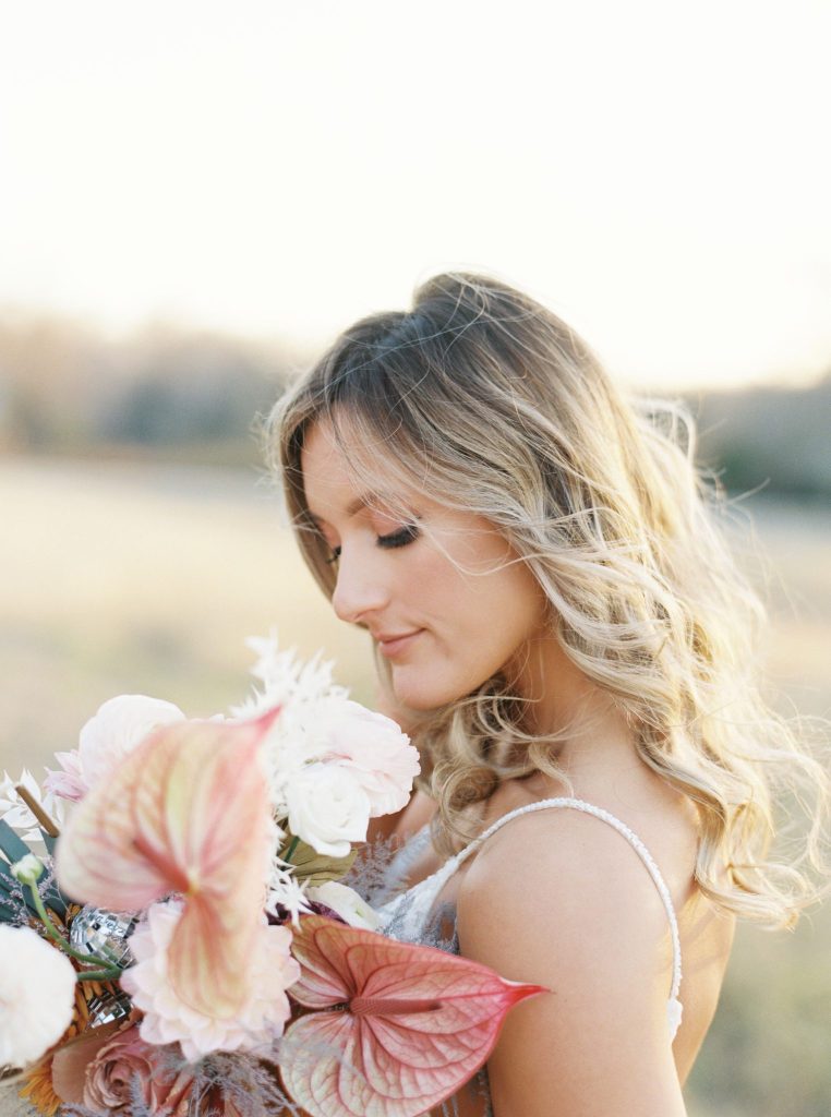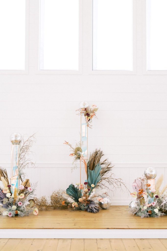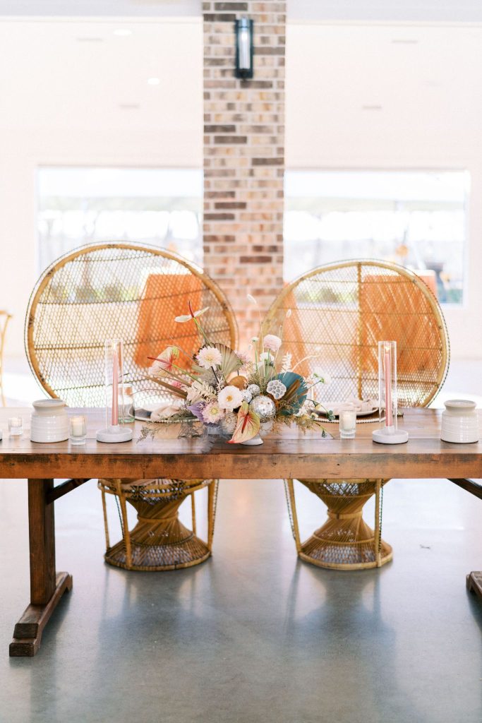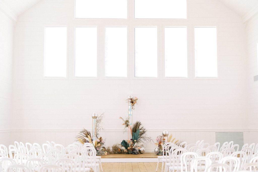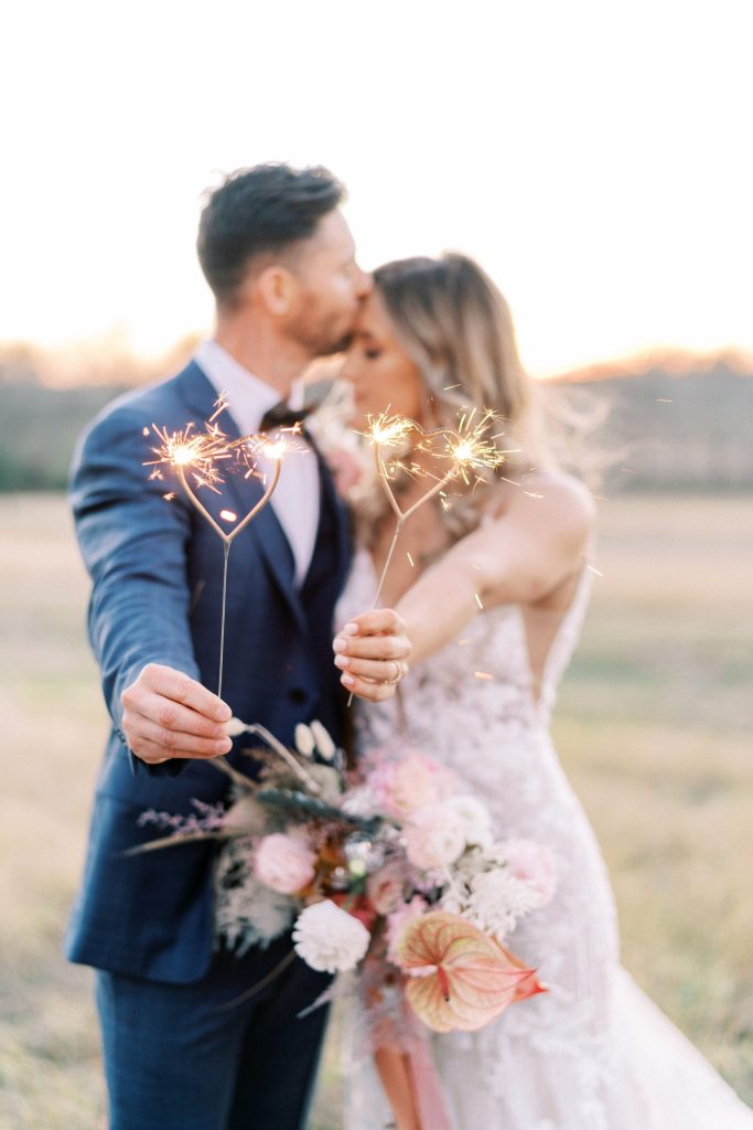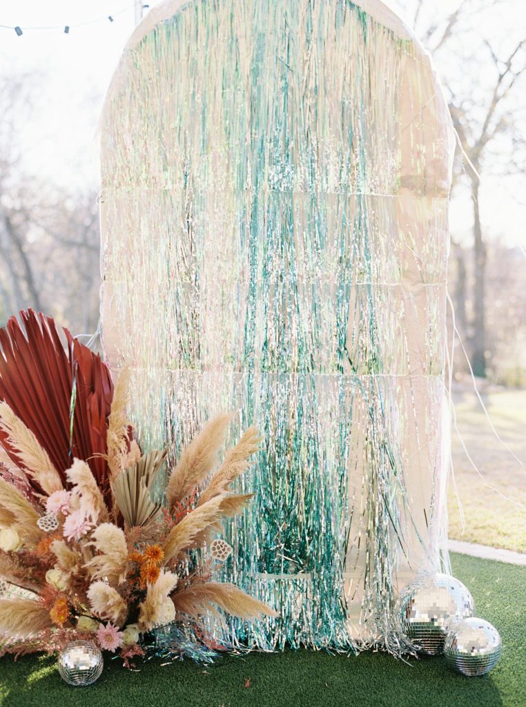 This modern whimsy wedding is decked out in the prettiest pastels, groovy disco details and eclectic dried florals – AKA our newest obsession! Bride Emily wanted a truly memorable celebration that combined her favorite things as well as let her personality shine through in it all, and she gives all the credit for her dream day coming to life to the planners of EPOCH CO+. Dripping in authenticity with every element, words like “unique, intimate, modern, whimsical and boho” were brought to life in the stunning modern barn setting of Arrowhead Hill. Shades of pink, terra cotta, blue and rust shine in the beautiful chapel space, where Emily and Travis held their intimate, Christ-centered celebration infront of a beauty of a ceremony backdrop of disco balls atop iridescent vinyl stands and dried florals. Following the ceremony, guests sipped cocktails on cozy lounges from Party Time Rentals underneath a gorgeous white tent and string lights overlooking the sunset glowing behind the rolling hills of Arrowhead Hill. While guests enjoyed all the reception festivities, the couple slipped away to take dreamy sunset portraits – and to say the least, we’re in complete awe! Emily looked beautiful in her bridal gown from Brickhouse Bridal with loose curls and soft makeup look from Etoilly Artistry. As the night came to an end, the couple exited through a tunnel of sparklers from Broadway Bridal – and as a special surprise for guests, an eruption of fireworks painted the night sky, leaving everyone completely speechless! Emily highly recommends kissing your new spouse under an explosive rainstorm of colorful lights and stars watching over you – the greatest way to start off married life together. Scroll to see all of the pastel and disco details of this modern whimsy wedding and to read about the bride’s fairy godmother of a wedding planner, EPOCH CO+. Cheers to The McKinneys!