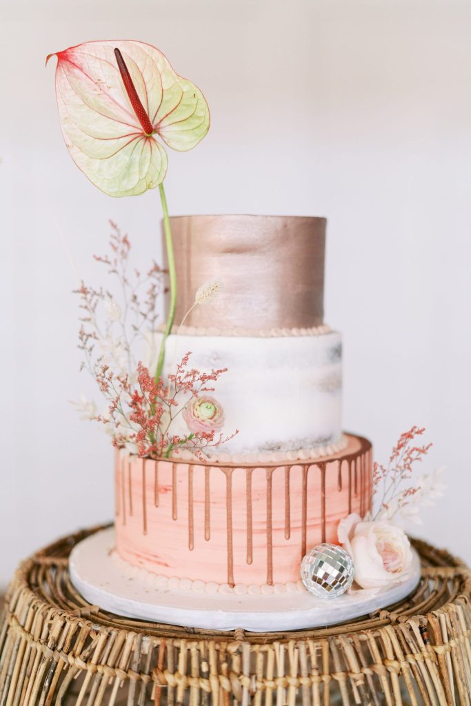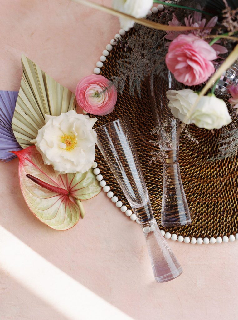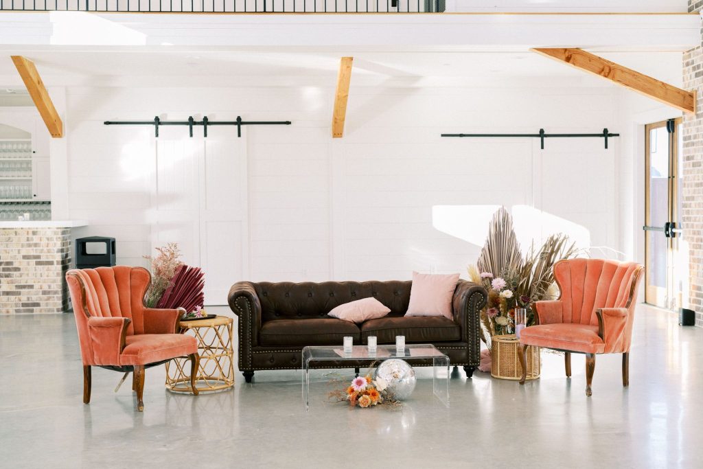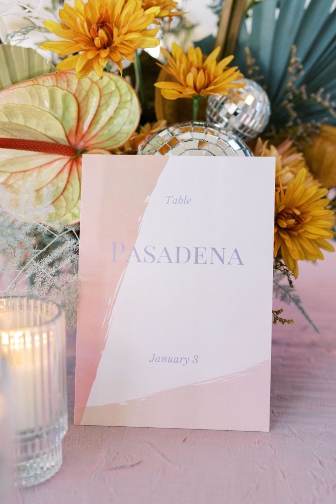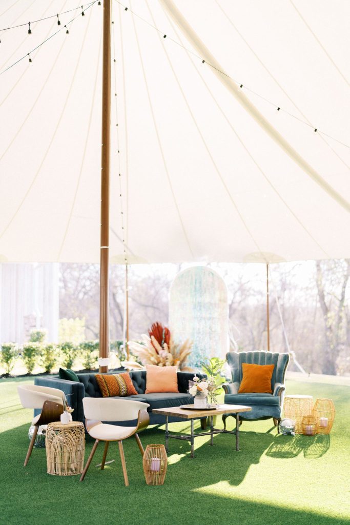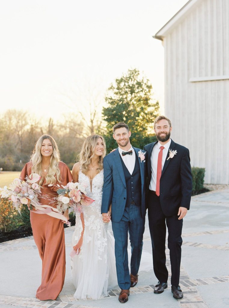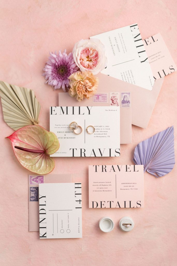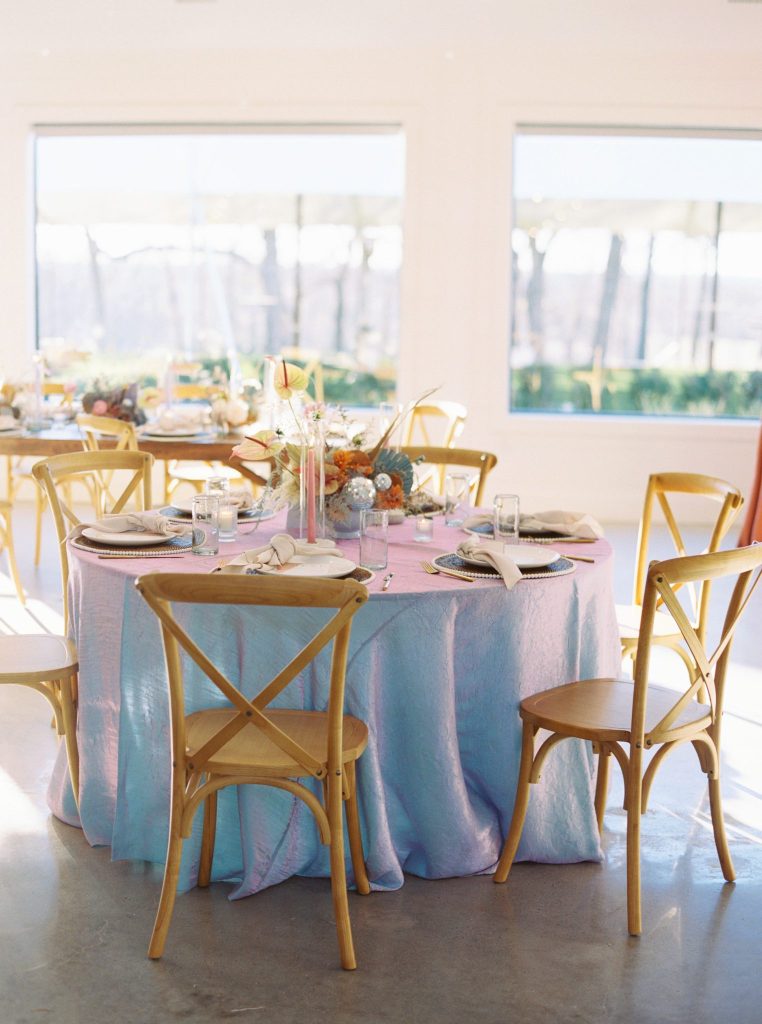 This modern whimsy wedding is decked out in the prettiest pastels, groovy disco details and eclectic dried florals – AKA our newest obsession! Bride Emily wanted a truly memorable celebration that combined her favorite things as well as let her personality shine through in it all, and she gives all the credit for her dream day coming to life to the planners of EPOCH CO+. Dripping in authenticity with every element, words like “unique, intimate, modern, whimsical and boho” were brought to life in the stunning modern barn setting of Arrowhead Hill. Shades of pink, terra cotta, blue and rust shine in the beautiful chapel space, where Emily and Travis held their intimate, Christ-centered celebration infront of a beauty of a ceremony backdrop of disco balls atop iridescent vinyl stands and dried florals. Following the ceremony, guests sipped cocktails on cozy lounges from Party Time Rentals underneath a gorgeous white tent and string lights overlooking the sunset glowing behind the rolling hills of Arrowhead Hill. While guests enjoyed all the reception festivities, the couple slipped away to take dreamy sunset portraits – and to say the least, we’re in complete awe! Emily looked beautiful in her bridal gown from Brickhouse Bridal with loose curls and soft makeup look from Etoilly Artistry. As the night came to an end, the couple exited through a tunnel of sparklers from Broadway Bridal – and as a special surprise for guests, an eruption of fireworks painted the night sky, leaving everyone completely speechless! Emily highly recommends kissing your new spouse under an explosive rainstorm of colorful lights and stars watching over you – the greatest way to start off married life together. Scroll to see all of the pastel and disco details of this modern whimsy wedding and to read about the bride’s fairy godmother of a wedding planner, EPOCH CO+. Cheers to The McKinneys!