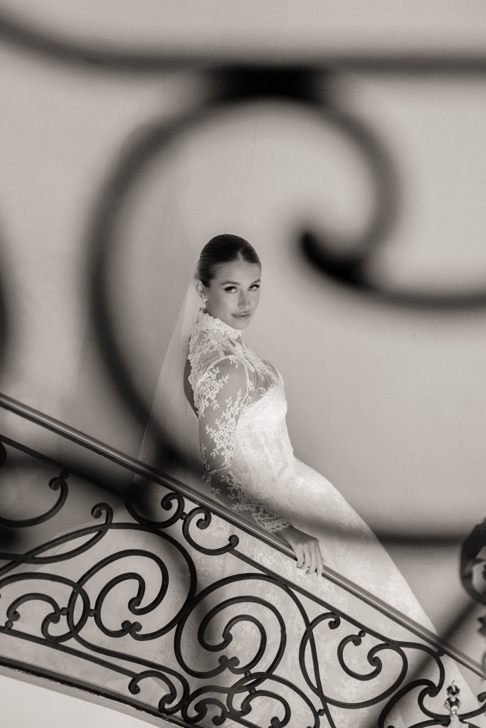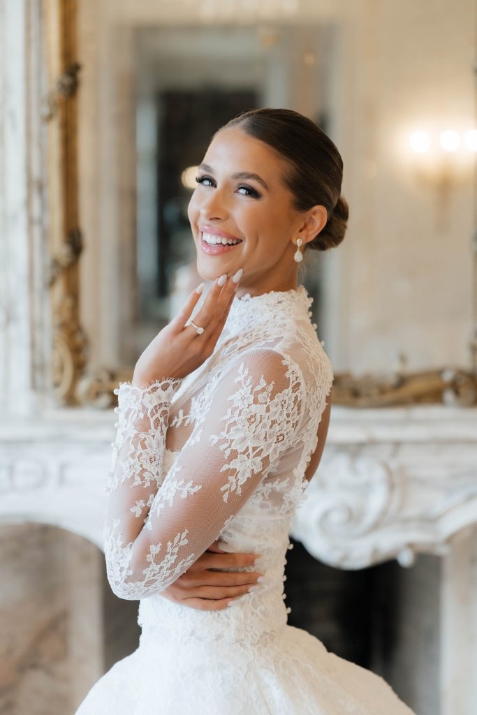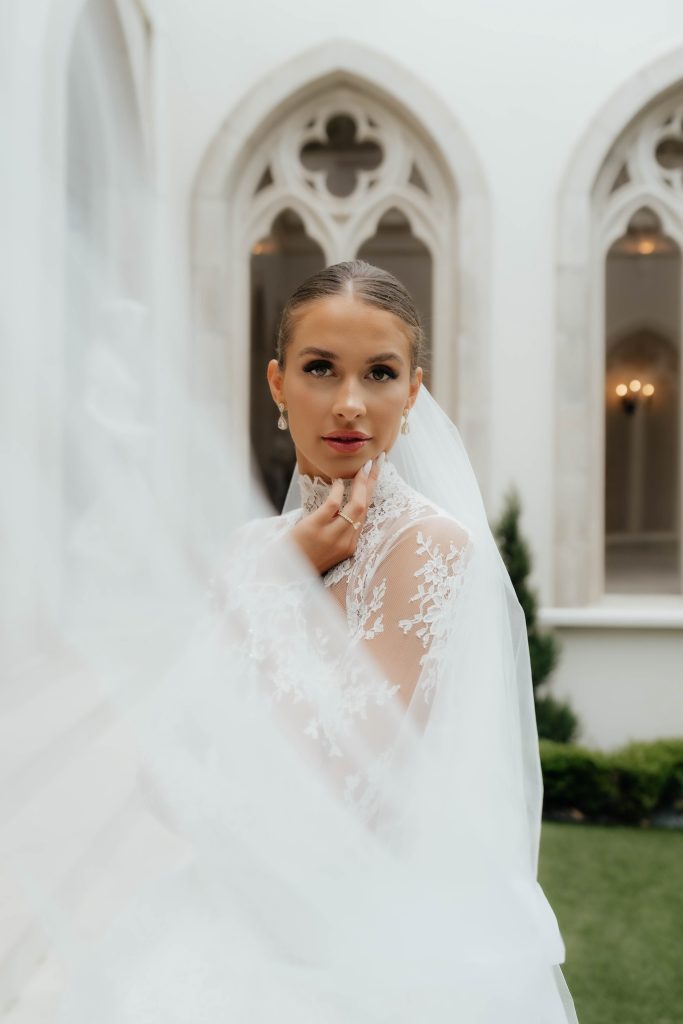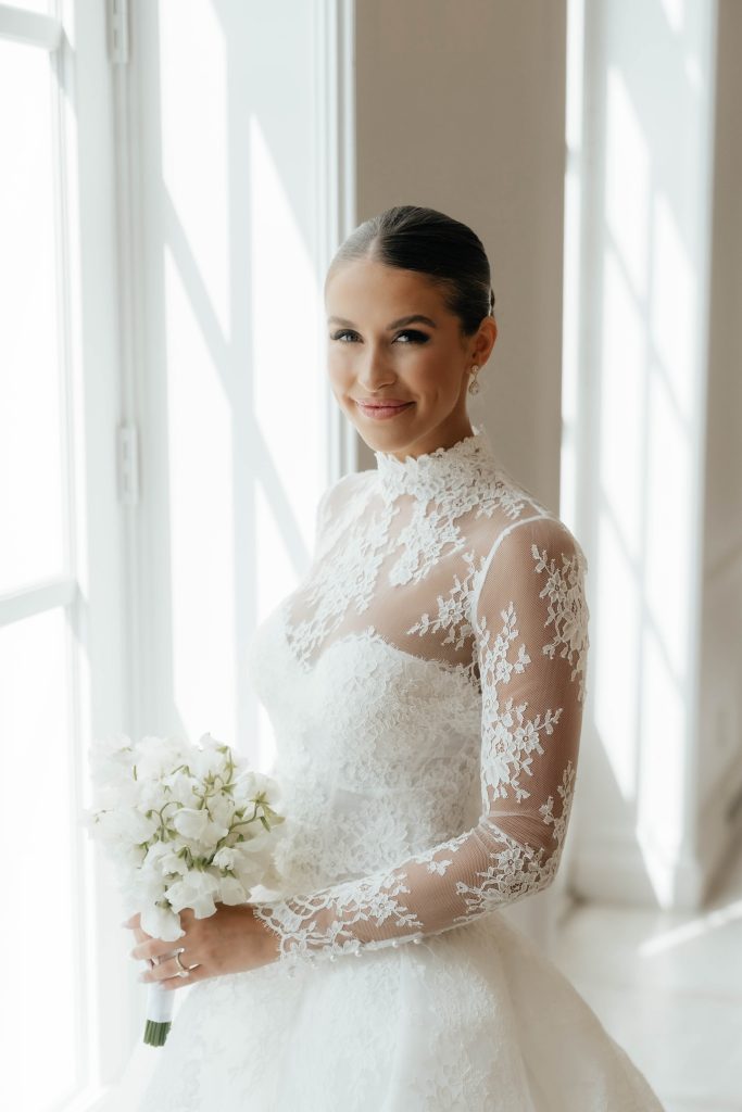 Molly’s bridal portraits at Chateau Nouvelle were the definition of timeless romance, captured with an editorial eye by Abigail Creamer Photography and enhanced by flawless beauty from Etoilly Artistry. Her Monique Lhuillier gown, complete with a delicate lace bolero and high-neck detailing, was the perfect finishing touch to her classic bridal look!