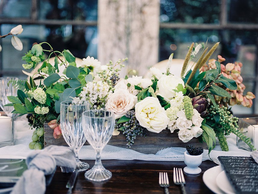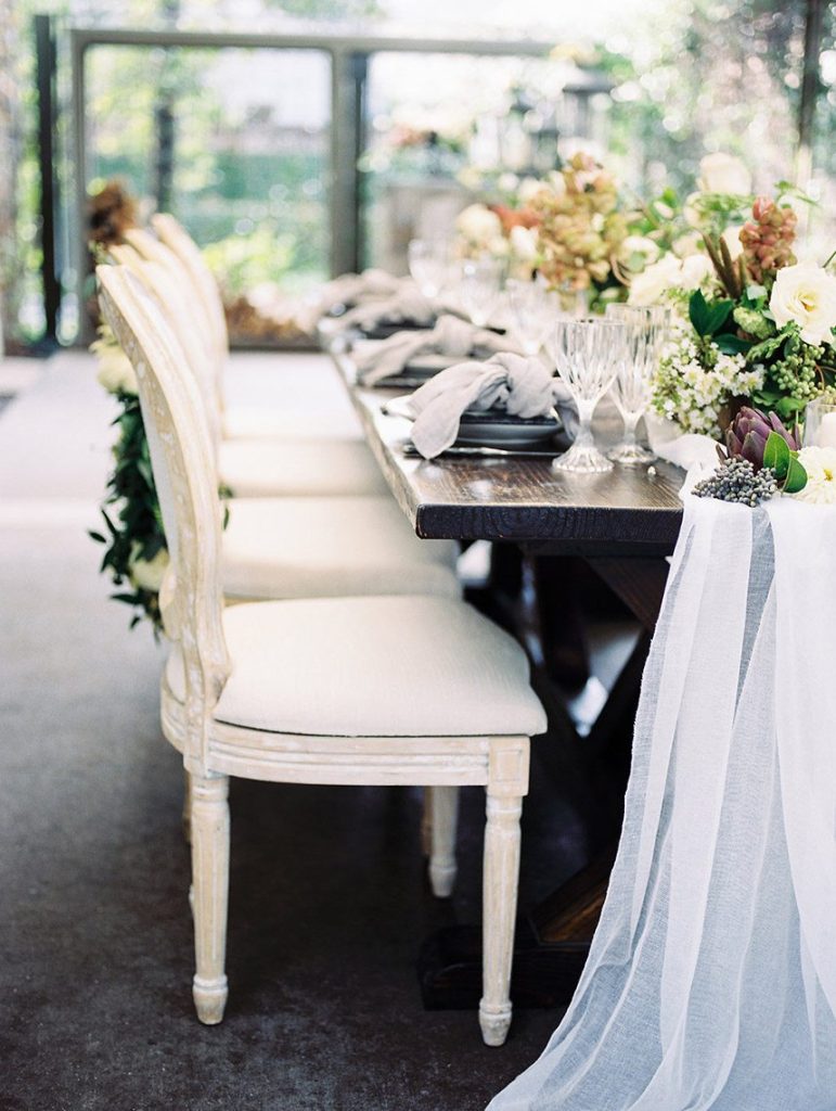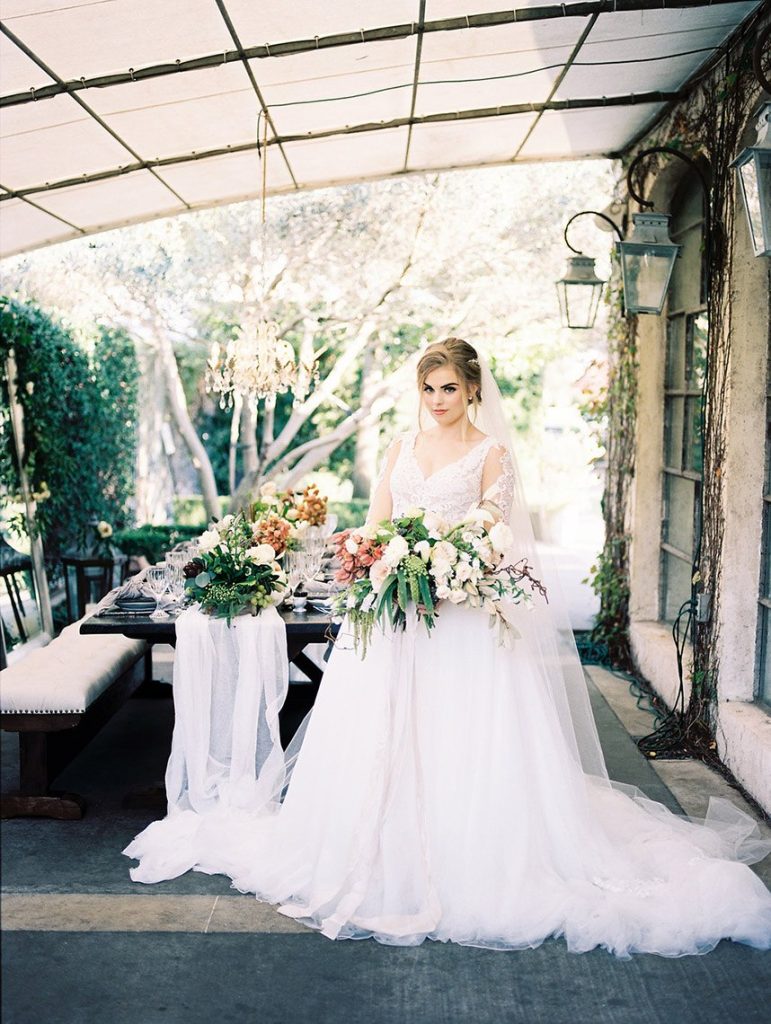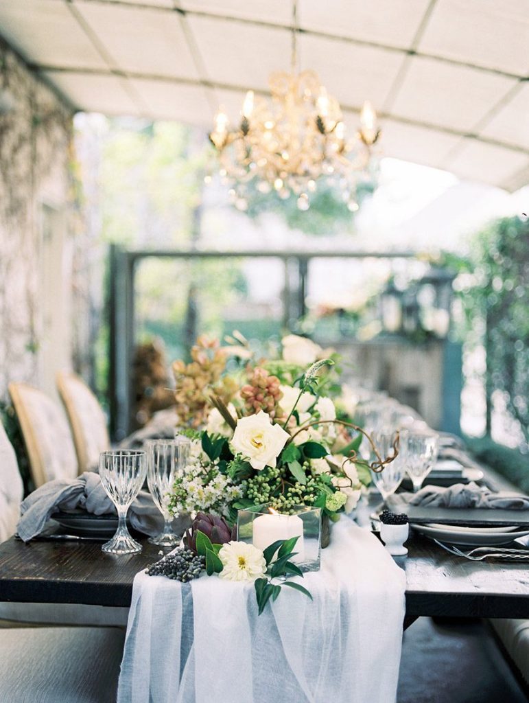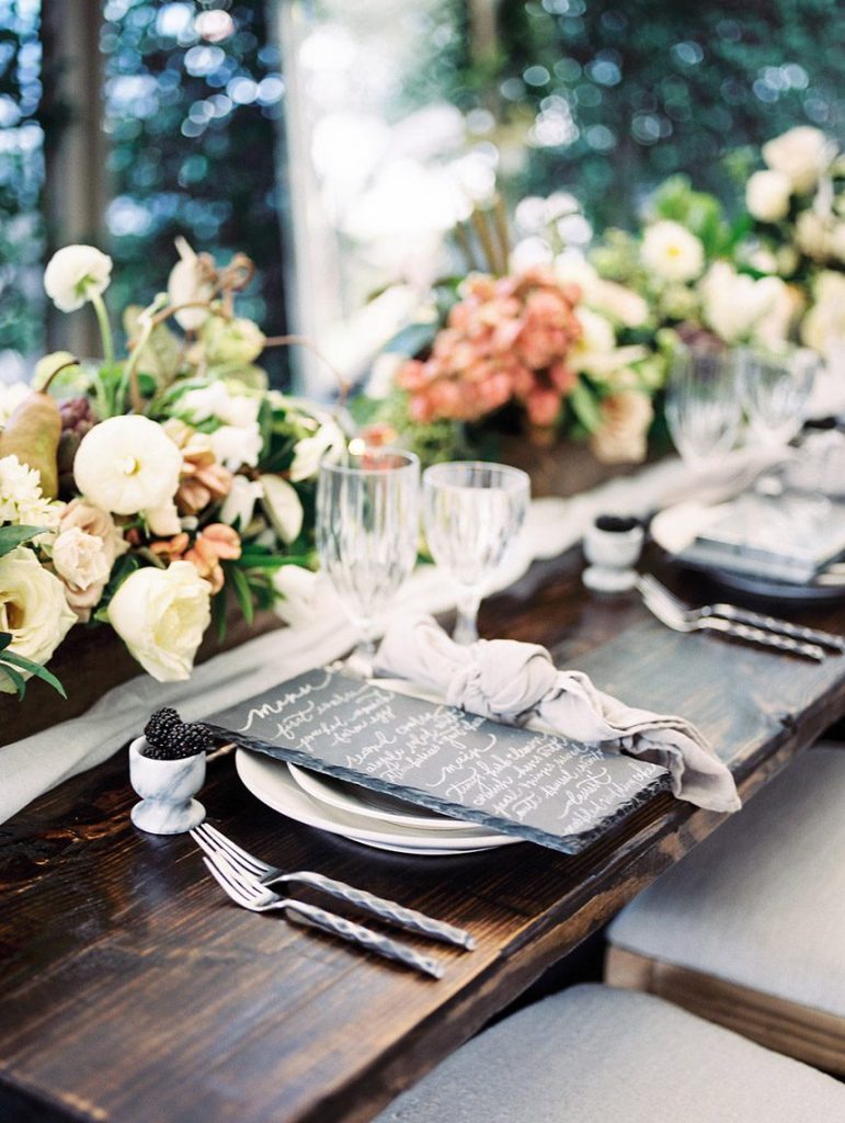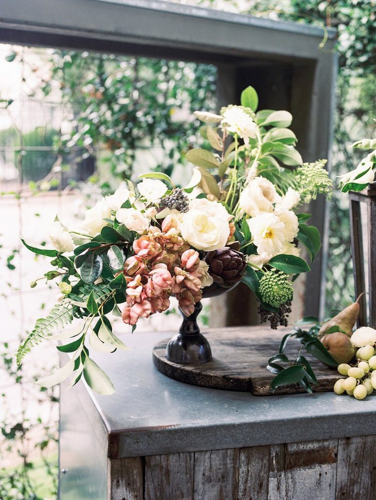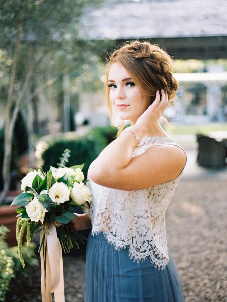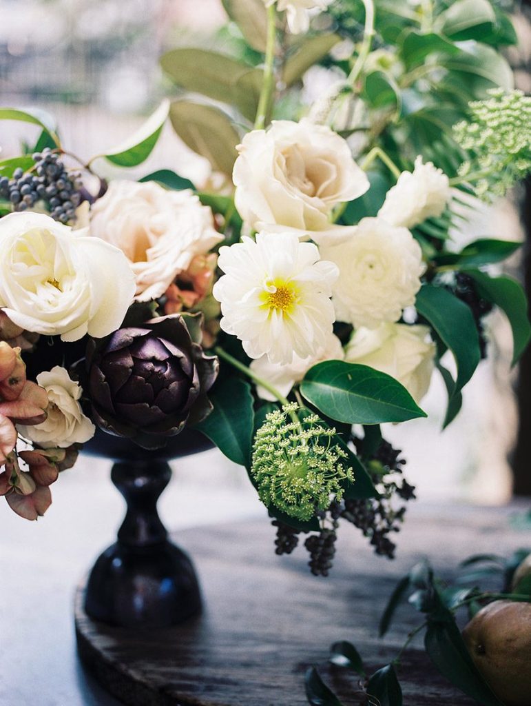 We’ve been dreaming about this moody garden styled shoot captured by Awake Photography since it landed in our inbox! Spell Events and their team set to work designing this floral-filled, al fresco scene at Tiny Boxwoods, and the end result was quite spectacular. Giving us farmer’s market vibes, Maxit Flower Design incorporated artichokes, blackberries, figs and pears into their all their arrangements from the stunning, freeform bridal bouquet in soft rose hues to the boxed tabletop centerpieces. Completing the place settings, A Fine Flourish created a non-traditional menu of slate and chalk lettering for the tiniest industrial flair that paired so well with the soft, ivory cheesecloth linens. Candlelight and the sparkling juxtaposed chandelier set the mood casting a soft glow across the tablescape. The model bride was stunning in her lace-bodice ballgown from Whittington Bridal, and her maids complemented in dusty-hued mismatched bridesmaid dresses from BHLDN. Each of these leading ladies had their own unique beauty look featuring braided styles and loosely swept up-dos styled by the Blush Worthy team. As the finishing touch, Buttercup Bakery wowed us all with dusty blue textured cake that’s almost too pretty to eat. Enjoy scrolling through this moody garden styled shoot, and be sure to pin your faves!