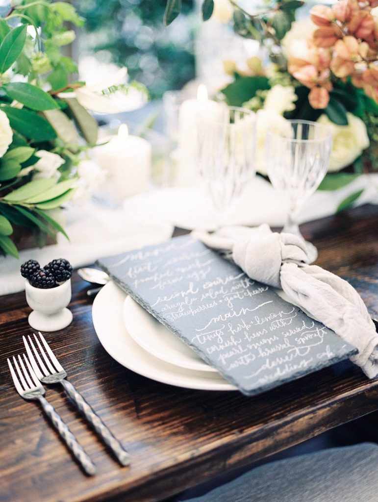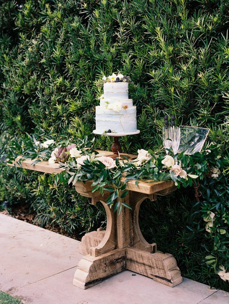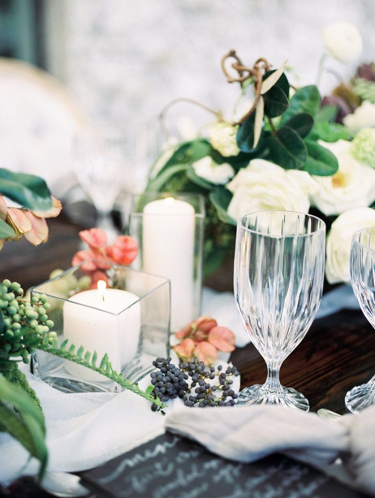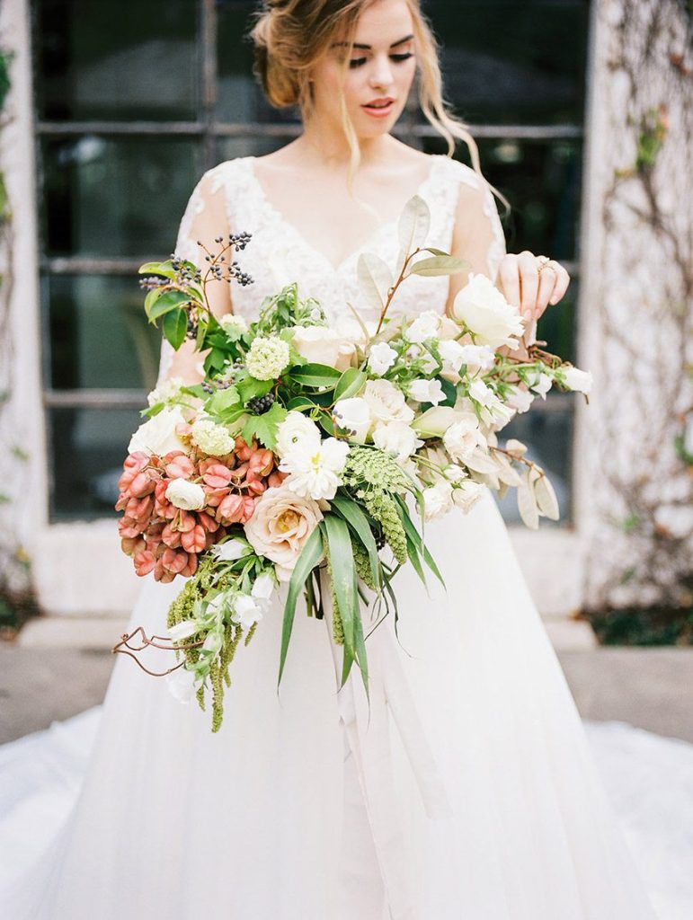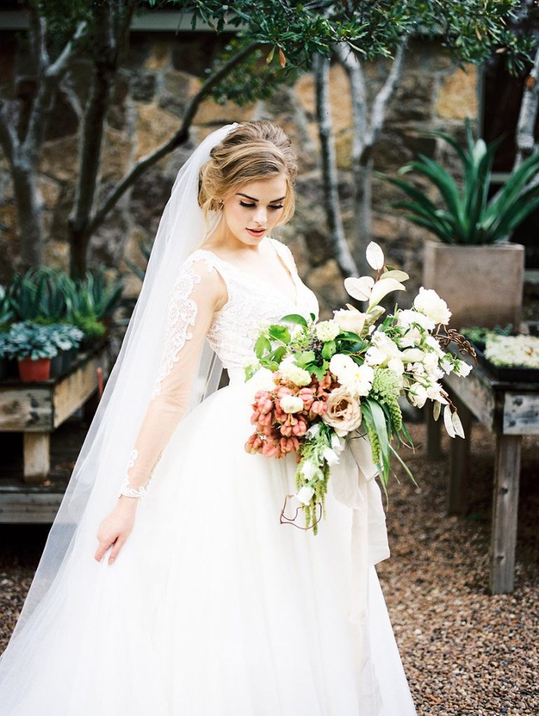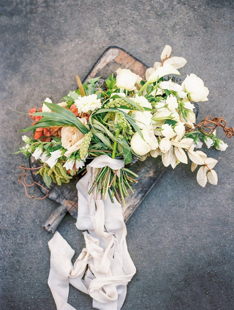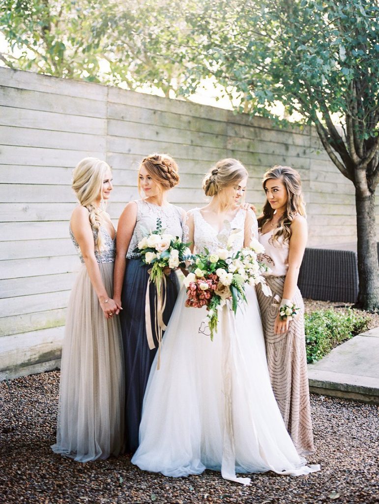 We’ve been dreaming about this moody garden styled shoot captured by Awake Photography since it landed in our inbox! Spell Events and their team set to work designing this floral-filled, al fresco scene at Tiny Boxwoods, and the end result was quite spectacular. Giving us farmer’s market vibes, Maxit Flower Design incorporated artichokes, blackberries, figs and pears into their all their arrangements from the stunning, freeform bridal bouquet in soft rose hues to the boxed tabletop centerpieces. Completing the place settings, A Fine Flourish created a non-traditional menu of slate and chalk lettering for the tiniest industrial flair that paired so well with the soft, ivory cheesecloth linens. Candlelight and the sparkling juxtaposed chandelier set the mood casting a soft glow across the tablescape. The model bride was stunning in her lace-bodice ballgown from Whittington Bridal, and her maids complemented in dusty-hued mismatched bridesmaid dresses from BHLDN. Each of these leading ladies had their own unique beauty look featuring braided styles and loosely swept up-dos styled by the Blush Worthy team. As the finishing touch, Buttercup Bakery wowed us all with dusty blue textured cake that’s almost too pretty to eat. Enjoy scrolling through this moody garden styled shoot, and be sure to pin your faves!