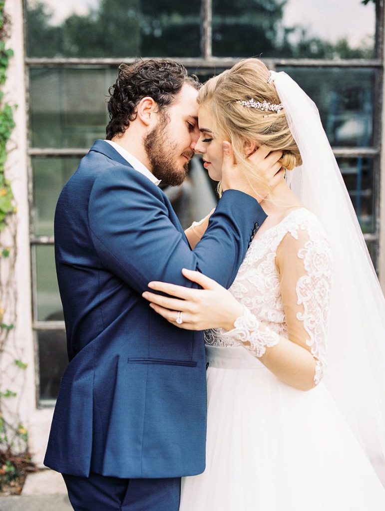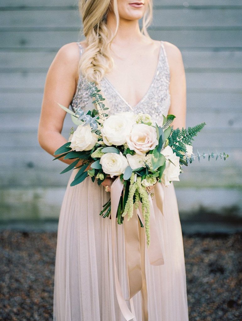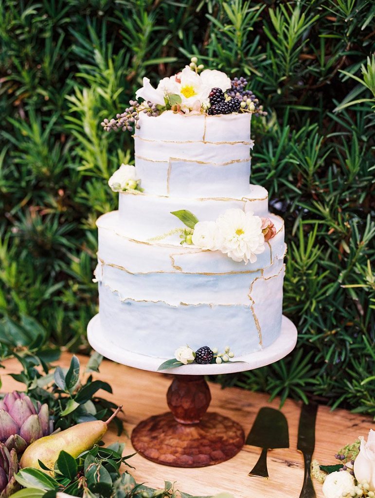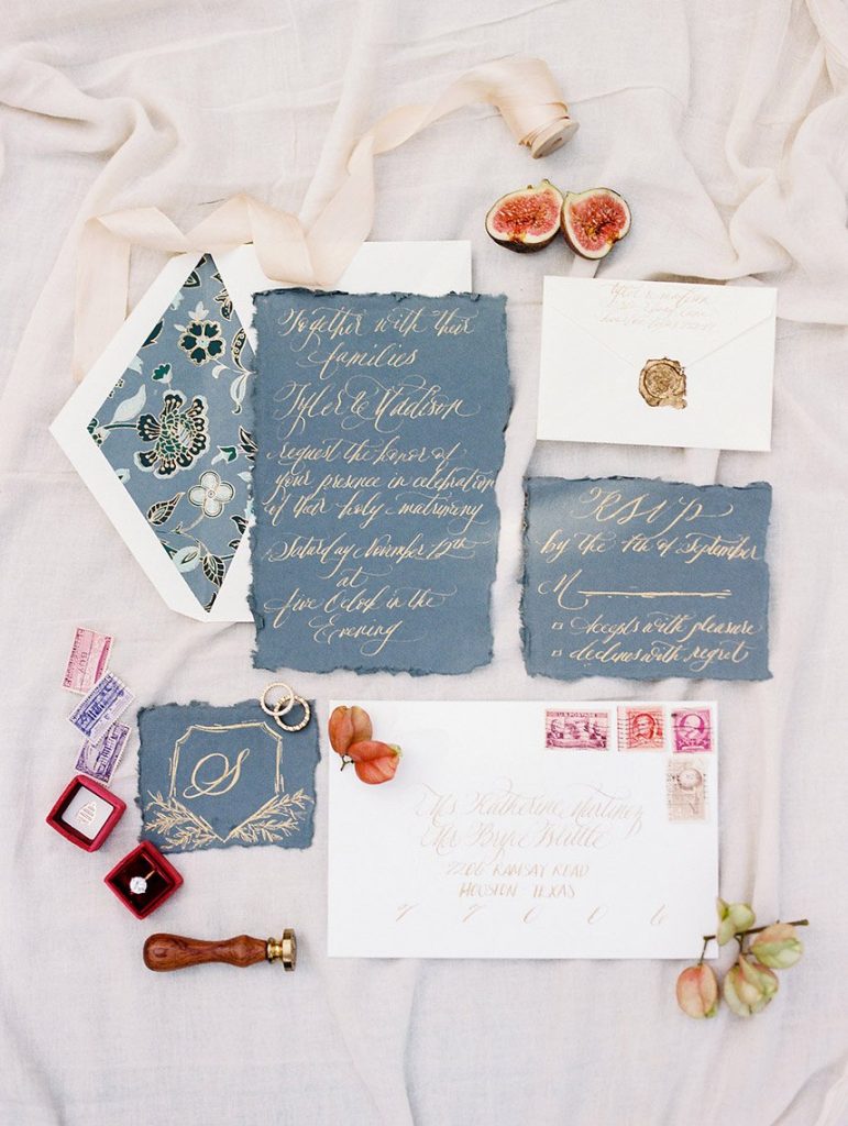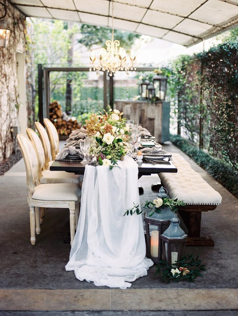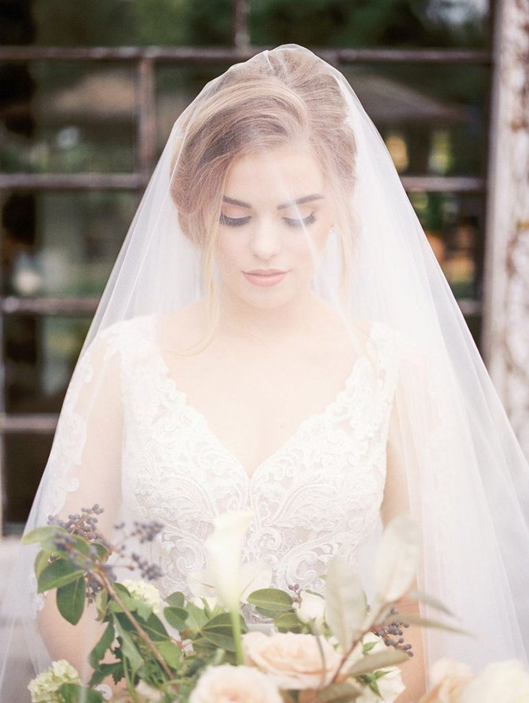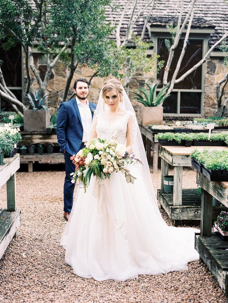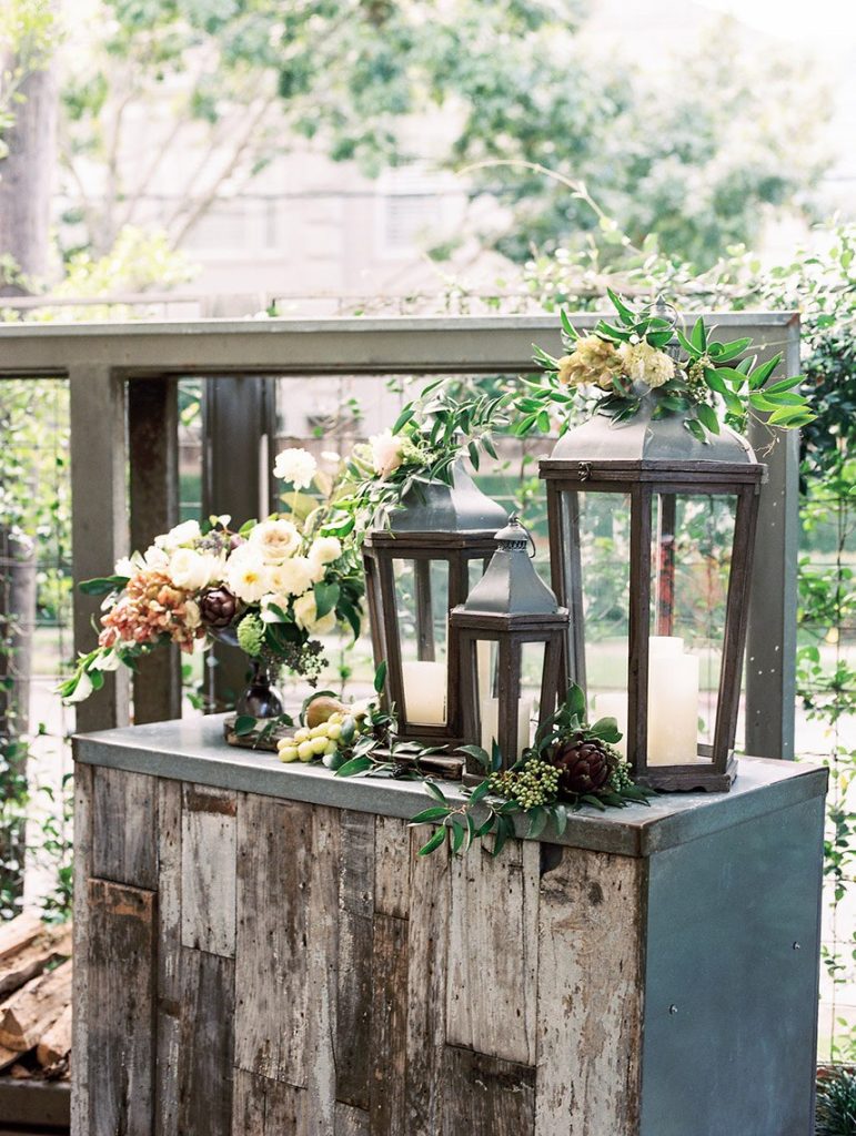 We’ve been dreaming about this moody garden styled shoot captured by Awake Photography since it landed in our inbox! Spell Events and their team set to work designing this floral-filled, al fresco scene at Tiny Boxwoods, and the end result was quite spectacular. Giving us farmer’s market vibes, Maxit Flower Design incorporated artichokes, blackberries, figs and pears into their all their arrangements from the stunning, freeform bridal bouquet in soft rose hues to the boxed tabletop centerpieces. Completing the place settings, A Fine Flourish created a non-traditional menu of slate and chalk lettering for the tiniest industrial flair that paired so well with the soft, ivory cheesecloth linens. Candlelight and the sparkling juxtaposed chandelier set the mood casting a soft glow across the tablescape. The model bride was stunning in her lace-bodice ballgown from Whittington Bridal, and her maids complemented in dusty-hued mismatched bridesmaid dresses from BHLDN. Each of these leading ladies had their own unique beauty look featuring braided styles and loosely swept up-dos styled by the Blush Worthy team. As the finishing touch, Buttercup Bakery wowed us all with dusty blue textured cake that’s almost too pretty to eat. Enjoy scrolling through this moody garden styled shoot, and be sure to pin your faves!