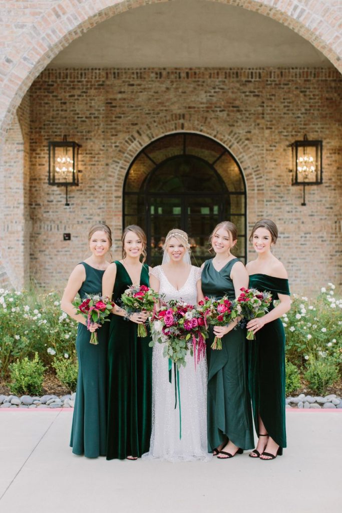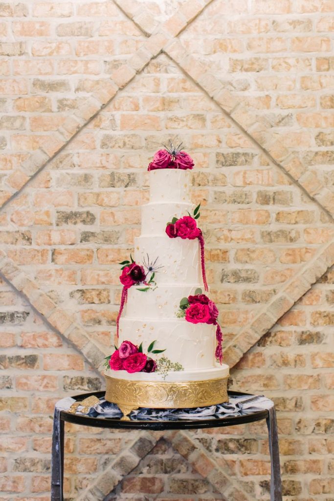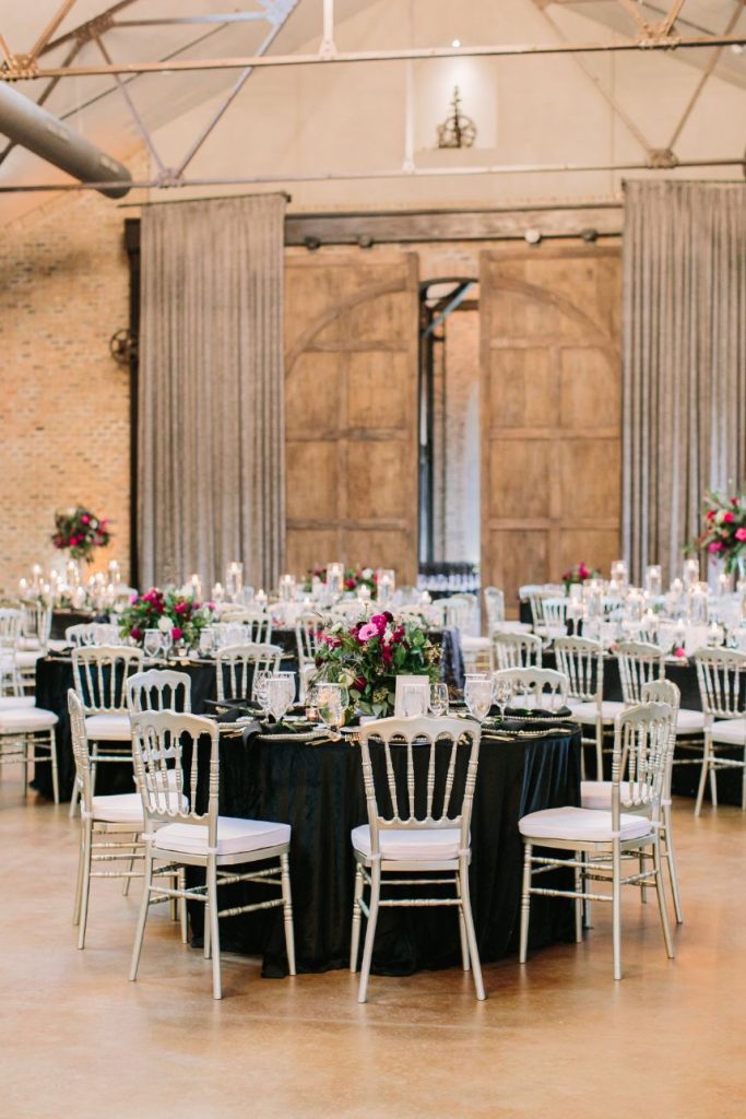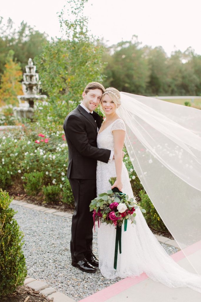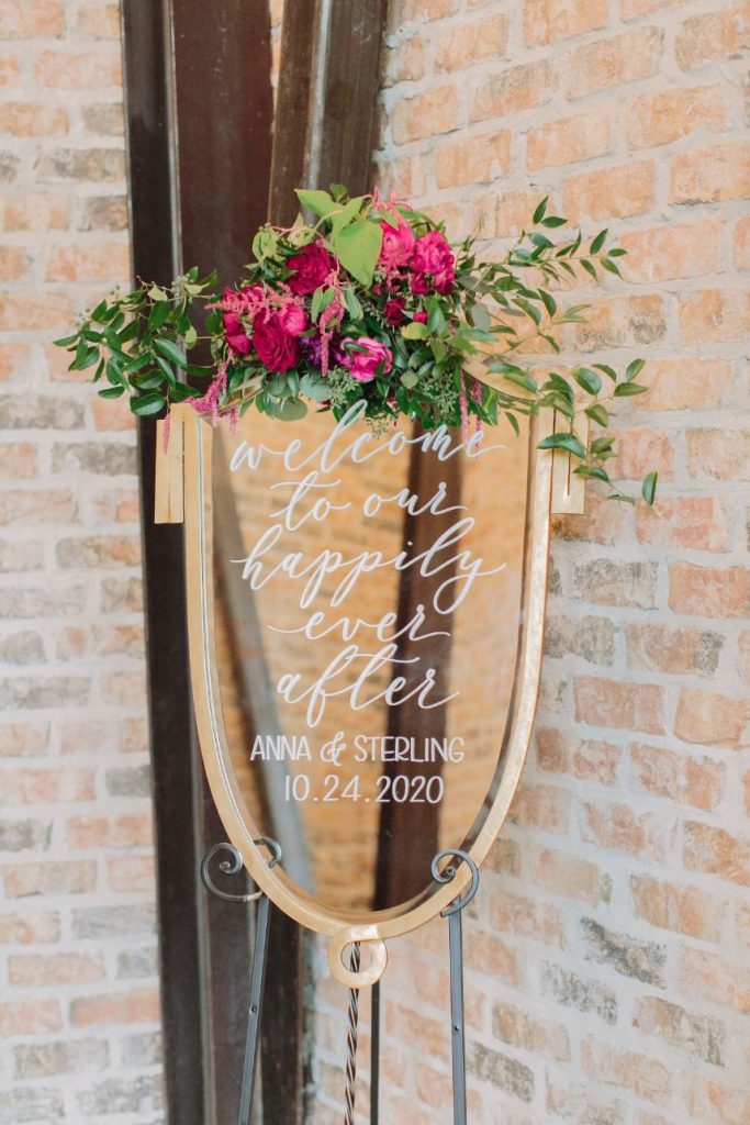 Talk about an elegant evening wedding full of moody romance! Anna and Sterling knew what they were doing when planning out the details of this opulent affair and it shows. Black sequin details, pops of fuchsia, dark emerald and more make every wedding scene so vivid and eye-catching! Love Birds & Co. provided some of the vintage rentals and décor around the venue and antique-inspired lounge setups, metallic reception chairs and so many more stick out among our favorite things in this wedding gallery. Anna looks absolutely radiant in her cap-sleeved gown, as well as opulent headpiece and dreamy walking-length veil – both accessories from Brickhouse Bridal. An updo was the perfect hairstyle choice for these and Hey Lovely styled Anna with a wispy ‘do and flawless bridal makeup. And finally, guests with sweet tooth probably counted down the seconds until the newlyweds would cut their five-tiered creamy white and gold-flecked cake design from Cakes by Gina, accented with fuchsia and burgundy blooms to tie the edible art in with the rest of the scene. By the looks of it, Anna and Sterling’s day was picture perfect all captured in colorful, romantic style by Mustard Seed Photography and encapsulated in their wedding highlight by Reverent Wedding Films so they can relive the day again and again. Read on for a note from the bride about one of her favorite wedding vendors and what made them so special. Cheers to Mr. and Mrs. Mulacek!