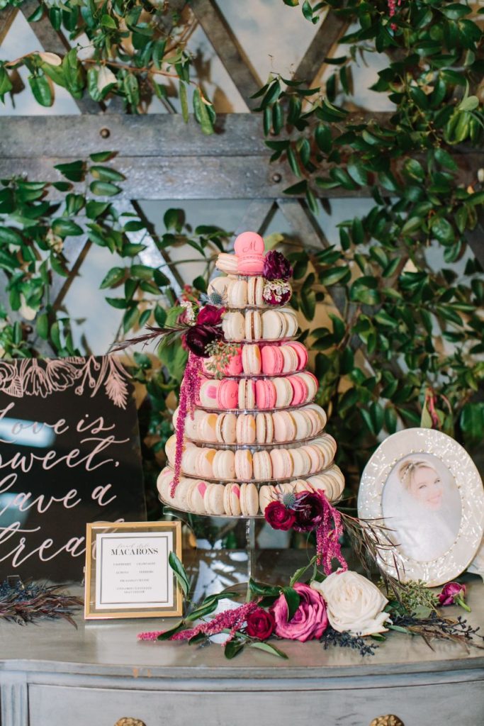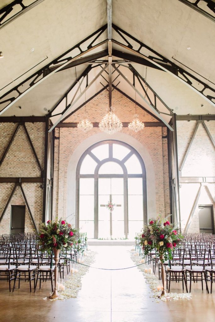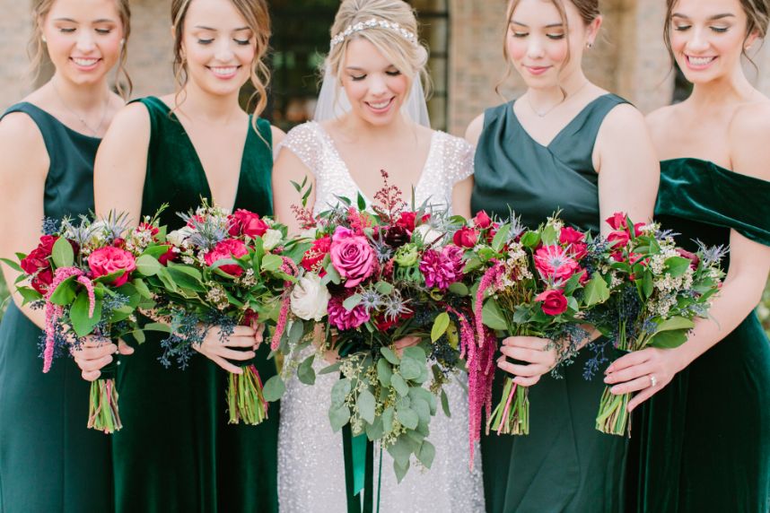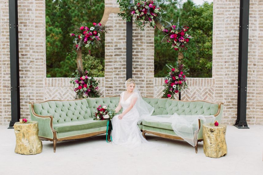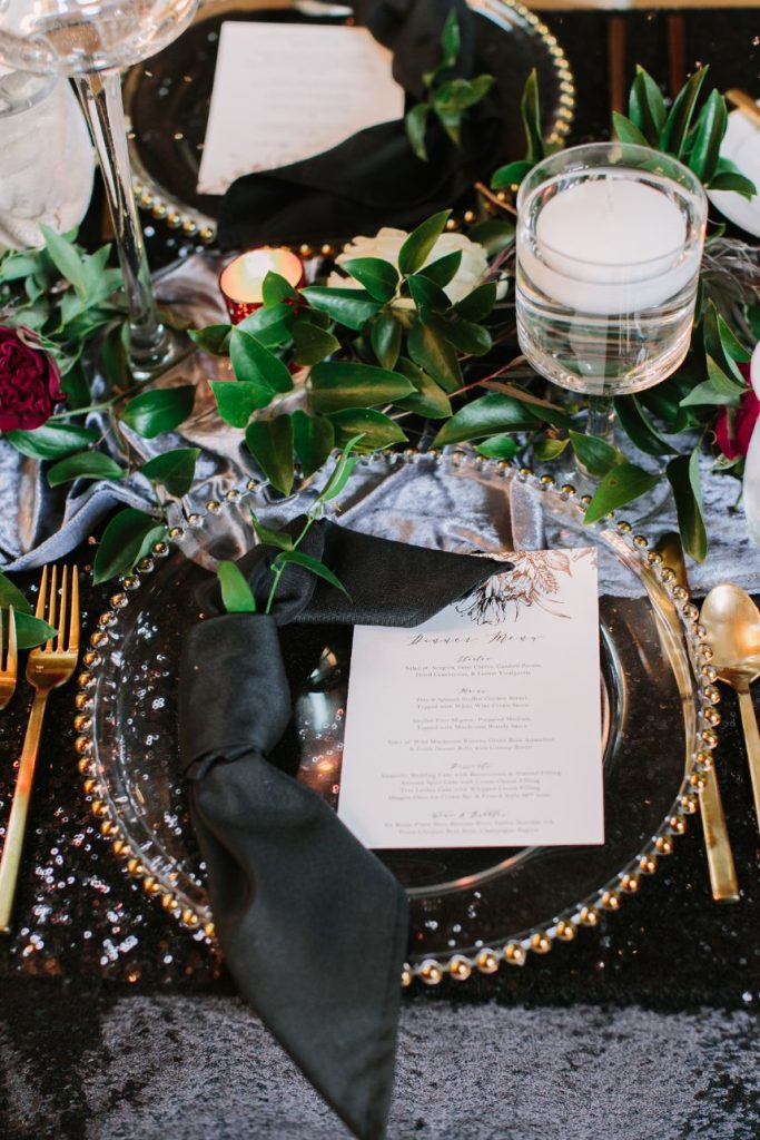 Talk about an elegant evening wedding full of moody romance! Anna and Sterling knew what they were doing when planning out the details of this opulent affair and it shows. Black sequin details, pops of fuchsia, dark emerald and more make every wedding scene so vivid and eye-catching! Love Birds & Co. provided some of the vintage rentals and décor around the venue and antique-inspired lounge setups, metallic reception chairs and so many more stick out among our favorite things in this wedding gallery. Anna looks absolutely radiant in her cap-sleeved gown, as well as opulent headpiece and dreamy walking-length veil – both accessories from Brickhouse Bridal. An updo was the perfect hairstyle choice for these and Hey Lovely styled Anna with a wispy ‘do and flawless bridal makeup. And finally, guests with sweet tooth probably counted down the seconds until the newlyweds would cut their five-tiered creamy white and gold-flecked cake design from Cakes by Gina, accented with fuchsia and burgundy blooms to tie the edible art in with the rest of the scene. By the looks of it, Anna and Sterling’s day was picture perfect all captured in colorful, romantic style by Mustard Seed Photography and encapsulated in their wedding highlight by Reverent Wedding Films so they can relive the day again and again. Read on for a note from the bride about one of her favorite wedding vendors and what made them so special. Cheers to Mr. and Mrs. Mulacek!