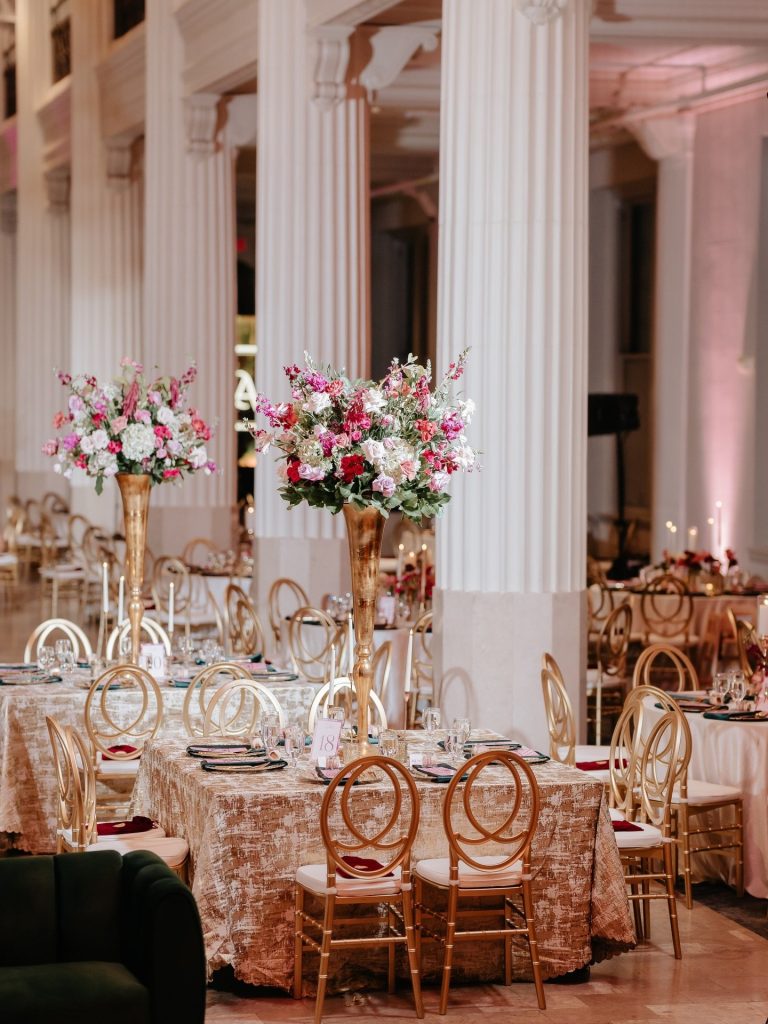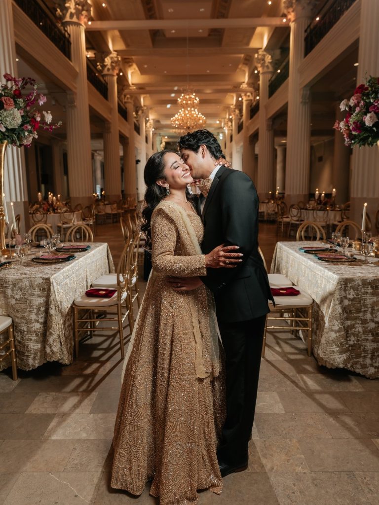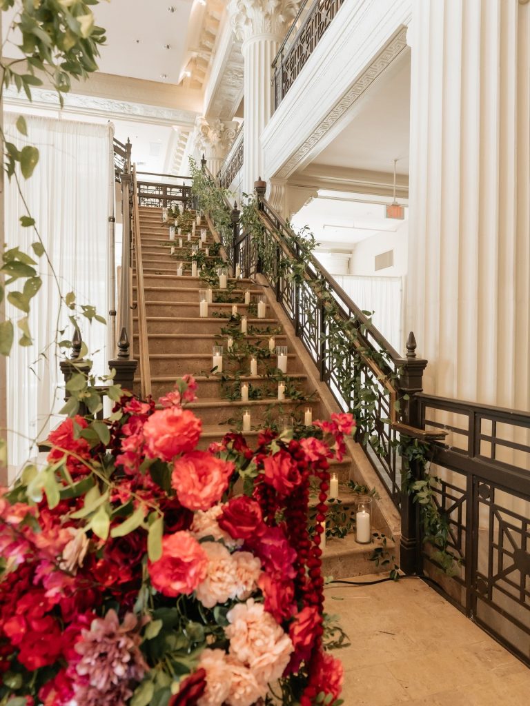 From the ceremony set against the incredible staircase to a reception filled with rich tones, candlelight, and grand floral installations, every moment reflected the intention behind bringing their cultures and traditions together.
