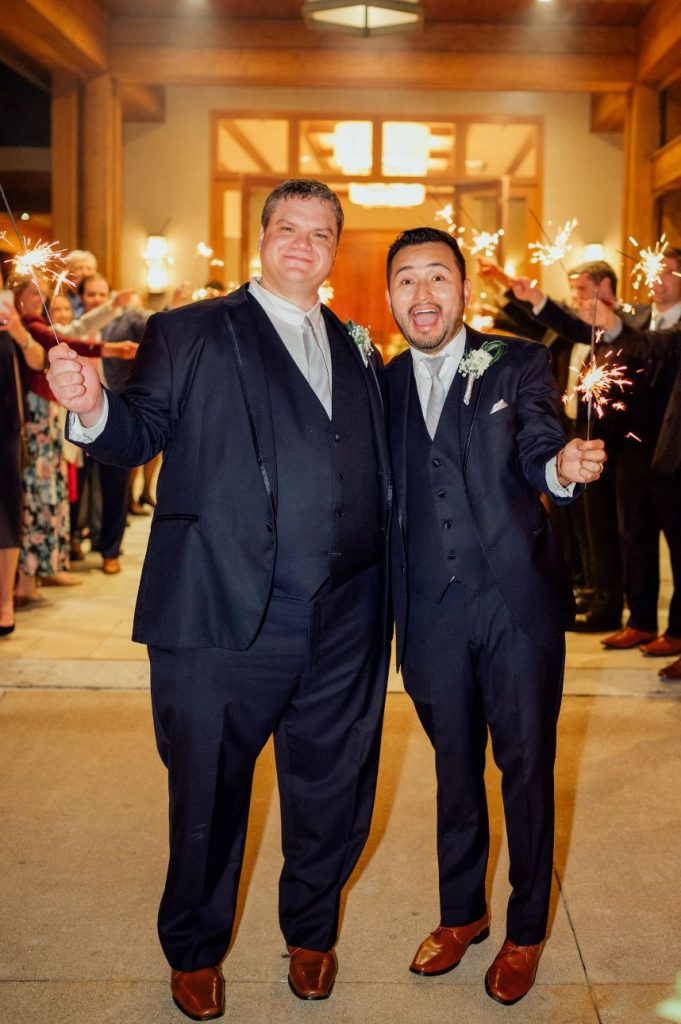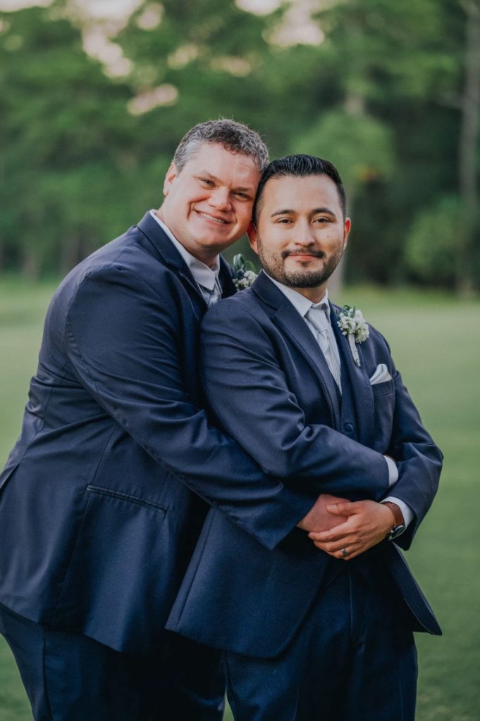 The navy blue accents give Obed and Stephen’s rustic wedding an elegant charm. The couple knew The Woodlands Country Club was their perfect venue after their first meeting. The gorgeous venue space that offered stunning golf course views created an elegant and unforgettable reception space for the two. In addition, the venue offers an outdoor ceremony space where Obed and Stephen said their “I dos.” Stephen’s favorite moment of the day was seeing his handsome groom Obed walk down the aisle in tears with his sister. How sweet is that! Following the ceremony, the couple and guests proceeded inside for the reception. Inside, EB Inc. Event Rentals provided elegant decor, while Double Oak Events brought the lighting and entertainment. After Obed’s emotional brother-sister dance in memory of their mom, the couple hit the dance floor to celebrate their love. Keep scrolling to see more gorgeous images captured below.