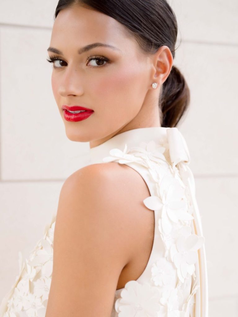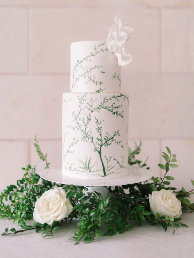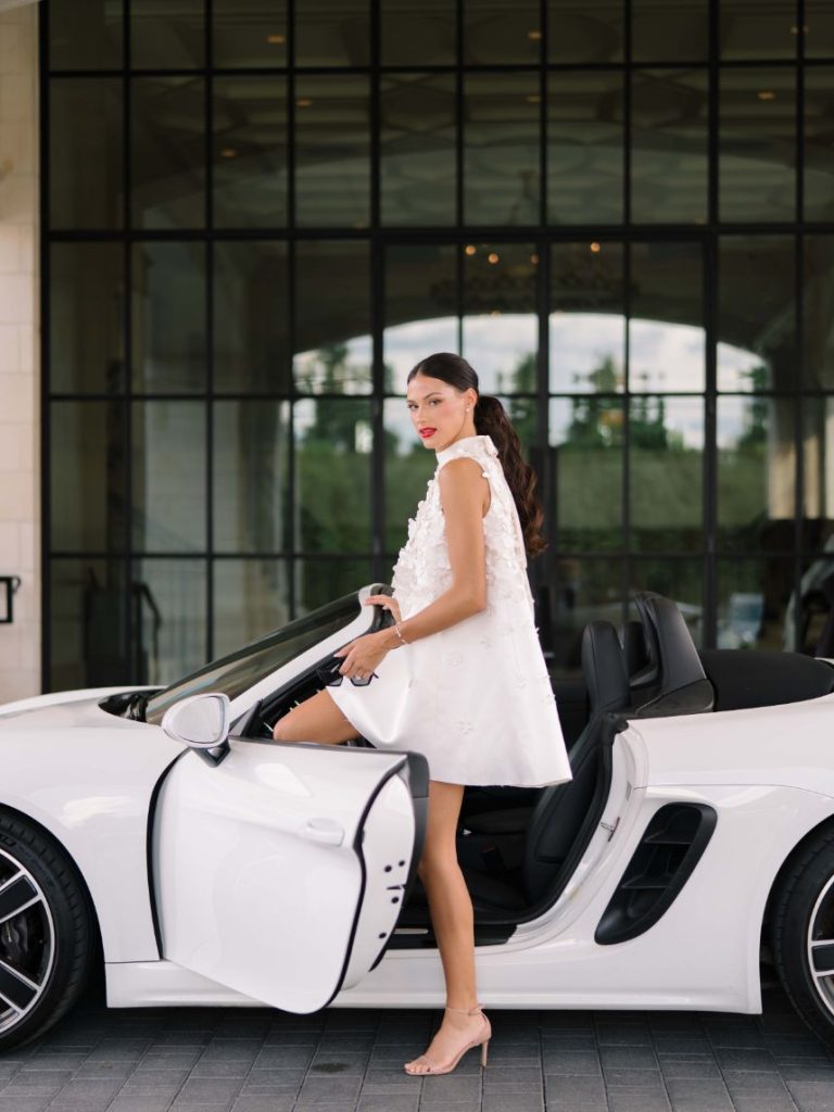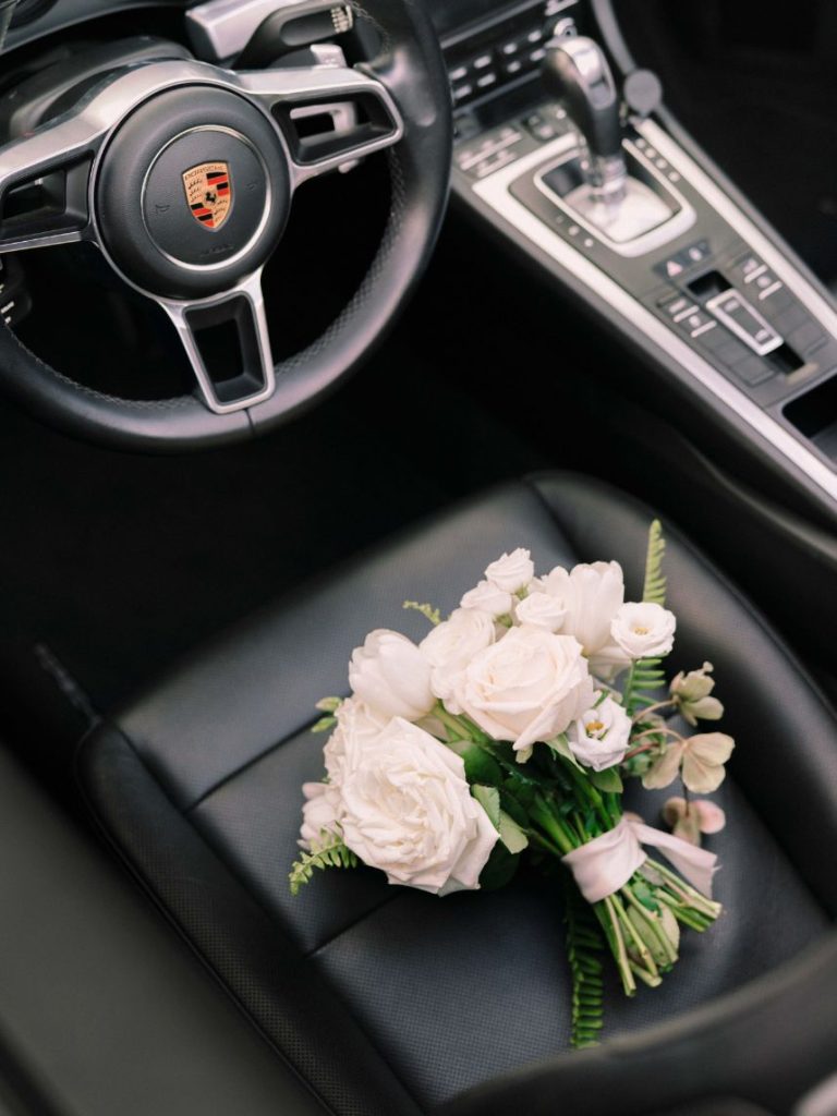 In organic, gardenesque scenes, this country club wedding inspiration captured by Stephania Campos Photography is turned on a luxurious head with a bridal wardrobe and makeup change, plus a getaway sports car in the form of a Porsche! Relaxed yet refined patio dining would make the perfect setup for a brunch wedding reception as cheery bright blooms and greenery set the tone for a romantic, modern morning. The same ivy-inspired designs made their way onto white fondant decorating a modern, two-tiered cake. We love the trend of changing your ensemble halfway through the day and this bride models two chic wedding looks – one, a long flowing gown with lace accents and the other, a high-neck short gown with 3-D floral appliqué details. Both were stunning with her flawless bridal makeup and wedding day hair that went from glam waves to a power pony with the blink of an eye! Her lip was updated to a bold red which paired perfectly with the sunnies she sported as she made her grand exit from this luxe country club wedding inspiration. Find even more to fall in love with down below. Cheers!
