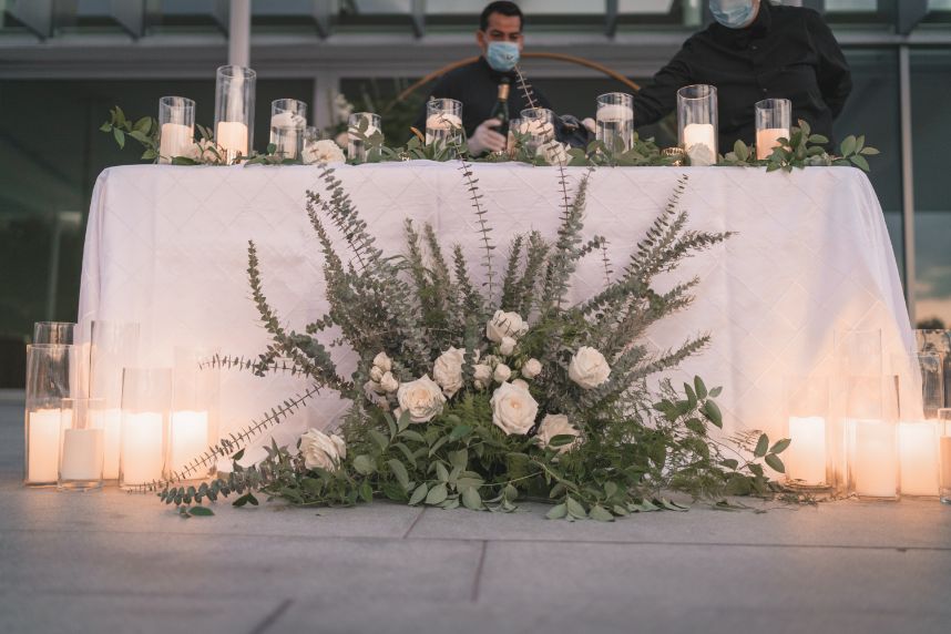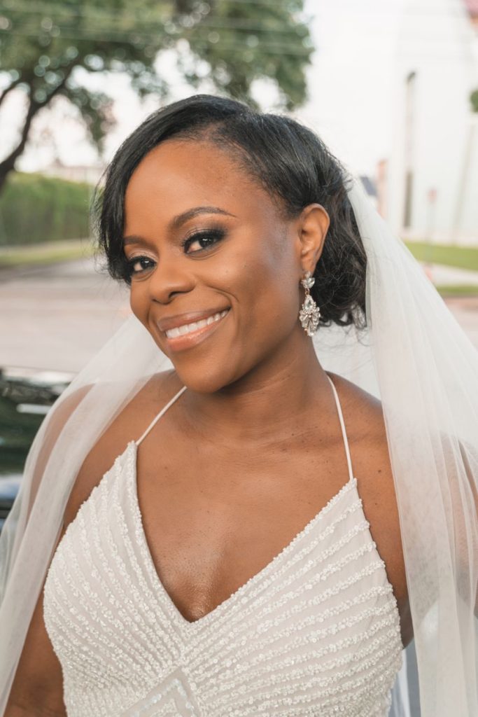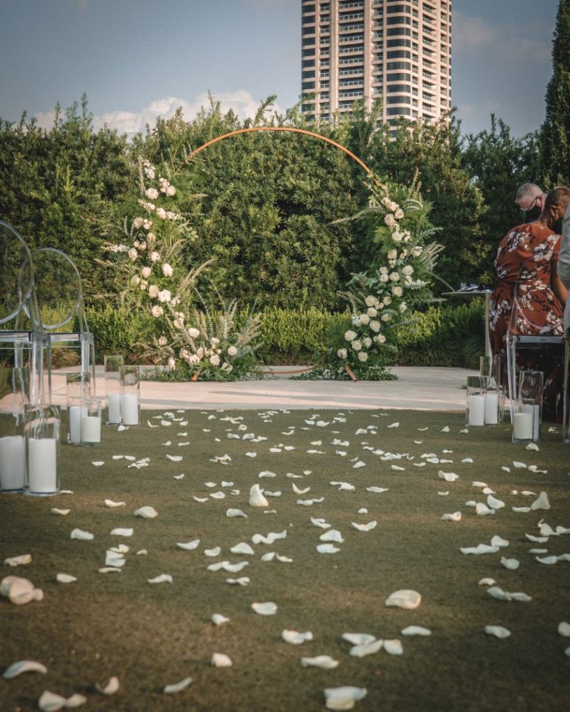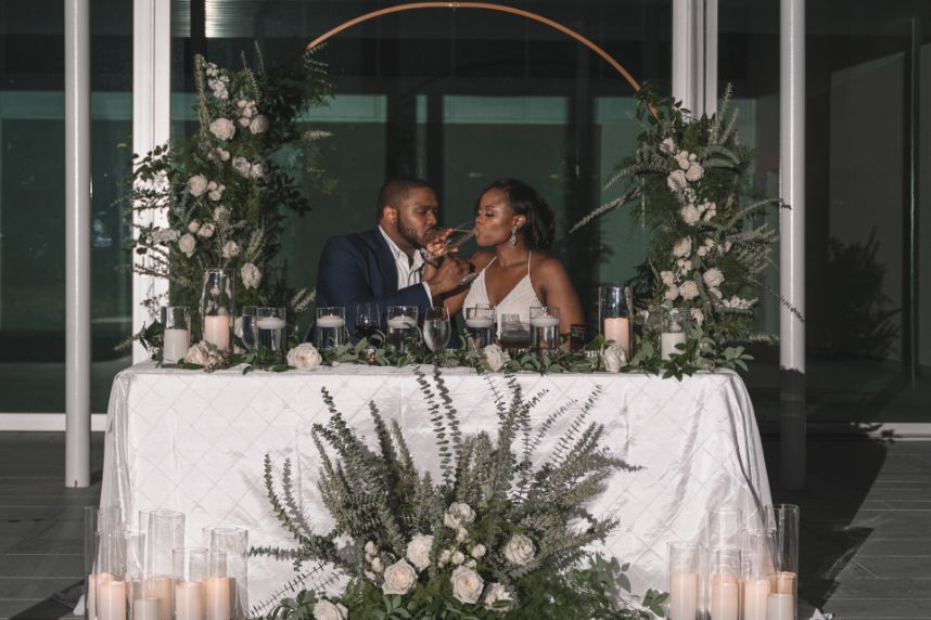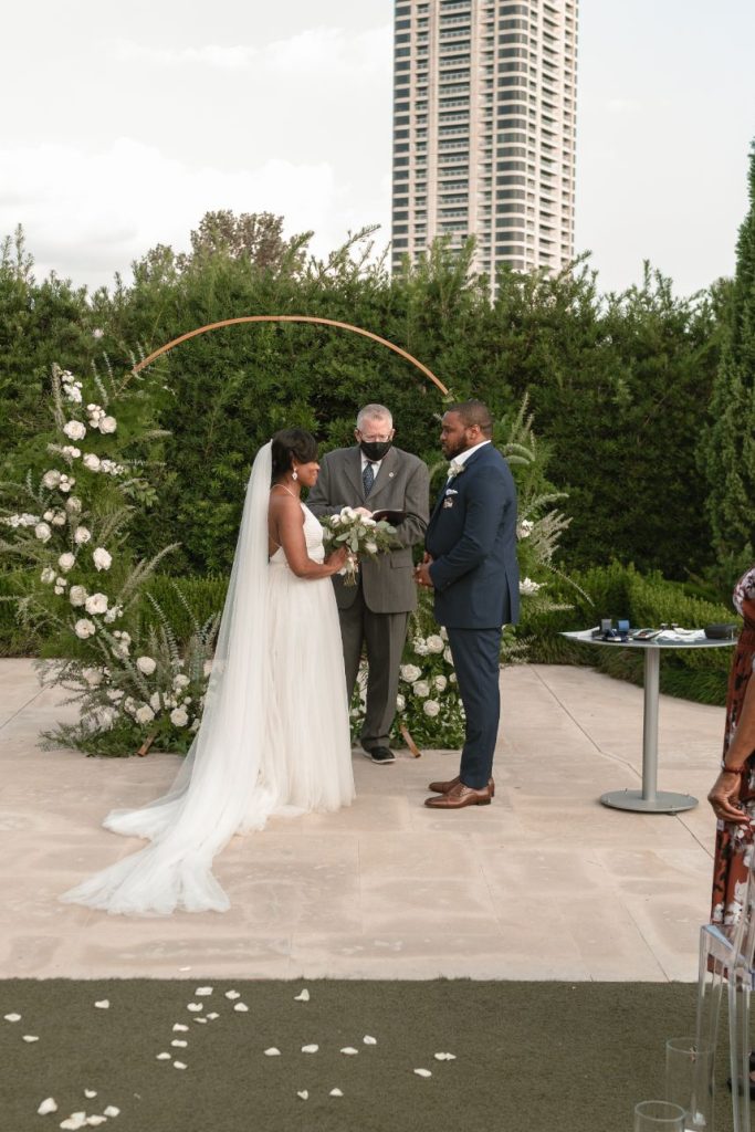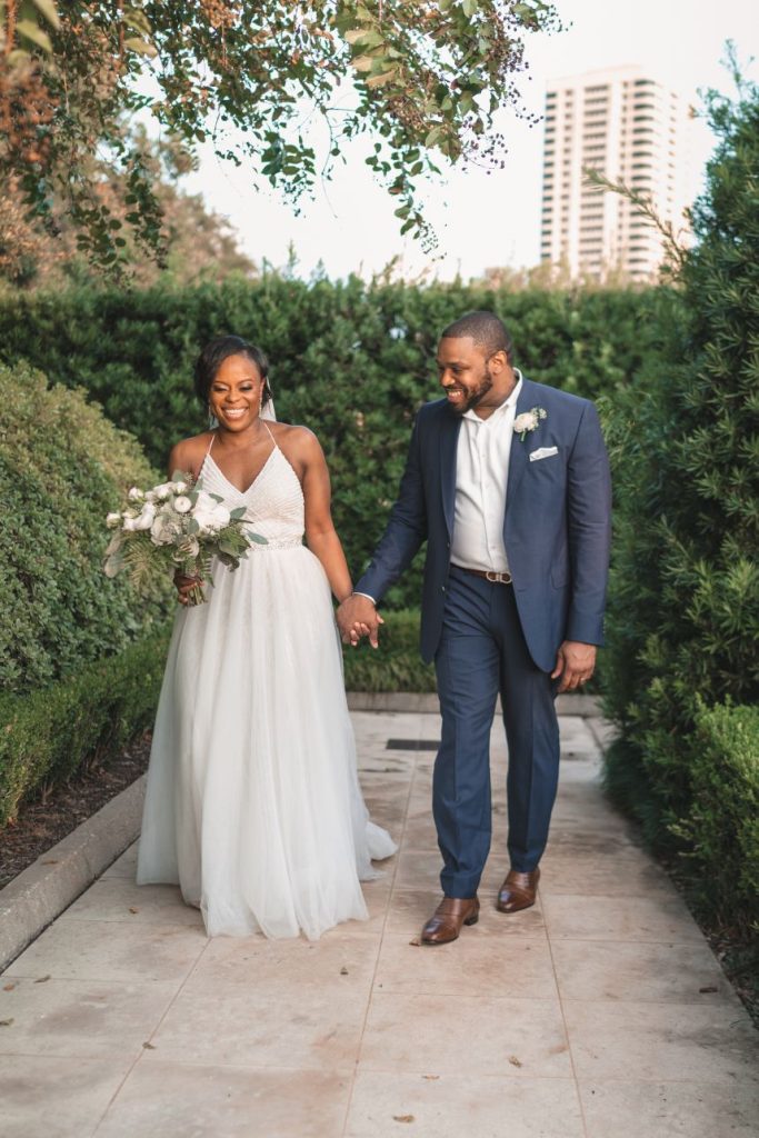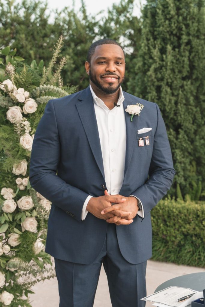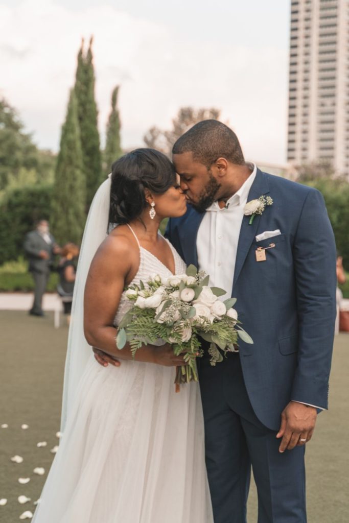 Ini and Samuel’s organic white wedding filled with greenery is to-die-for. With the help of Lillie Jane Designs, this couple had the outdoor ceremony of their dreams. And thanks to Sabrina Lee, this couple got to keep calm even while wedding planning amid a pandemic! White roses paved the way for this beauty of a bride as she met her soon-to-be husband down the aisle. Ini wore a stunning A-line gown with embedded beads and a sheer veil, while Samuel sported a navy suit. A gold circular altar with a floral embrace gave this organic ceremony a romantic touch. Guests sat in acrylic chairs with a range of different height candles. After the ceremony, everyone enjoyed catering and bartending from A Fare Extraordinaire! For more on this organic white covid wedding, check out the gallery below. Also, be sure to read the quote from the bride on her dream wedding maker. Cheers to Mr. and Mrs. Samuel Thomas!