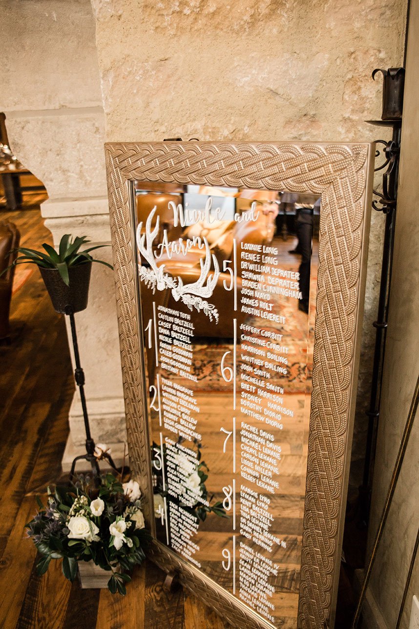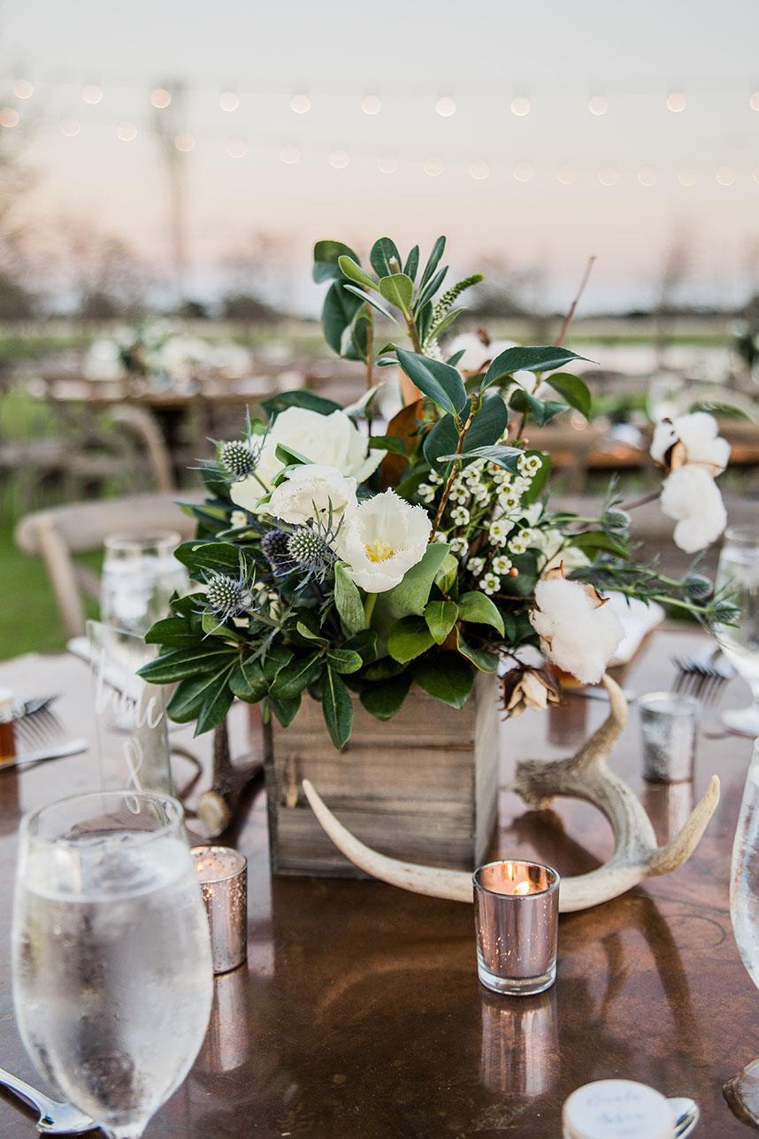 “To tie in the groom’s love of hunting, the families horns from their personal collection were added to each centerpiece.”