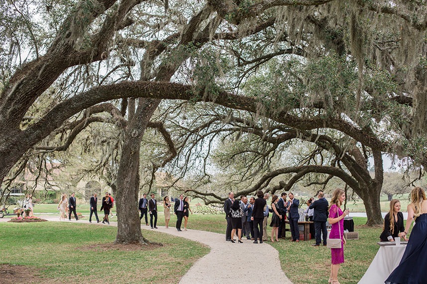 “The couple wanted the party to begin the moment their guests stepped foot on property. Guests were treated to champagne underneath 100 year old oak trees before the ceremony.”